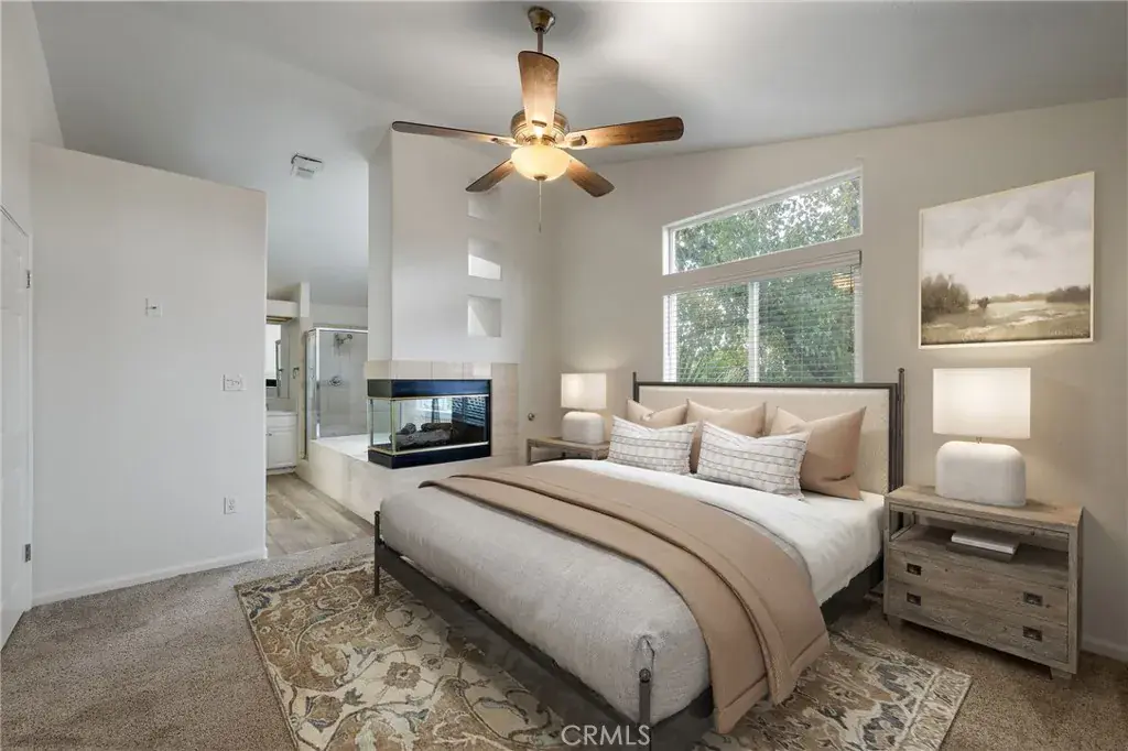 Beautifully updated 4-bedroom, 3-bath home with soaring ceilings, wood-look flooring, and an easy-flow layout. The formal living room features a cozy fireplace, while the open family room offers a second fireplace and a fun wet bar perfectly positioned to serve snacks, sips, and smooth access to the kitchen. The bright kitchen includes white cabinetry, quartz counters, and a large breakfast bar. A convenient downstairs bedroom sits next to a bath, ideal for guests or multigenerational living. Upstairs, the spacious primary suite boasts a dual-sided fireplace shared with the spa-like bath, complete with soaking tub, separate shower, and dual sinks. The backyard features an outdoor built-in grill, plus a pergola-style patio equipped with a ceiling fan—perfect for shaded lounging or outdoor dining and mature trees add privacy. A 3-car garage completes this move-in-ready home located in the desirable Stockdale High School district and close to popular restaurants and conveniences.