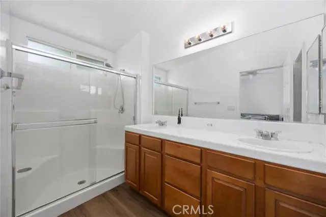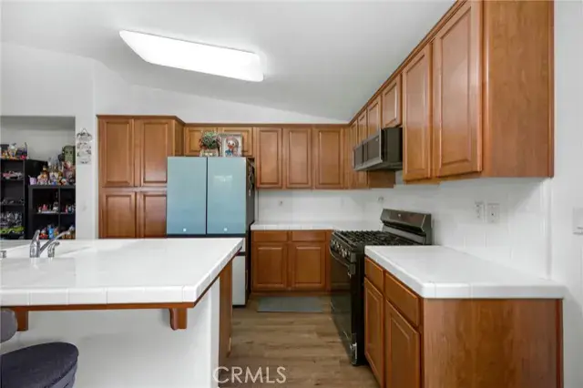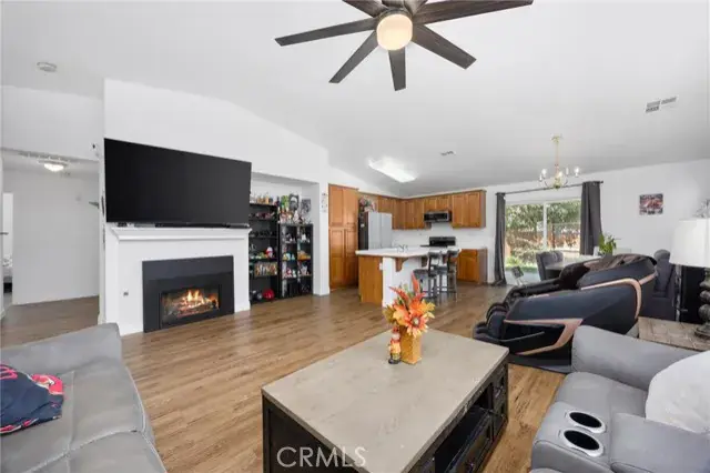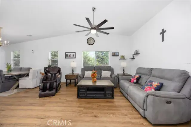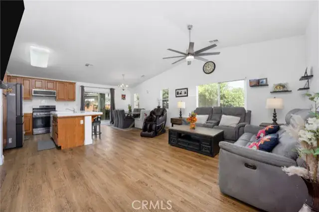 Welcome to this beautifully maintained home in the desirable Seven Oaks Place community. Designed with vaulted ceilings, wood-look flooring, and an open layout, this home offers style and comfort. The spacious living room with fireplace flows into the kitchen featuring rich cabinetry, breakfast bar, and stainless appliances. A bright dining area opens to the backyard for easy entertaining. The front bedroom is en suite with its own bathroom—perfect for guests or multi-generational living. With a prime location in Seven Oaks Place near shopping, dining, and top schools, this move-in ready home delivers comfort and convenience.