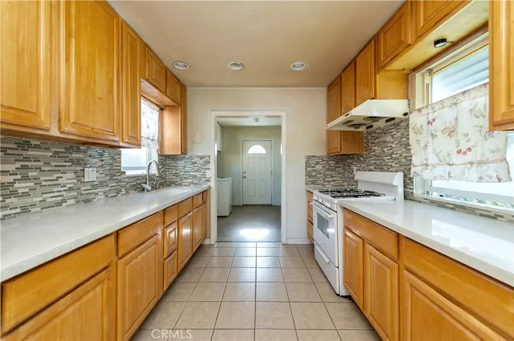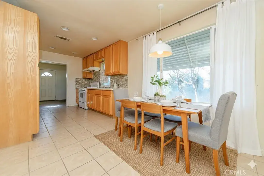 The kitchen is gently updated kitchen with quartz countertops. and equipped with wood cabinetry for daily functionality. There is a dedicated dining area, making it easy to enjoy daily meals or host small gatherings. An adjacent laundry area provides direct access to a covered patio, allowing for seamless indoor-outdoor use. This patio offers flexible space that can be arranged to fit your lifestyle needs, whether for exercise, relaxing, or additional seating. Moving toward the rear of the home, you’ll find three bedrooms and 1.5 bathrooms arranged for functional daily use. One of the bedroom has a sliding door to offer direct access to the backyard.