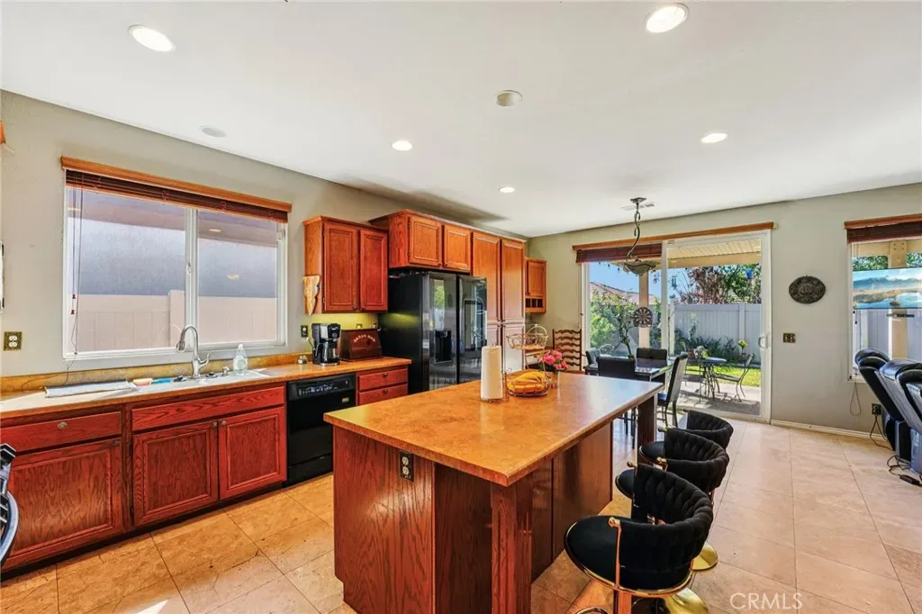 Welcome to this spacious single-story home in Beaumont, located in a desirable community. Featuring tile flooring throughout and a well-designed open layout, this home offers comfort, functionality, and easy living. The main living area includes a generous living room with a built-in media center and a tile-framed fireplace, flowing seamlessly into the formal dining room—perfect for gatherings. The expansive kitchen is the heart of the home, offering rich wood cabinetry, a center island, breakfast nook, built-in office area, and plenty of space for cooking and entertaining. A sliding glass door from the breakfast nook opens to the backyard, where you’ll find a spacious covered patio overlooking a grassy yard with mature trees lining the fence behind the home—creating a peaceful outdoor setting. The home is thoughtfully laid out with one hallway leading to three bedrooms and a full bathroom, while the opposite wing offers a private retreat. The spacious primary suite features a walk-in closet and an en-suite bathroom with dual sinks, a soaking tub, and a separate shower. This side of the home also includes a laundry room and direct access to the attached 3-car garage. Additionally this home offers energy efficiency and savings with a leased solar system. This home is a MUST SEE!