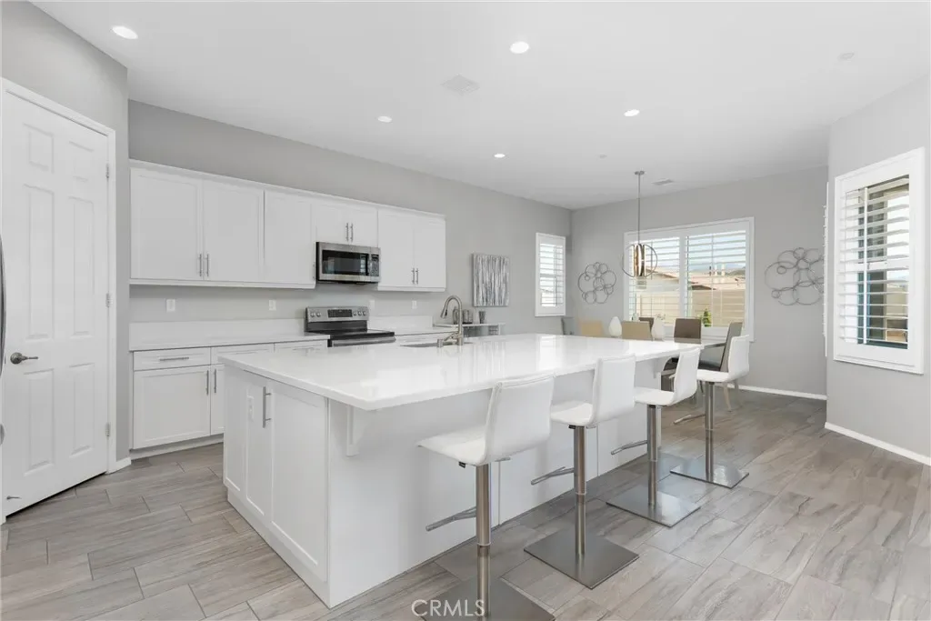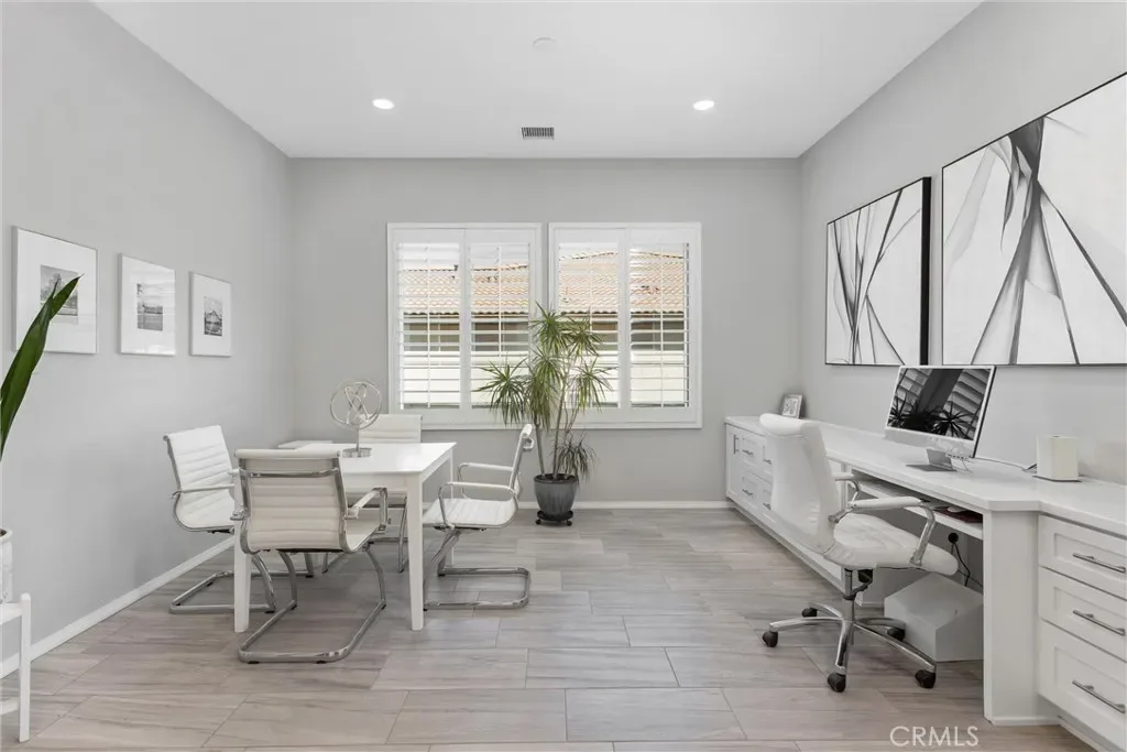 The open-concept family room is enhanced by a built-in 7-speaker surround sound system, creating an ideal space for relaxing or entertaining. Throughout the home, elegant 12” x 24” designer porcelain tile flooring and plantation shutters add a touch of sophistication and continuity.