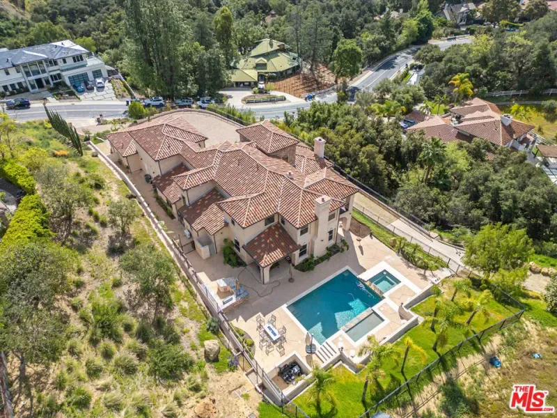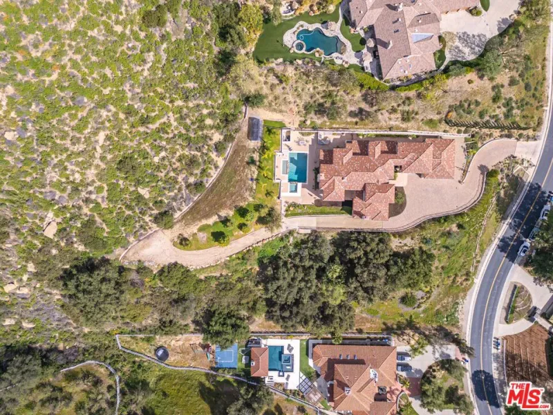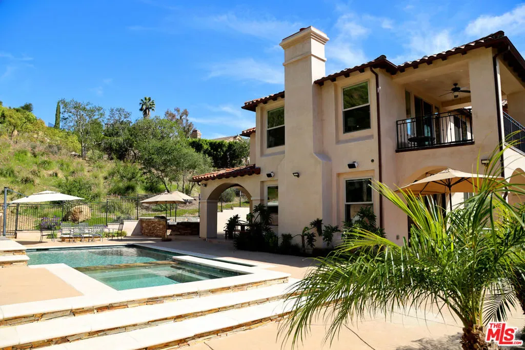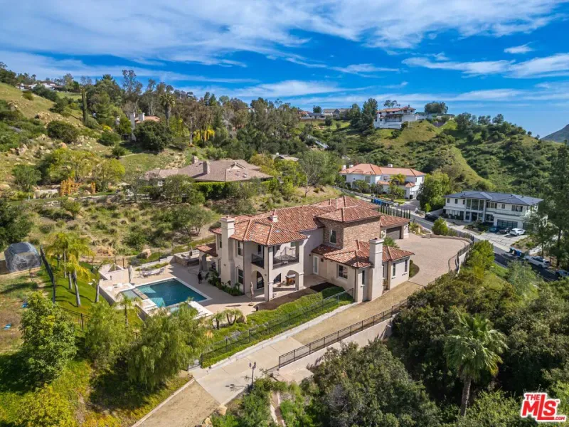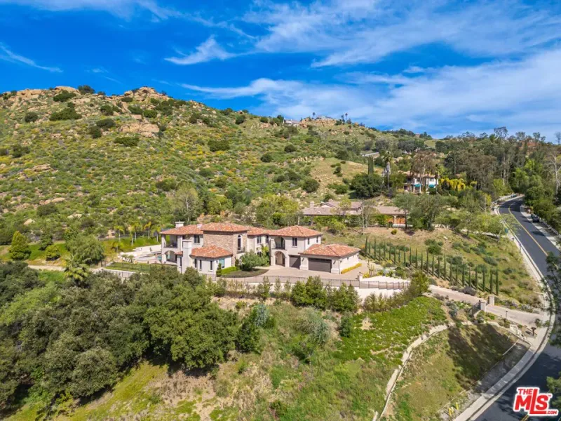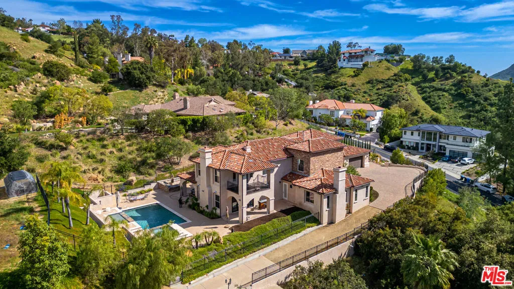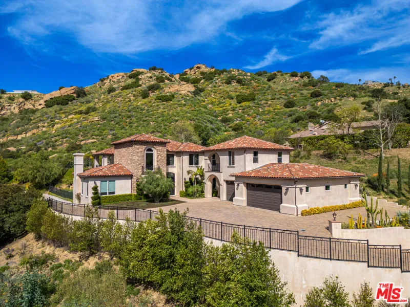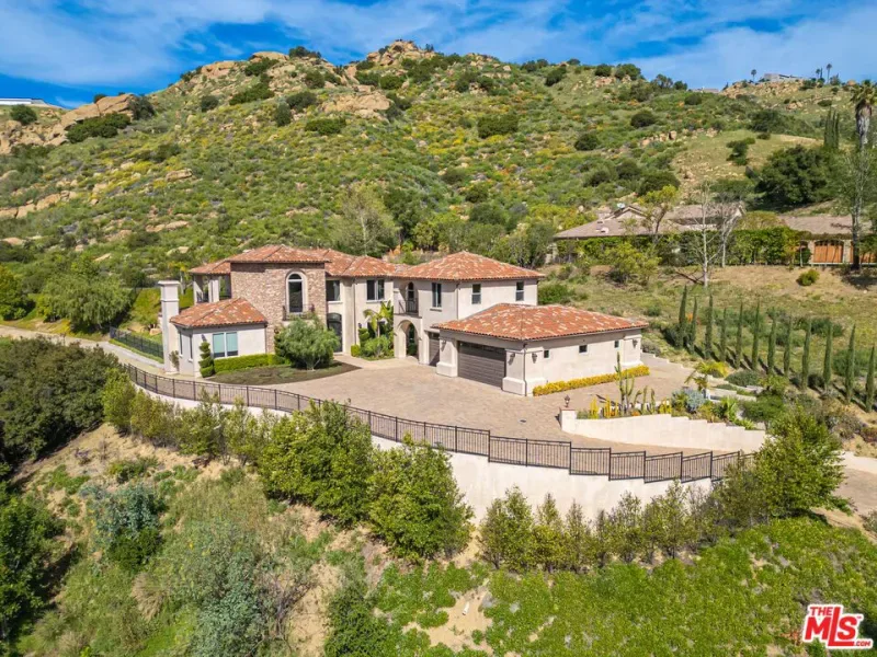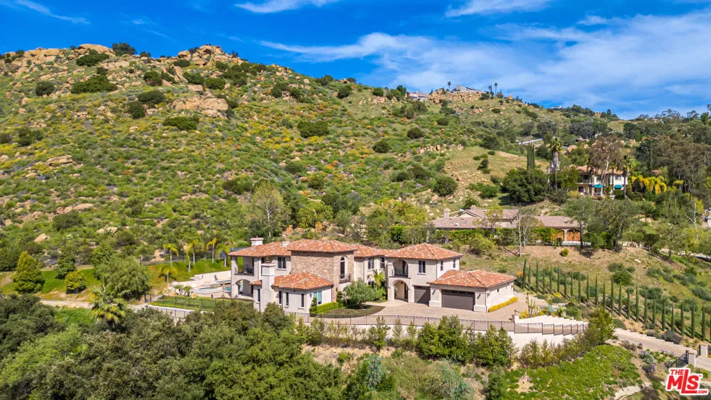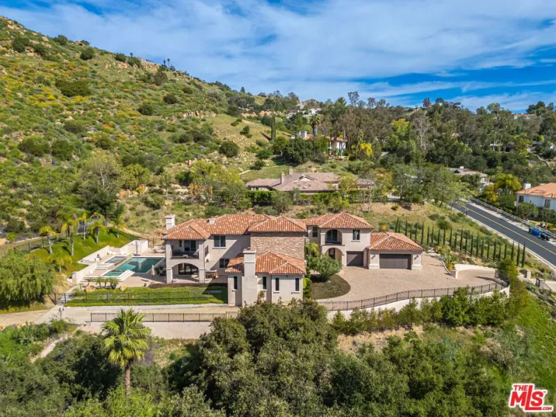 Refined Luxury Living with Resort-Style Grounds and Private Cinema. A long private gated drive ascends to this newer Mediterranean estate, built in 2019, perched atop its own private knoll within the prestigious guard-gated community of Bell Canyon. Offering exceptional privacy and sweeping views, this extraordinary custom residence was built with an uncompromising commitment to quality, craftsmanship, and thoughtful design.Grand double iron doors open to a dramatic foyer with soaring ceilings and expansive windows that flood the home with natural light. The gourmet kitchen features a stunning oversized island with waterfall quartz countertops, custom cabinetry, and premium Sub-Zero and Wolf appliances, opening seamlessly to the family room with a custom fireplace and disappearing glass doors that create effortless indoor-outdoor living.Designed for ultimate entertainment, the private cinema features soundproof insulation, premium GoldenEar speakers, a 145-inch perforated projection screen, high-end reclining seating, a dedicated AV equipment room, and its own independent AC system. The home is equipped with a Control4 smart home system, commercial-grade touch screen thermostats, and full network wiring throughout.The luxurious primary suite offers a private veranda, dual walk-in closets, and a spa-like bath. All bedrooms are thoughtfully designed with no shared walls or ceilings, creating exceptional privacy, and are pre-wired for ceiling speakers.Technology is seamlessly integrated throughout the home with Wi-Fi access points installed across the entire residence, providing strong connectivity throughout the property. The pool system is also connected to Wi-Fi, allowing remote control and monitoring for convenience and ease.Set on approximately 2.2 beautifully landscaped acres, the grounds feature mature trees, impressive engineered retaining walls, and a resort-style backyard complete with a modern pool and spa with Baja shelf, outdoor hot shower, and multi-zone outdoor speakers.Additional highlights include humidifier upgrades to each HVAC system, GoldenEar ceiling speakers in the living room and library, DoorBird smart gate entry system with kitchen monitor, and a garage equipped with three electric vehicle charging outlets.