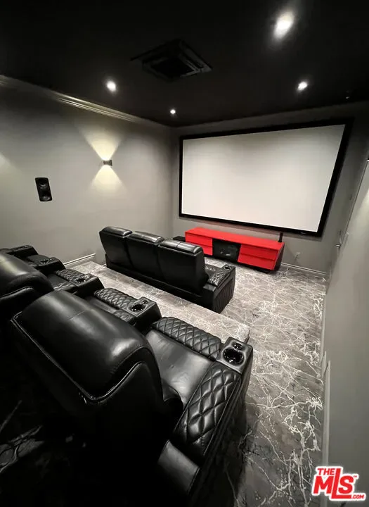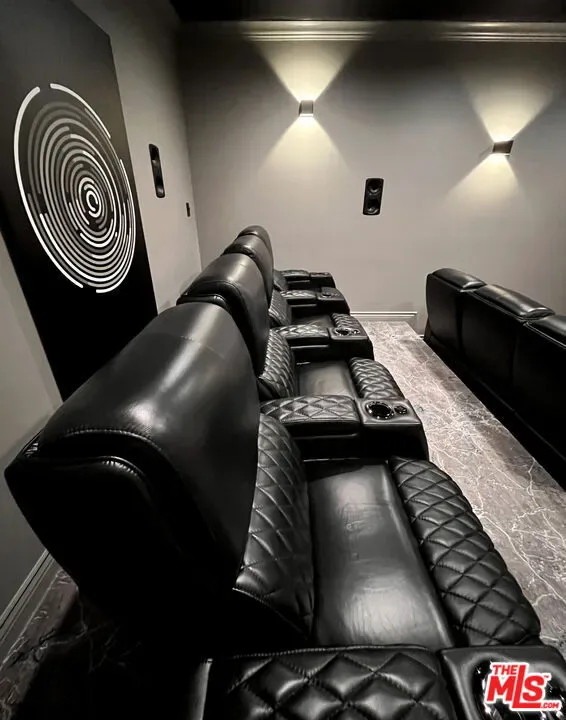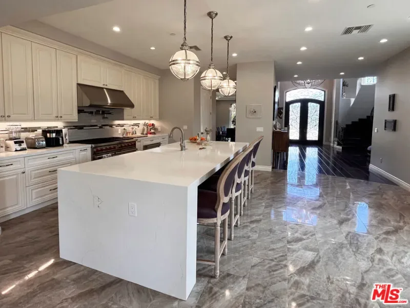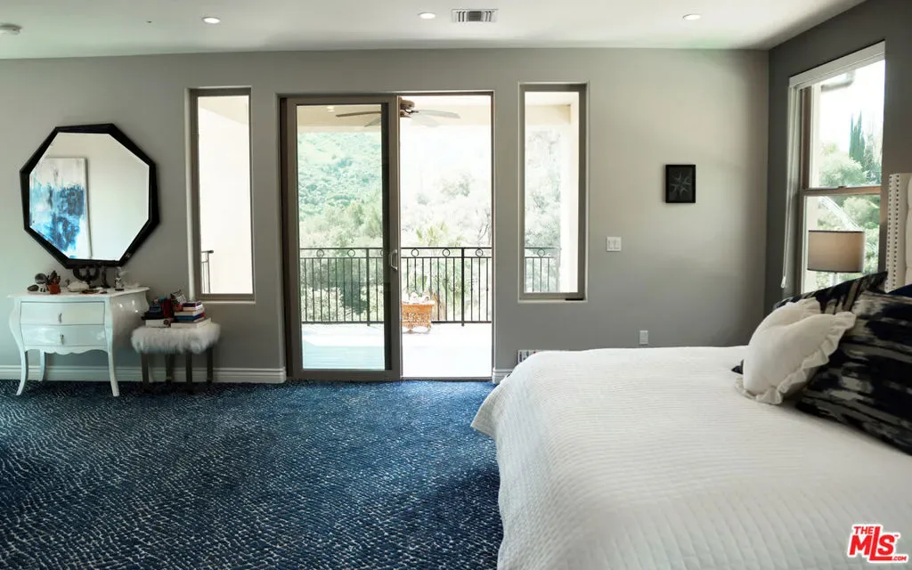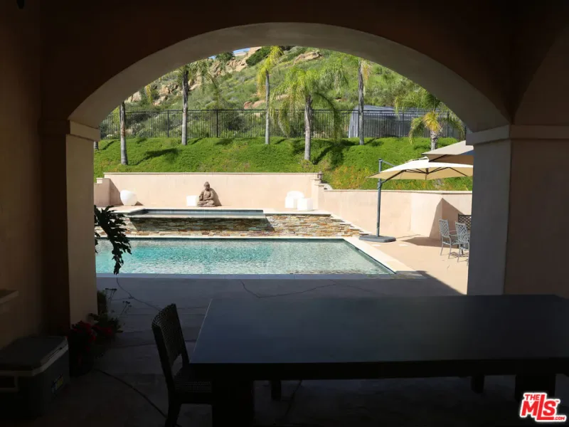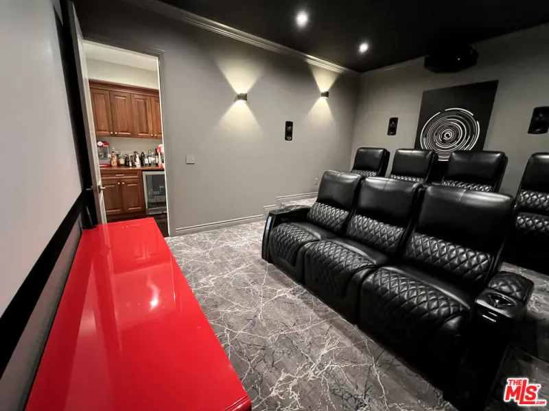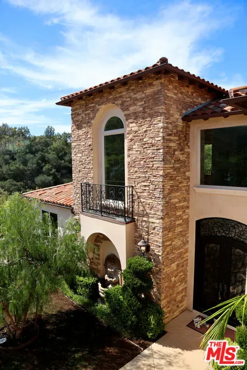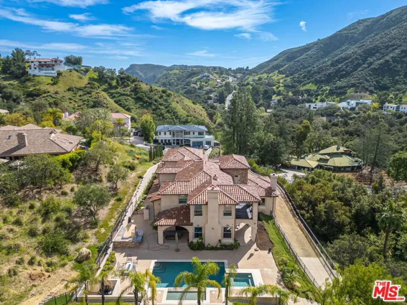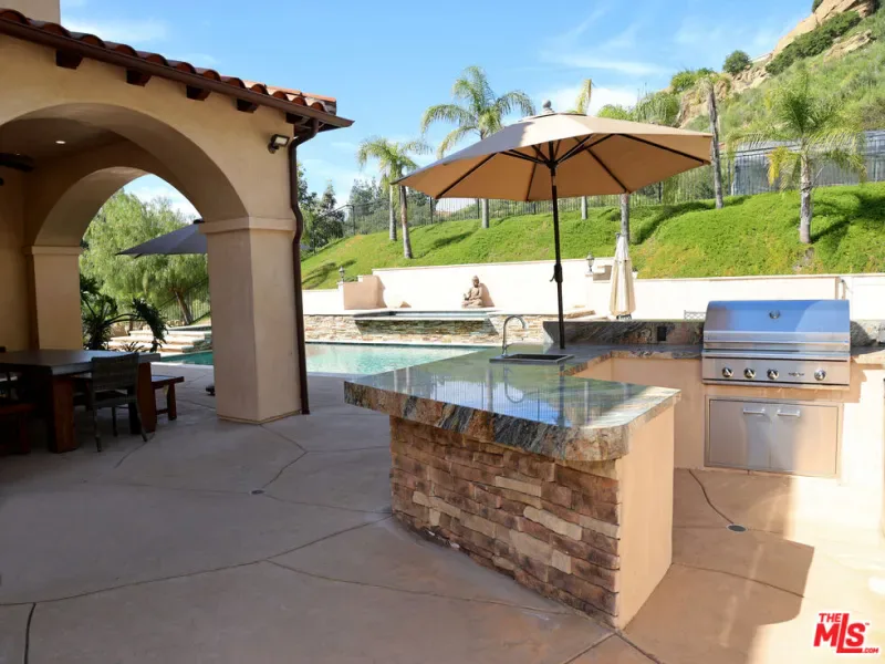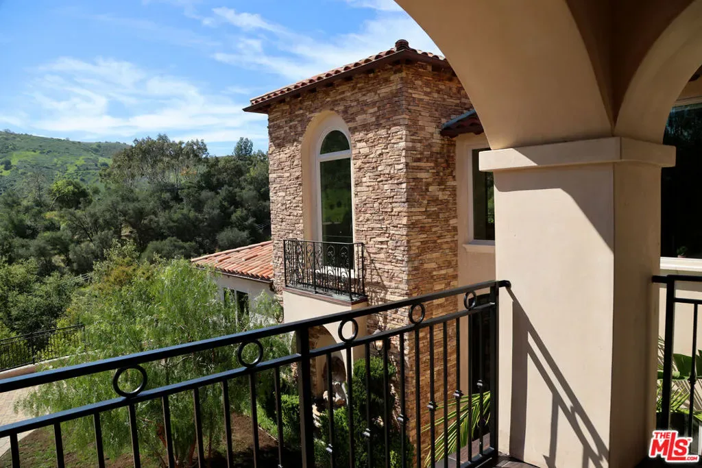 Refined Luxury Living with Resort-Style Grounds and Private Cinema. A long private gated drive ascends to this newer Mediterranean estate, built in 2019, perched atop its own private knoll within the prestigious guard-gated community of Bell Canyon. Offering exceptional privacy and sweeping views, this extraordinary custom residence was built with an uncompromising commitment to quality, craftsmanship, and thoughtful design.Grand double iron doors open to a dramatic foyer with soaring ceilings and expansive windows that flood the home with natural light. The gourmet kitchen features a stunning oversized island with waterfall quartz countertops, custom cabinetry, and premium Sub-Zero and Wolf appliances, opening seamlessly to the family room with a custom fireplace and disappearing glass doors that create effortless indoor-outdoor living.Designed for ultimate entertainment, the private cinema features soundproof insulation, premium GoldenEar speakers, a 145-inch perforated projection screen, high-end reclining seating, a dedicated AV equipment room, and its own independent AC system. The home is equipped with a Control4 smart home system, commercial-grade touch screen thermostats, and full network wiring throughout.The luxurious primary suite offers a private veranda, dual walk-in closets, and a spa-like bath. All bedrooms are thoughtfully designed with no shared walls or ceilings, creating exceptional privacy, and are pre-wired for ceiling speakers.Technology is seamlessly integrated throughout the home with Wi-Fi access points installed across the entire residence, providing strong connectivity throughout the property. The pool system is also connected to Wi-Fi, allowing remote control and monitoring for convenience and ease.Set on approximately 2.2 beautifully landscaped acres, the grounds feature mature trees, impressive engineered retaining walls, and a resort-style backyard complete with a modern pool and spa with Baja shelf, outdoor hot shower, and multi-zone outdoor speakers.Additional highlights include humidifier upgrades to each HVAC system, GoldenEar ceiling speakers in the living room and library, DoorBird smart gate entry system with kitchen monitor, and a garage equipped with three electric vehicle charging outlets.