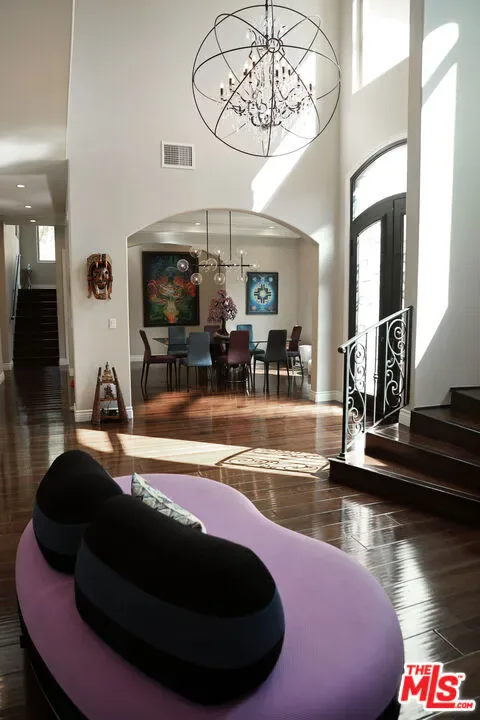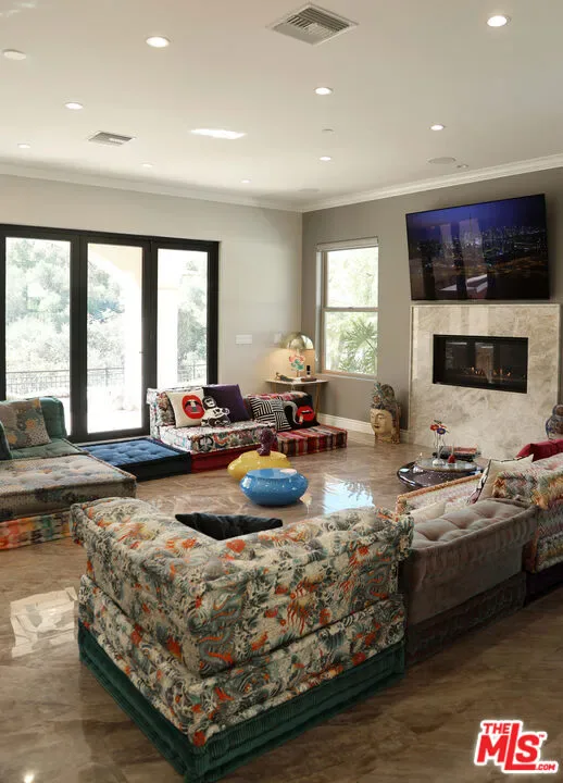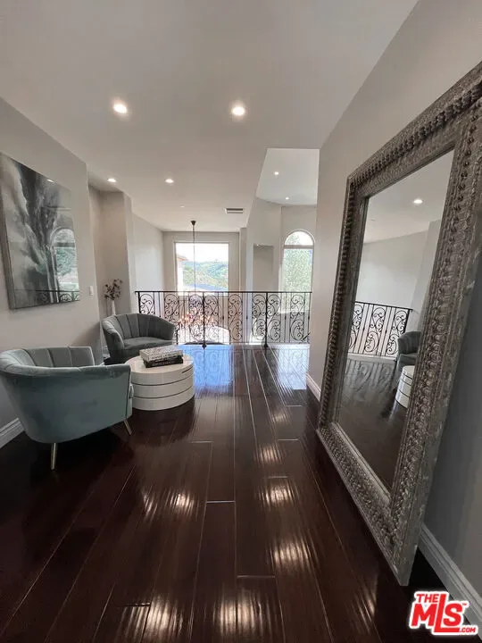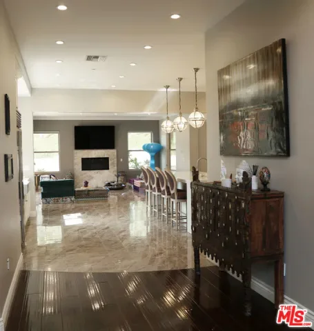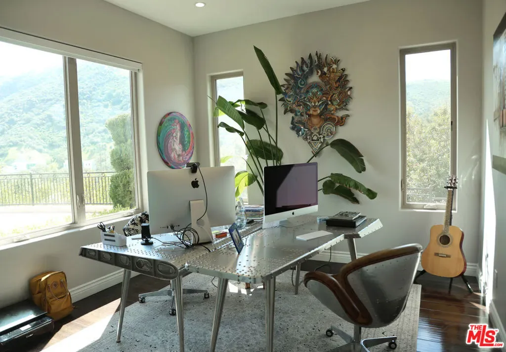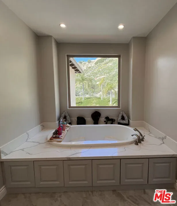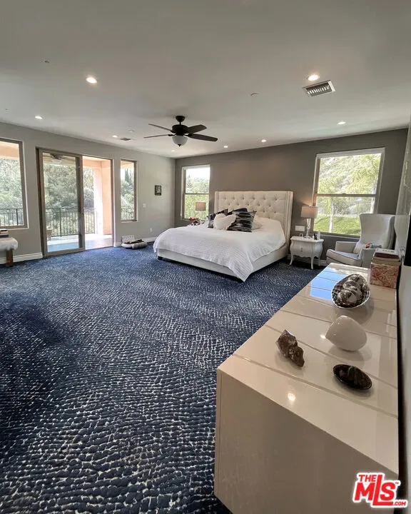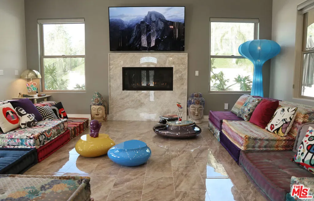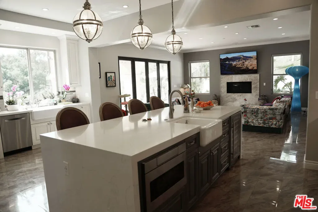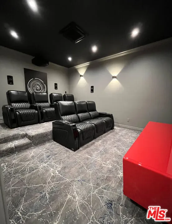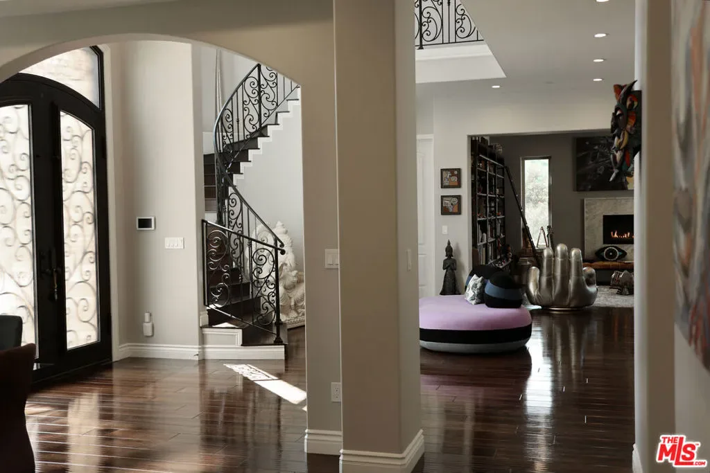 Refined Luxury Living with Resort-Style Grounds and Private Cinema. A long private gated drive ascends to this newer Mediterranean estate, built in 2019, perched atop its own private knoll within the prestigious guard-gated community of Bell Canyon. Offering exceptional privacy and sweeping views, this extraordinary custom residence was built with an uncompromising commitment to quality, craftsmanship, and thoughtful design.Grand double iron doors open to a dramatic foyer with soaring ceilings and expansive windows that flood the home with natural light. The gourmet kitchen features a stunning oversized island with waterfall quartz countertops, custom cabinetry, and premium Sub-Zero and Wolf appliances, opening seamlessly to the family room with a custom fireplace and disappearing glass doors that create effortless indoor-outdoor living.Designed for ultimate entertainment, the private cinema features soundproof insulation, premium GoldenEar speakers, a 145-inch perforated projection screen, high-end reclining seating, a dedicated AV equipment room, and its own independent AC system. The home is equipped with a Control4 smart home system, commercial-grade touch screen thermostats, and full network wiring throughout.The luxurious primary suite offers a private veranda, dual walk-in closets, and a spa-like bath. All bedrooms are thoughtfully designed with no shared walls or ceilings, creating exceptional privacy, and are pre-wired for ceiling speakers.Technology is seamlessly integrated throughout the home with Wi-Fi access points installed across the entire residence, providing strong connectivity throughout the property. The pool system is also connected to Wi-Fi, allowing remote control and monitoring for convenience and ease.Set on approximately 2.2 beautifully landscaped acres, the grounds feature mature trees, impressive engineered retaining walls, and a resort-style backyard complete with a modern pool and spa with Baja shelf, outdoor hot shower, and multi-zone outdoor speakers.Additional highlights include humidifier upgrades to each HVAC system, GoldenEar ceiling speakers in the living room and library, DoorBird smart gate entry system with kitchen monitor, and a garage equipped with three electric vehicle charging outlets.