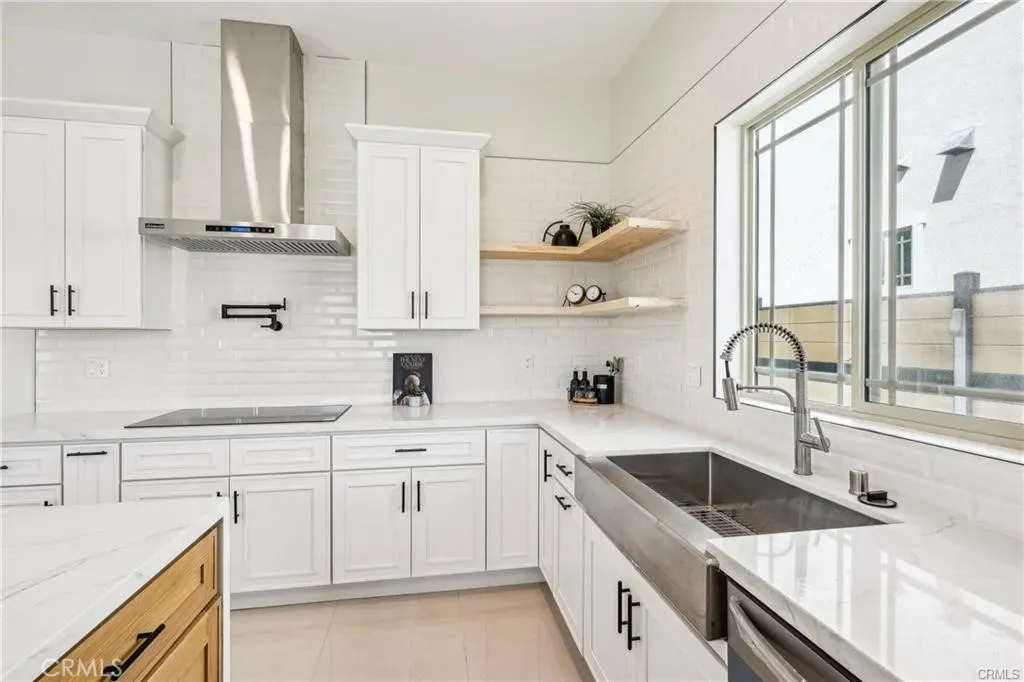 The kitchen showcases clean, modern finishes and brand-new stainless steel appliances, including an oven, dishwasher, and electric cooktop. Ample cabinetry and generous counter space provide both style and practicality.