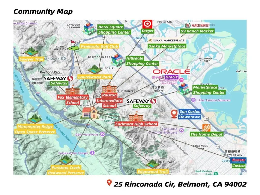 Breathtaking Bay Views in Belmonts Coveted Hallmark Neighborhood. This light-filled 3BD + office, 2.5BA home offers scenic hillside and Bay views, functional living space, and a peaceful natural setting. Private front and back yards provide rare outdoor privacy with multiple spaces for relaxation and entertaining, plus direct backyard access to a community walking trail near the popular Sheep Camp hiking trail Soaring ceilings and large windows create a bright living and dining area filled with natural light. The spacious kitchen features ample cabinetry, pantry closet, and a serving window connecting to the front yard for easy indoor-outdoor living. The oversized primary suite includes view windows, walk-in closet, and private deck. Additional bedrooms include a bonus office/playroom, with two guest rooms offering direct patio access Low HOA with greenbelt walking paths, a fenced pool with a solar cabana, and nearby parks and tennis courts. Located near top-rated Belmont schools (Fox Elementary, Ralston Intermediate, Carlmont High-buyer to verify).Convenient access to Hwy 92/280/101 for commuting to SF, Silicon Valley, and East Bay. Just minutes to downtown Belmont,San Carlos,Foster City,major shopping destinations including Hillsdale Shopping Center, Costco, and 99 Ranch