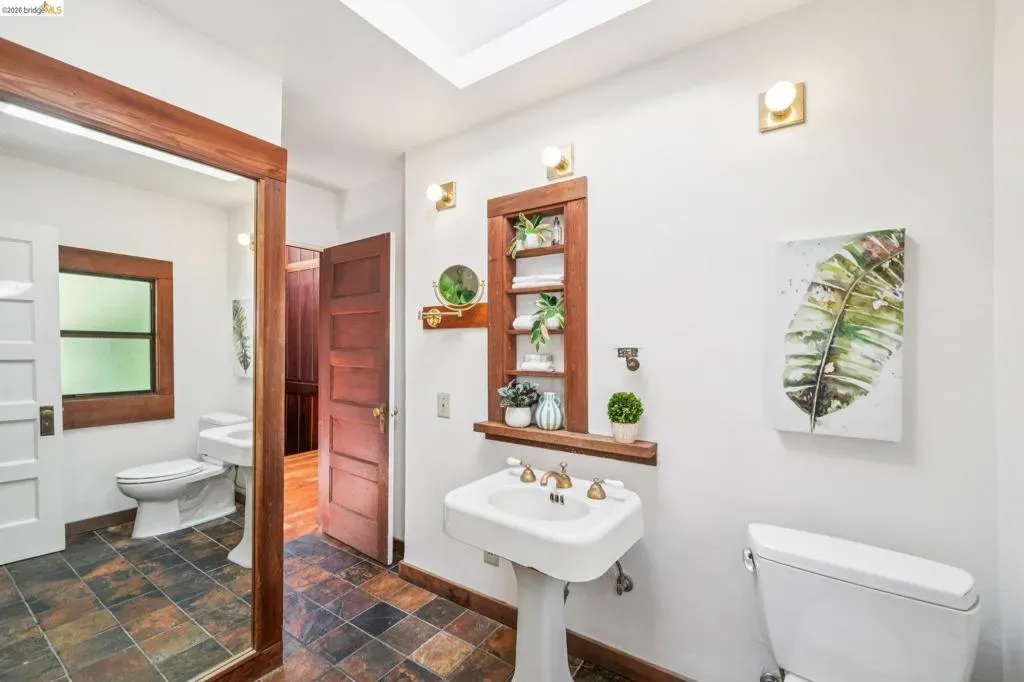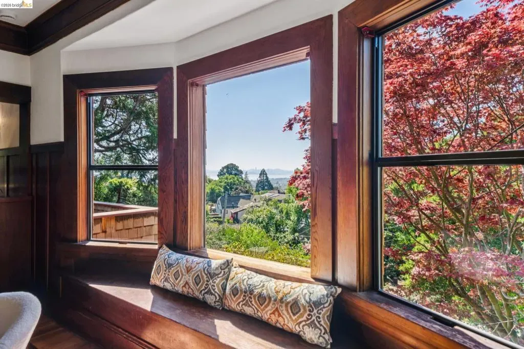Beautiful Berkeley Craftsman with Bay & Bridge Views! Come enjoy this classic Berkeley Craftsman in the Berkeley Hills offering picturesque views and a gorgeous landscaped yard. The flexible layout includes 1 bedroom, office, and full bath on the main level, plus 4 additional bedrooms upstairs. A lower-level studio with separate entrance, kitchen, and bath provides extra space for guests, extended family, or potential rental income. Classic architectural details shine in the light-filled living and dining rooms with preserved woodwork, box beam ceilings, and gleaming Madrone floors. Built-ins, custom shelving, and a vintage phone nook paired with abundant natural light, create a warm and inviting atmosphere. Extensive windows frame the picturesque view perfectly. The spacious custom designed kitchen with stunning Julia Morgan inspired tile is the heart of the home, flowing seamlessly into the main living areas and office. Upstairs, 4 spacious rooms offer flexibility and comfort. Relax outdoors on the private deck, enjoy the peaceful landscaped garden, or unwind in the cedar hot tub under the stars. Home energy score 1. Conveniently located near Solano Ave, Indian Rock Park, and Kennsington with easy access to shops, dining, and scenic Berkeley Hills trails. Views: Downtown