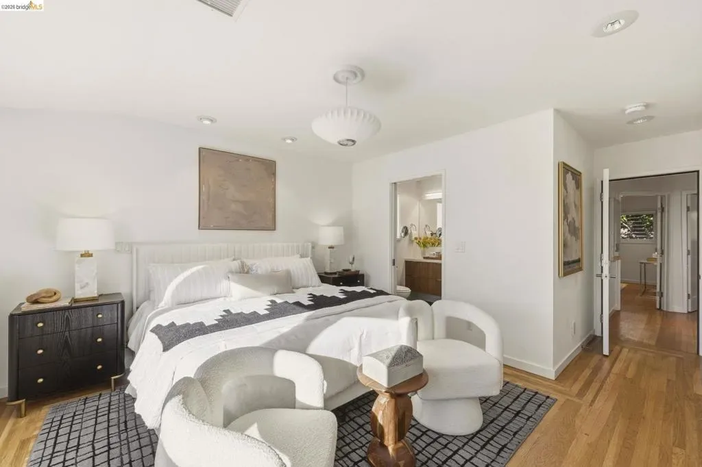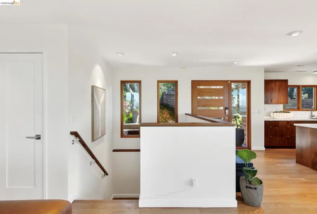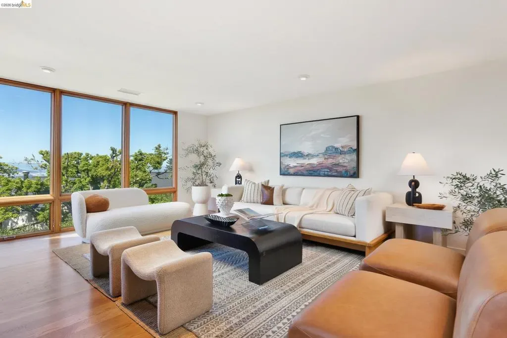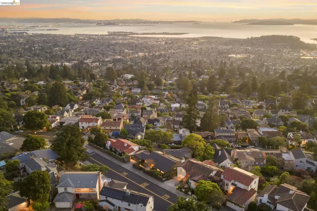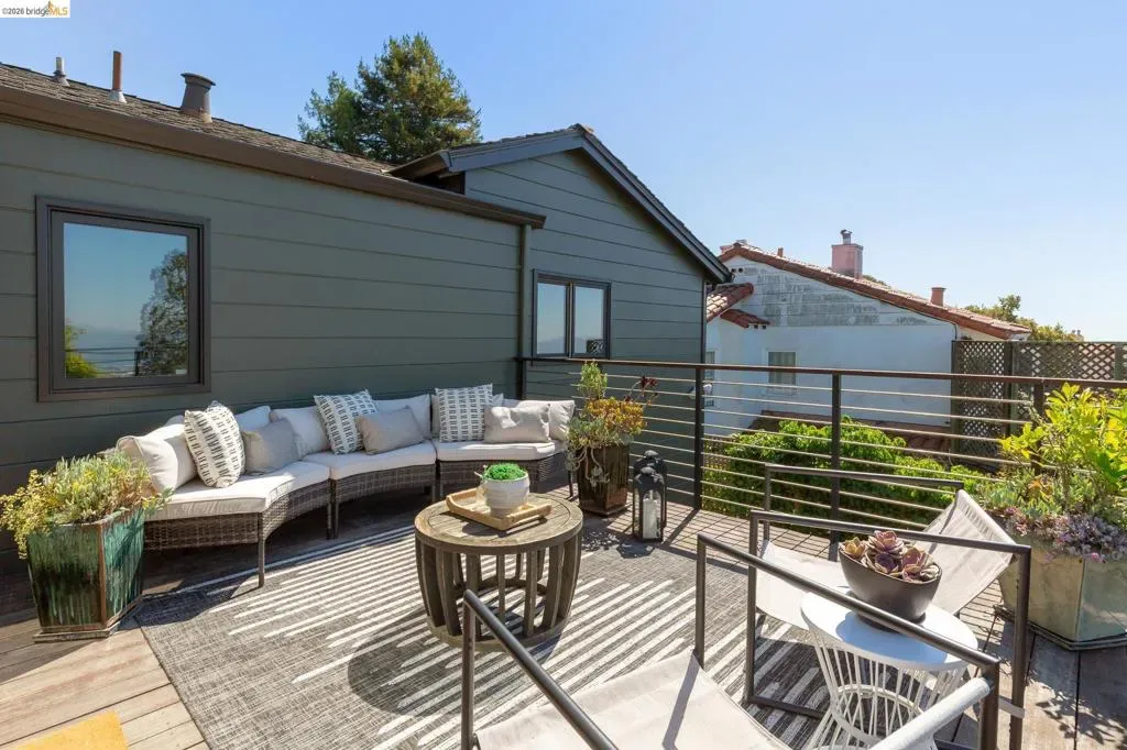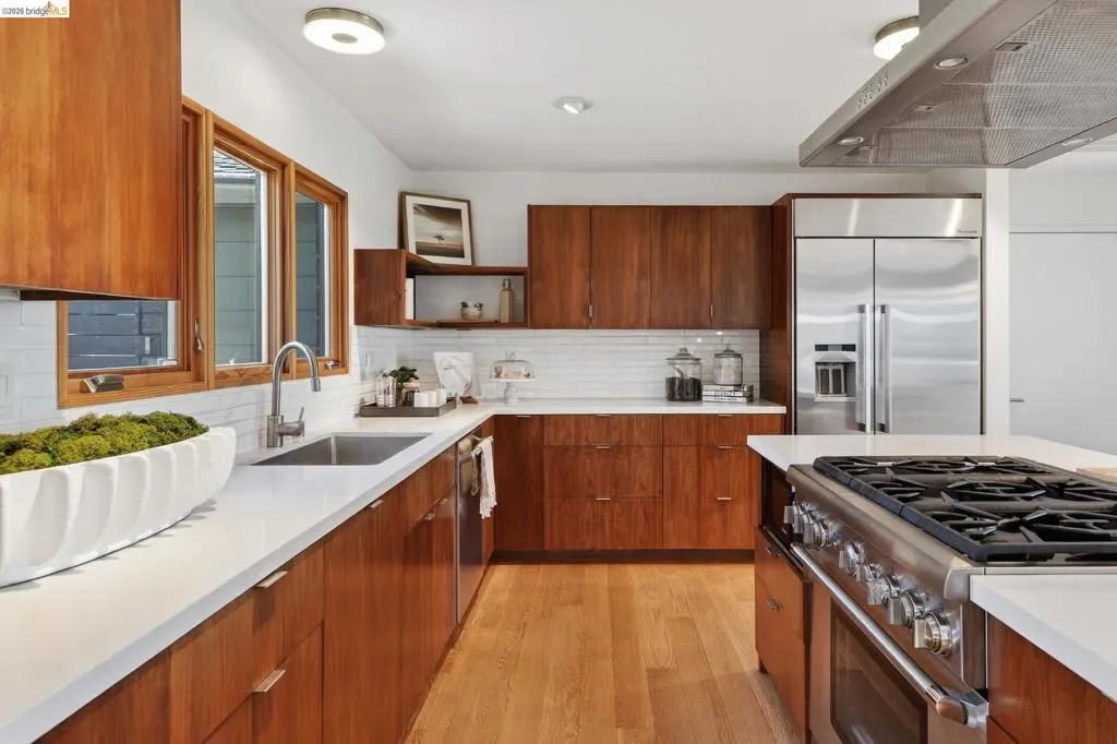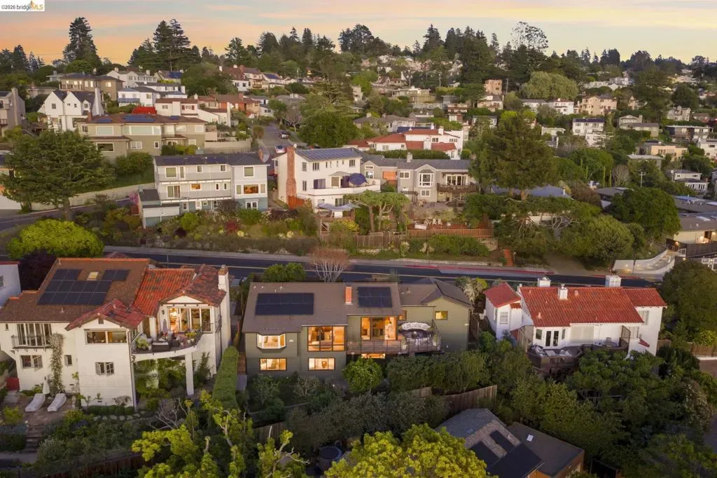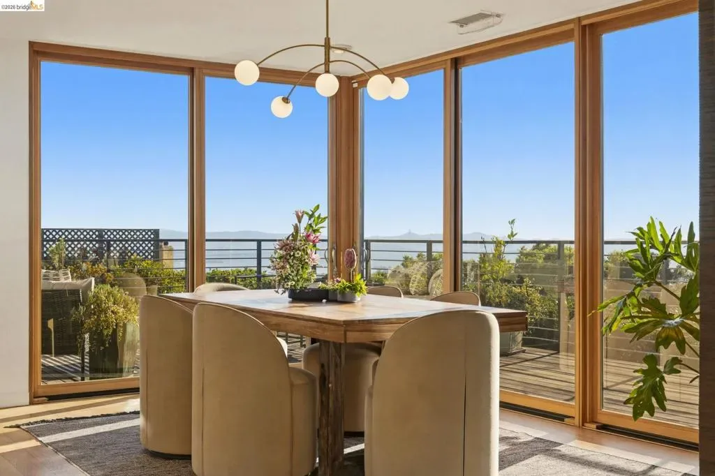 BESO score 10. This stylish MCM home is evolved for today’s lifestyle and crowned by panoramic views of the Bay and Golden Gate Bridges, S.F. skyline, and the shimmering bay. Light, water, and sky draw you into this true sanctuary. Across two levels, the level-in entry, primary suite on the main floor, scale, and accessibility here is uncommon. Exotic hardwood cladding on the facade and wraparound deck complements the warm olive tones in a seamless theme. The open plan connects kitchen, dining, and living in a generous flow, each open to the views. Hardwood floors run into walls of glass, anchored by walnut cabinetry, a full Thermador suite, central island, and breakfast bar. The owner’s suite has bay window views, large closet, and spa-level bath. Two more bedrooms and a marble-tiled bath complete the main floor. Downstairs are two bedrooms, lounge, wet bar, bath, laundry, loggia, and level backyard. A cutting garden, established fruit and other trees, level lawn and succulents compose a productive, low-maintenance landscape. Owned solar (8kW), dual Tesla Powerwalls, EV ready makes contemporary luxury living is effortless. With architectural integrity, multi-generation living options, future proof upgrades, this is simply a peerless lifestyle offering.
