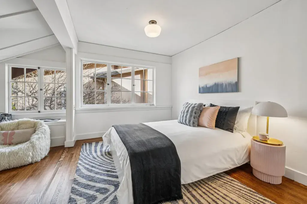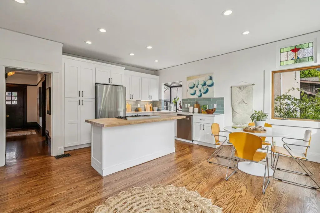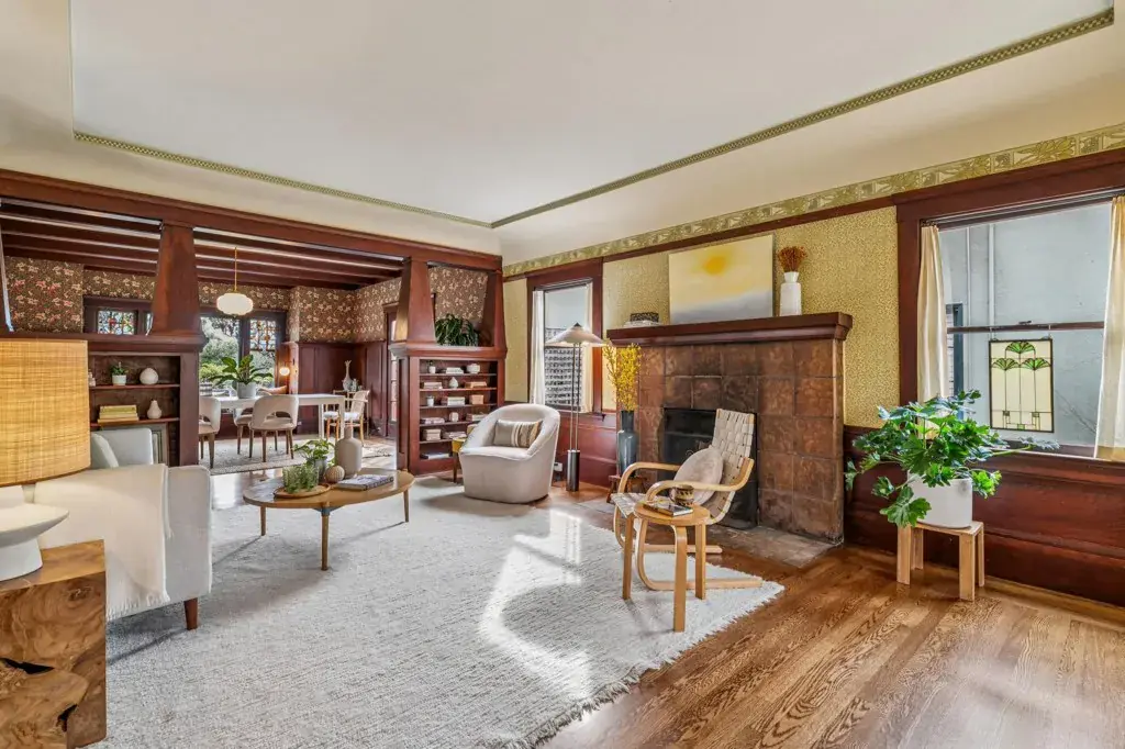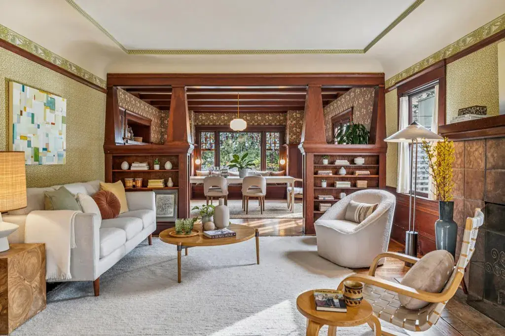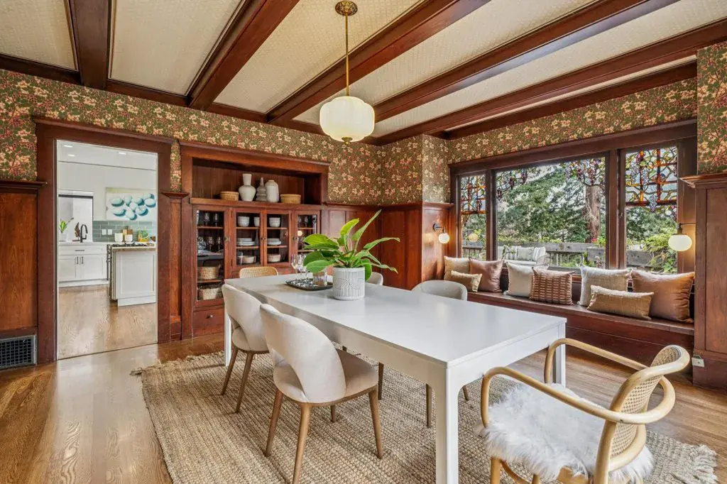 Classic Craftsman character meets refreshed functionality in this spacious and ideally located Northbrae residence just blocks from Solano Avenue. Designer Arts & Crafts wallpaper, custom stained glass, original moulding and built-ins highlight the home’s architectural appeal, complemented by freshly refinished hardwood floors and a newly painted interior. The versatile floor plan offers six bedrooms and 2.5 baths, including a primary bedroom with walk-in closet, formal dining room, eat-in kitchen, and a convenient downstairs kitchenette. The refreshed kitchen features quartz countertops, updated cabinetry, tile backsplash, breakfast bar with island seating and garden window. Indoor-outdoor flow connects both kitchen and dining areas to a large rear wrap-around balcony deck, ideal for everyday enjoyment and entertaining. The expansive fenced backyard oasis includes multiple patio areas, while the attached garage, basement workshop, ample closets, and accessible attic storage provide exceptional utility. Treetop views with a peek of the Bay! BESO rating 2.