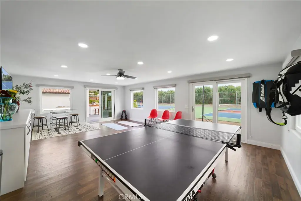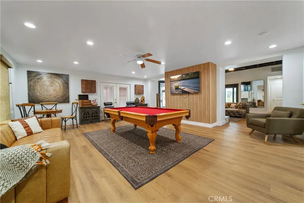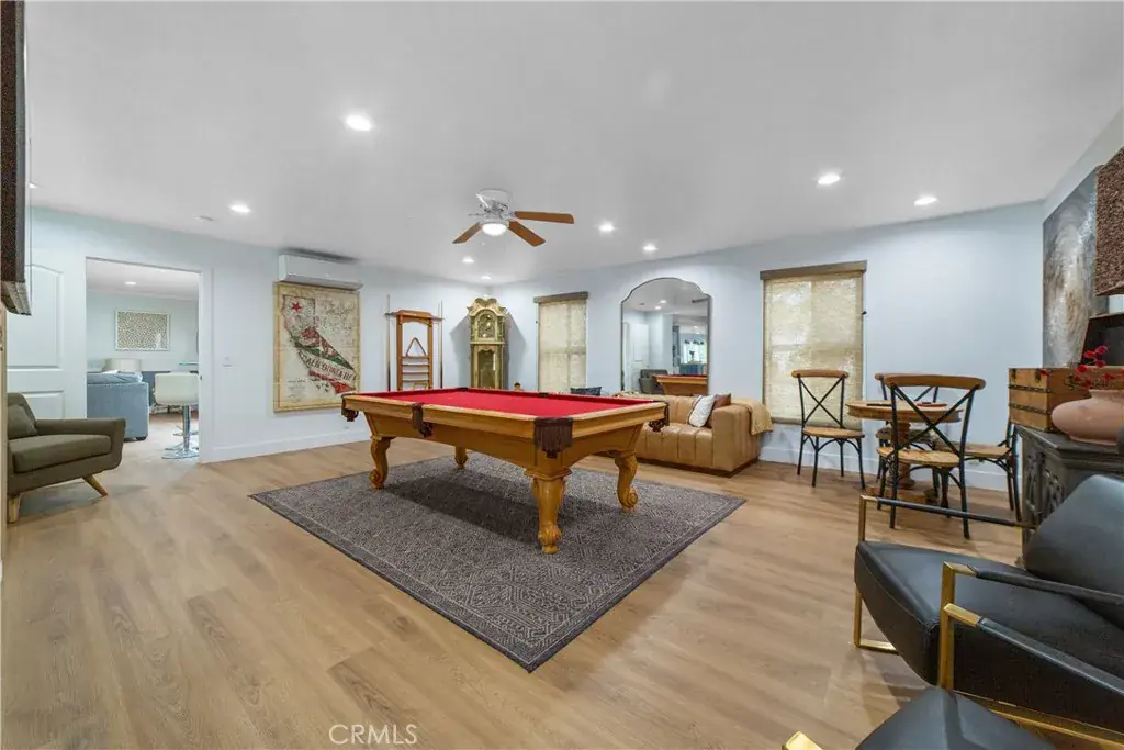The expansive primary suite is a true retreat, featuring a massive walk-in closet and a newly remodeled spa-like bathroom with a sit-on-top soaking tub and elegant new finishes. Two guest bedrooms are configured in a Jack-and-Jill layout with a shared bathroom, and each guest room enjoys its own private patio space. Additional amenities include a dedicated billiards room with a brand-new pool table and a versatile hobby room currently set up as a game room and workout space. The home features new flooring throughout, fresh interior paint, and numerous recent upgrades.