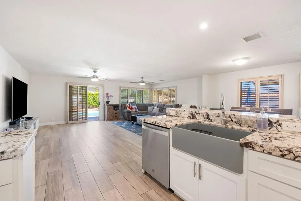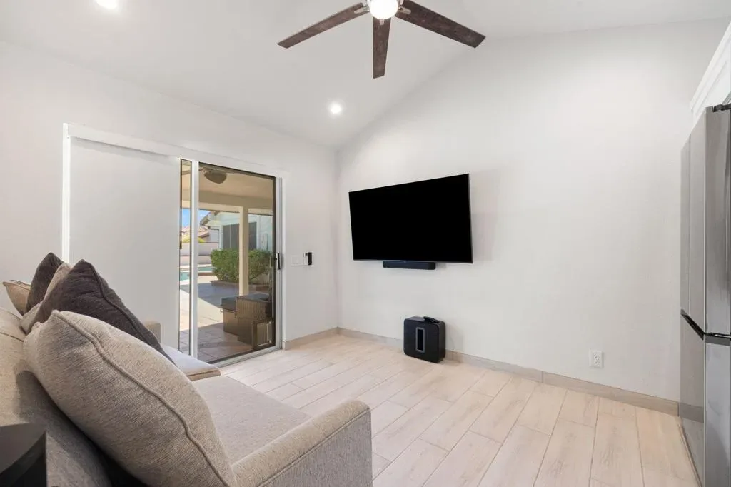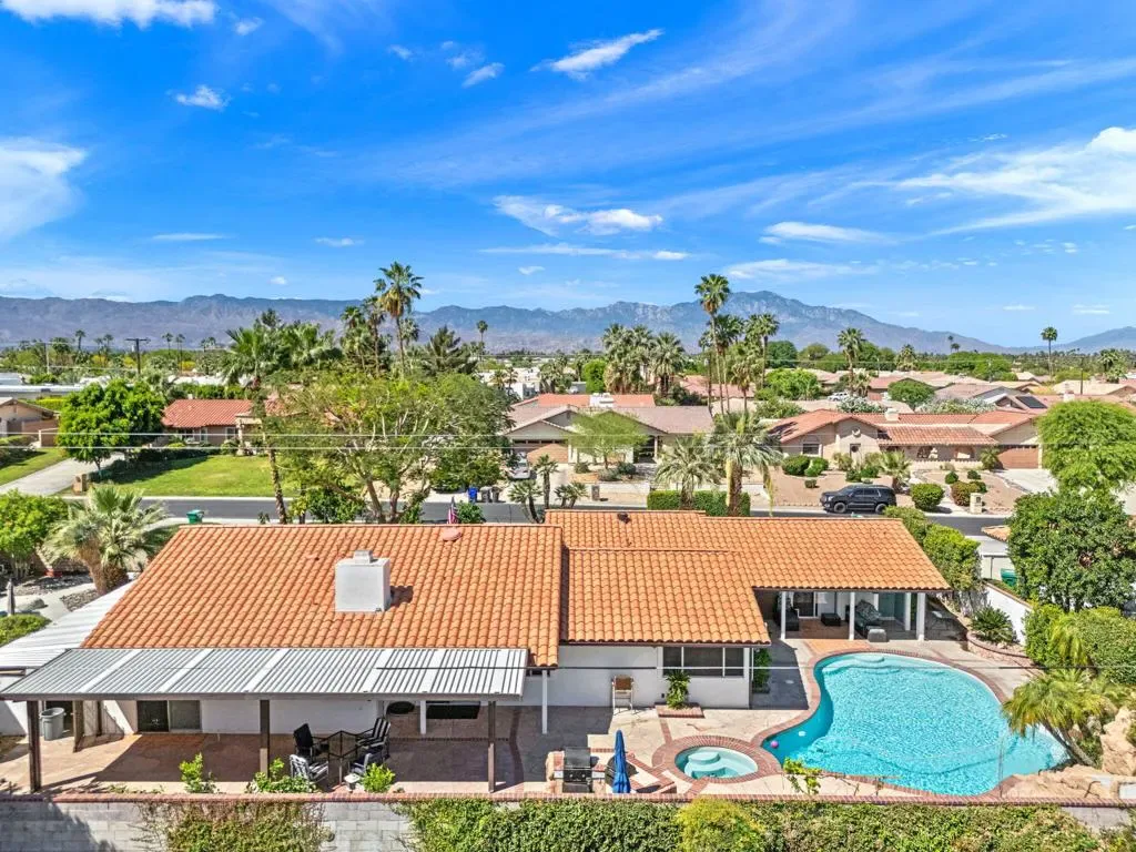Step into refined desert living with this stunning custom estate in the prestigious Bermuda Dunes Country Club. Designed for both luxury and comfort, this exceptional home features four spacious bedrooms and three beautifully appointed bathrooms, including a private full casita complete with its own kitchen and bath–ideal for guests or extended family. Entertain effortlessly in your resort-style backyard, highlighted by a custom pool and spa with an exciting slide, expansive covered patios, and a fully equipped outdoor barbecue area. Enjoy evenings under the stars with an outdoor TV and shower, all surrounded by lush, meticulously designed landscaping and elegant patio pavers.Inside, the home showcases high-end finishes throughout, custom wood shutters on doors and windows, and ceiling fans in all the right places. Stay comfortable year-round with central air and heating, plus a dedicated mini-split system in the primary bedroom for added efficiency and a dedicated mini-split in the garage. Situated on a massive lot with a three-car garage and abundant additional parking, this property offers both privacy and convenience. Located just minutes from world-class golf courses, fine dining, shopping, and entertainment, this home perfectly blends upscale living with everyday accessibility.A rare opportunity to lease a true desert retreat–crafted for both grand entertaining and relaxed living.