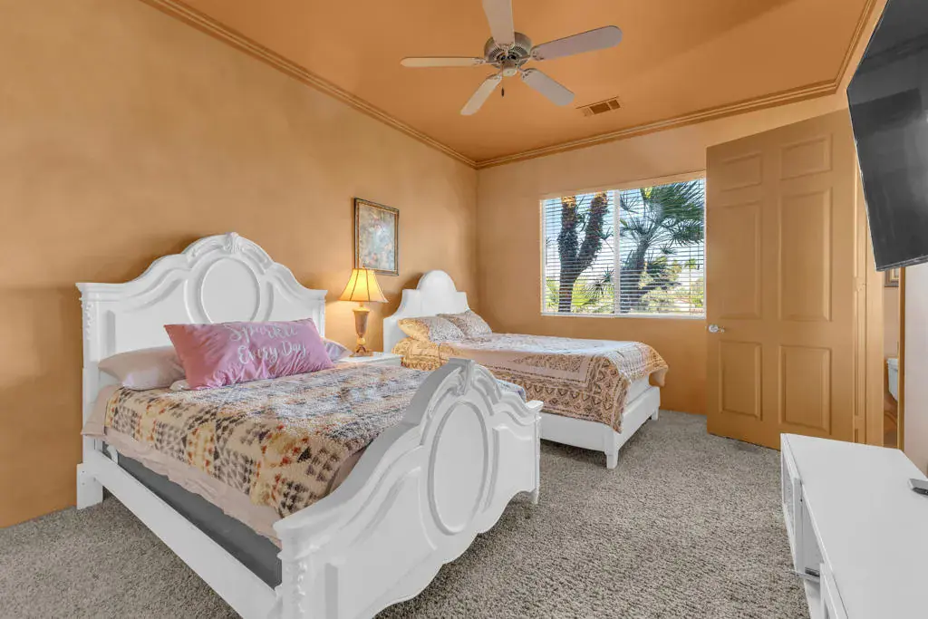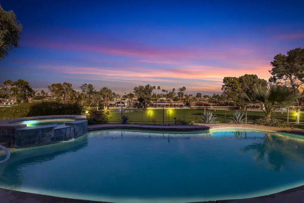 This home sits on an elevated lot with direct golf course access via private steps and offers sweeping views of the fairways. From the moment you enter, the thoughtful layout and tranquil orientation make this home feel like a private retreat.The floor plan features three bedrooms and four bathrooms, with each bedroom offering its own en suite bath, a rare and highly desirable feature. The spacious primary suite is privately located on one side of the home, while the two guest bedrooms are on the opposite wing, offering both comfort and privacy. A separate guest bathroom adds extra convenience.Upon entry, you’re greeted by high ceilings, a formal dining room to your right, and a formal living room to your left. All designed to draw your eye toward the backyard, saltwater pool, and golf course beyond. The kitchen includes double ovens, ample counter space, a built-in refrigerator plus a bonus pull-out fridge, ideal for entertaining.Additional features include a newer HVAC system (installed less than 2 years ago), a built-in surround sound, windows for improved energy efficiency, which the seller says has helped reduce electricity costs by up to 30%, and beautiful flow throughout the home.This property offers more than just functionality. It radiates balance, privacy, and energy that make it feel like a true personal resort. Schedule a private showing and experience it for yourself.