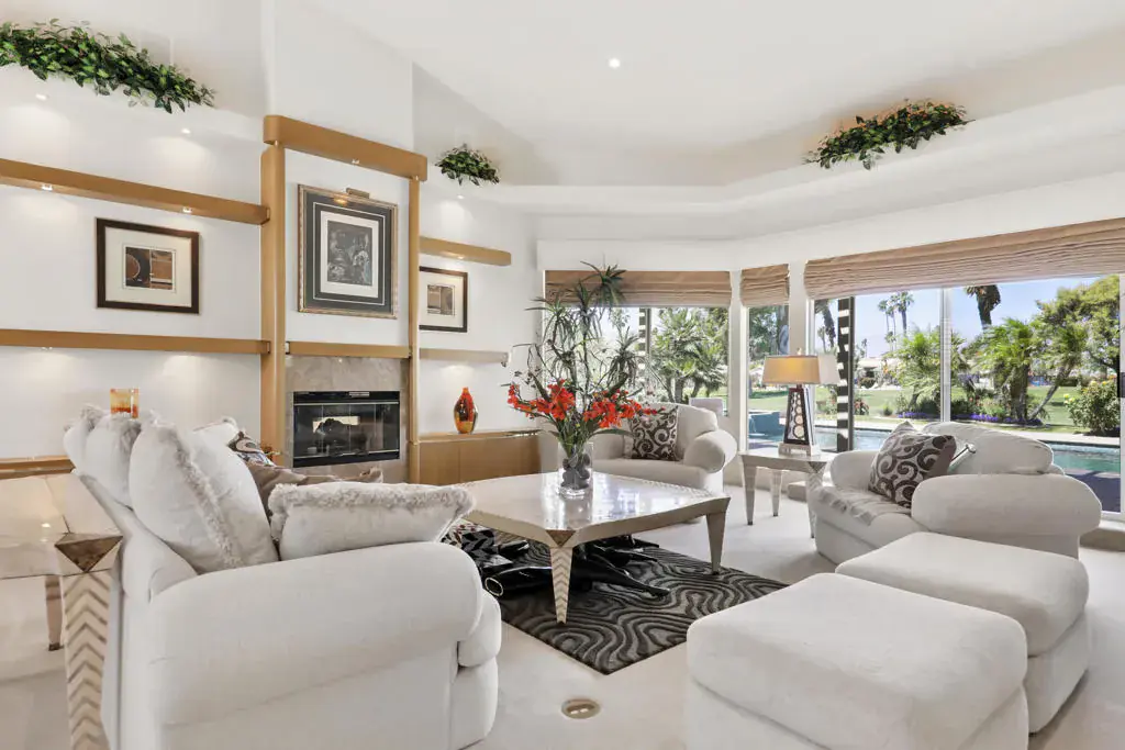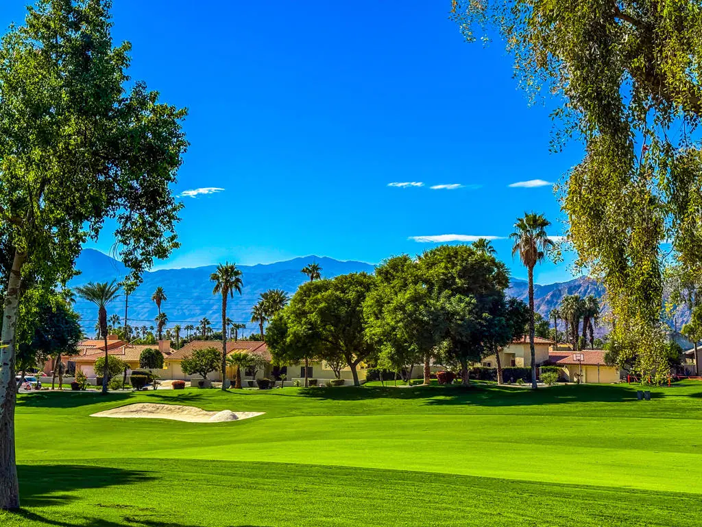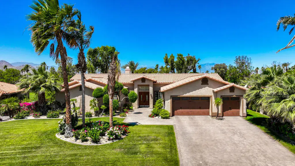 Beautifully appointed home on an elevated 15,246 sq. ft. lot overlooking the 3rd Fairway & mountains on the Eisenhower Nine in Bermuda Dunes Country Club .. Home is 3882 square feet per the Seller with three ensuite bedrooms and a convenient office with custom built-ins, a fireplace and views over the sparkling saline pool/spa to the golf course. The Texas-sized primary suite has his & hers closets and water closets (hers with bidet)… True GREAT ROOM wherein the living/dining area with a sit down wet bar complete with GE Monogram wine cooler & U-Line icemaker is open to the gourmet kitchen and family room. Terrific area for entertaining!! Chef’s kitchen boasts an 8 burner Wolf stove, a warming drawer, plus another GE Monogram wine cooler, as well as a Sub Zero fridge and convenient sit down bar for casual dining. There is also a built-in professional wine locker which is temperature controlled. Plenty of room for al fresco dining on the spacious outdoor covered patio with built-in BBQ overlooking the pool and mountains. Three-car garage with tons of storage is air conditioned. IID for lower electric plus both A/C systems replaced with heat pumps in May, 2023. HOA of $214 a month includes cable TV with 2 boxes with Cinemax, Showtime, HBO plus internet with Spectrum PLUS 24-hour security. I I D for lower electric.