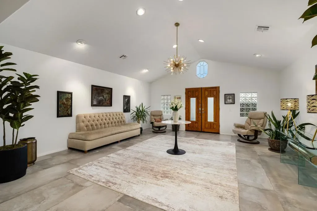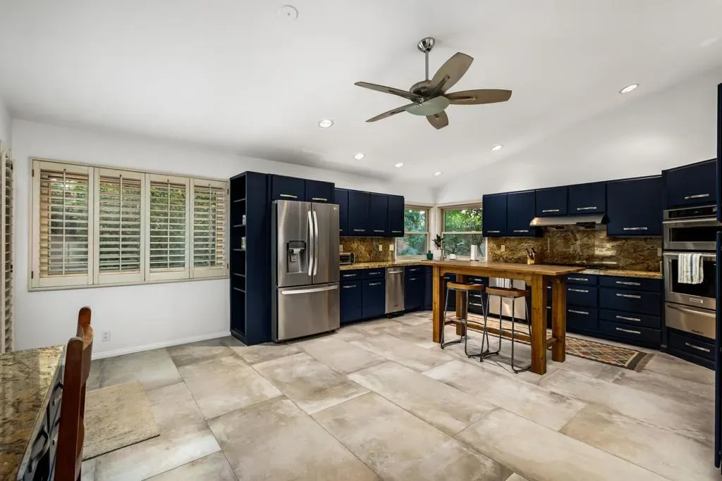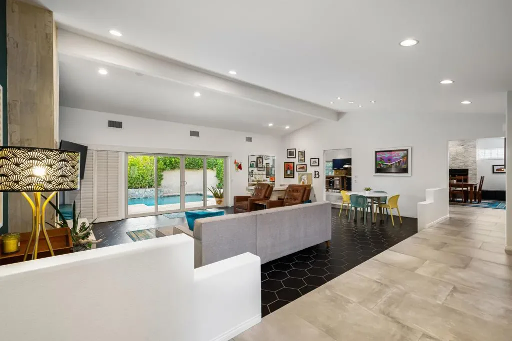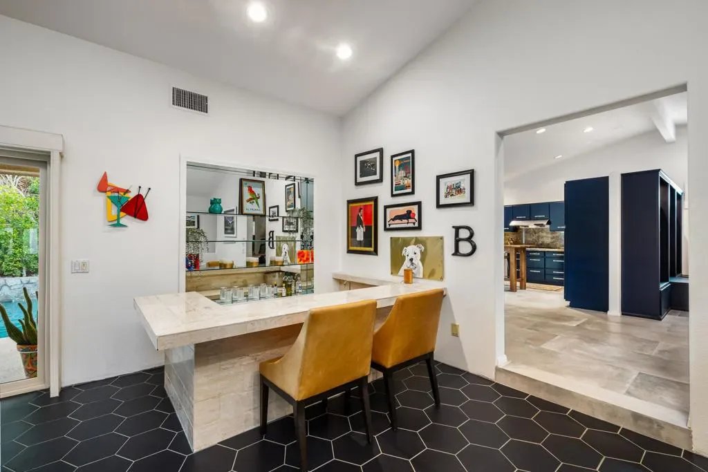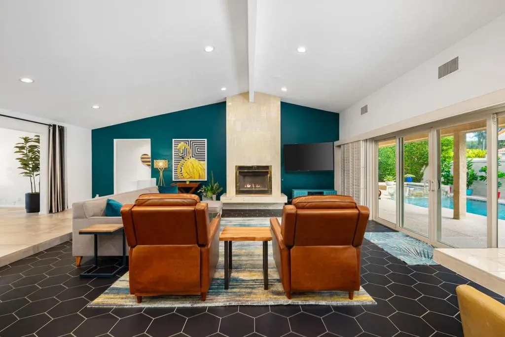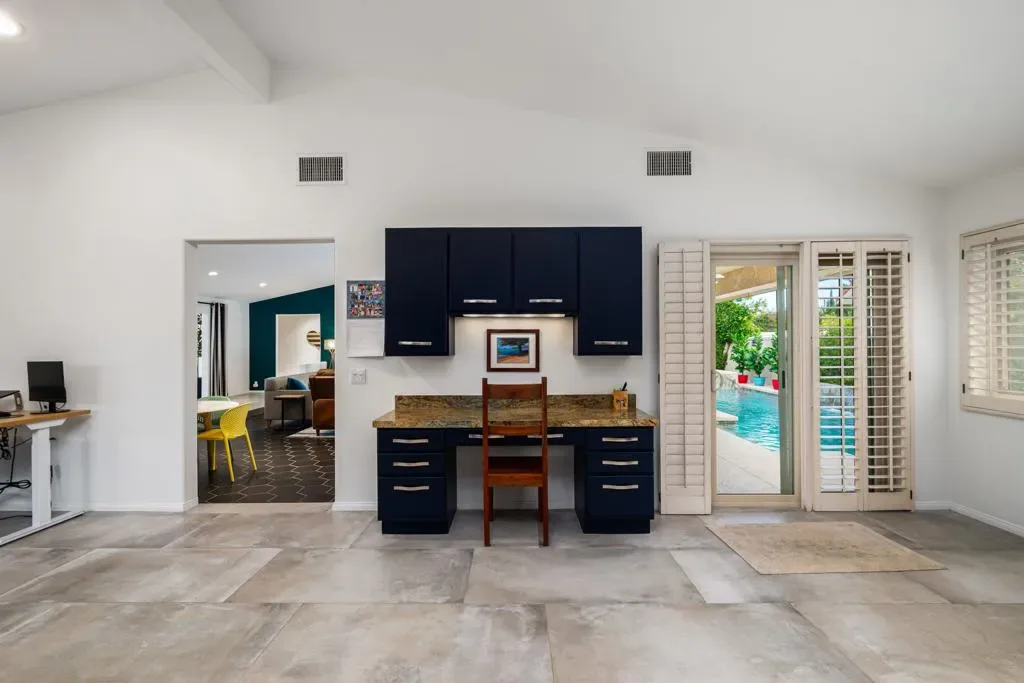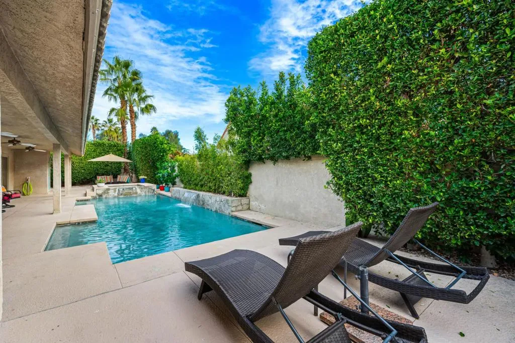 Located within the iconic Bermuda Dunes Country Club, this home delivers the lifestyle buyers come here for single-story living, privacy, and effortless indoor-outdoor entertaining. Behind the inviting turquoise double doors, the home opens to a bright and welcoming interior featuring vaulted ceilings, recessed lighting, and an open, functional layout designed for both everyday living and hosting. The main living area is highlighted by a dramatic floor-to-ceiling fireplace with custom tile surround and a striking designer accent wall, creating a warm and stylish focal point. The kitchen is thoughtfully updated with rich navy cabinetry, granite countertops and backsplash, stainless steel appliances, and an oversized butcher-block island ideal for gathering, meal prep, or casual dining. Generous storage and adjacent workspace add practicality while maintaining a clean, modern aesthetic look. Large sliding glass doors connect the living space to the private backyard retreat, creating seamless indoor-outdoor flow. Outside, enjoy a sparkling pool with cascading water features, a covered patio with ceiling fans, and lush privacy hedging perfect for relaxing afternoons, entertaining guests, or enjoying quiet desert evenings. The bedrooms are spacious and well appointed, including a cheerful primary retreat with views of the backyard. Plantation shutters, neutral flooring, and custom design touches throughout reflect pride of ownership and thoughtful updates. Set within one of the desert’s most established and sought after country club communities, this Bermuda Dunes home offers timeless curb appeal, a functional single level layout, and the relaxed lifestyle that defines desert living.