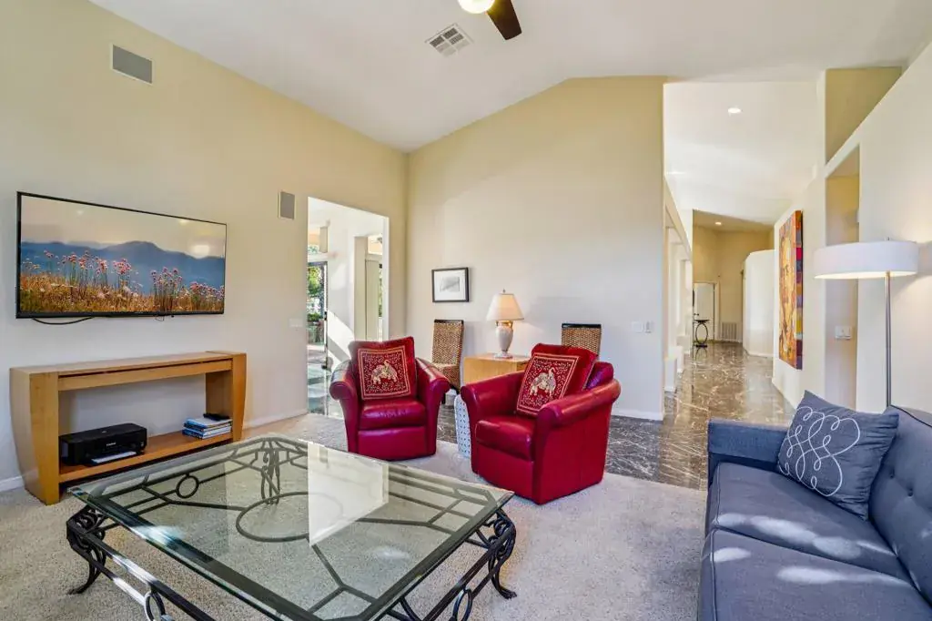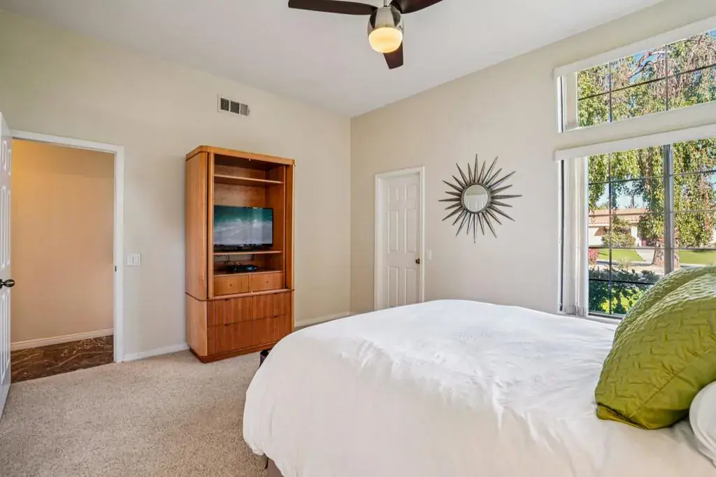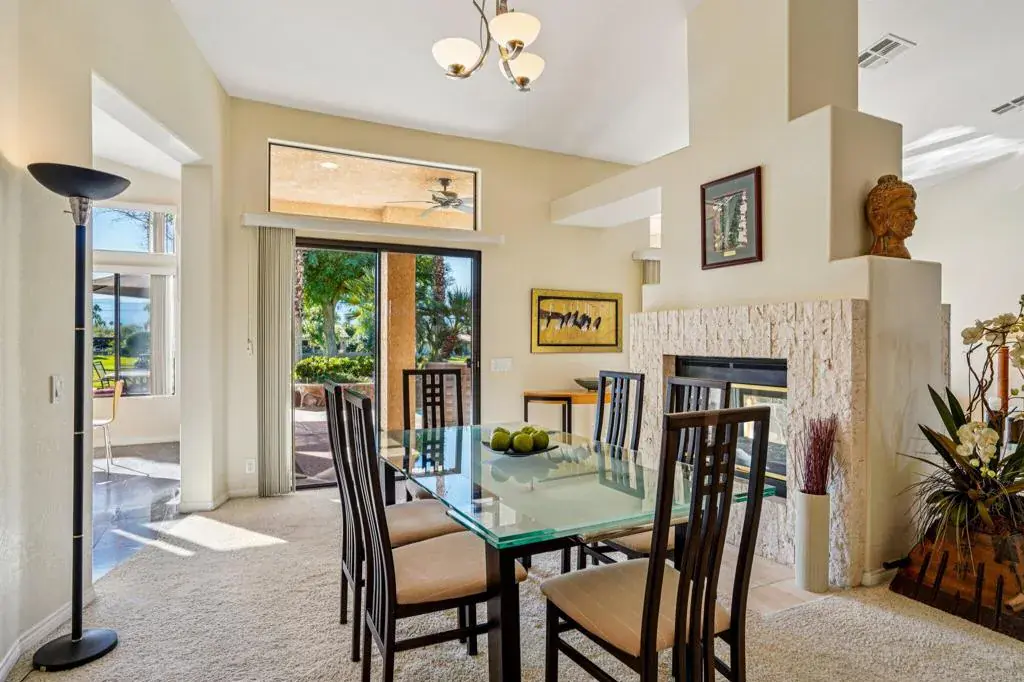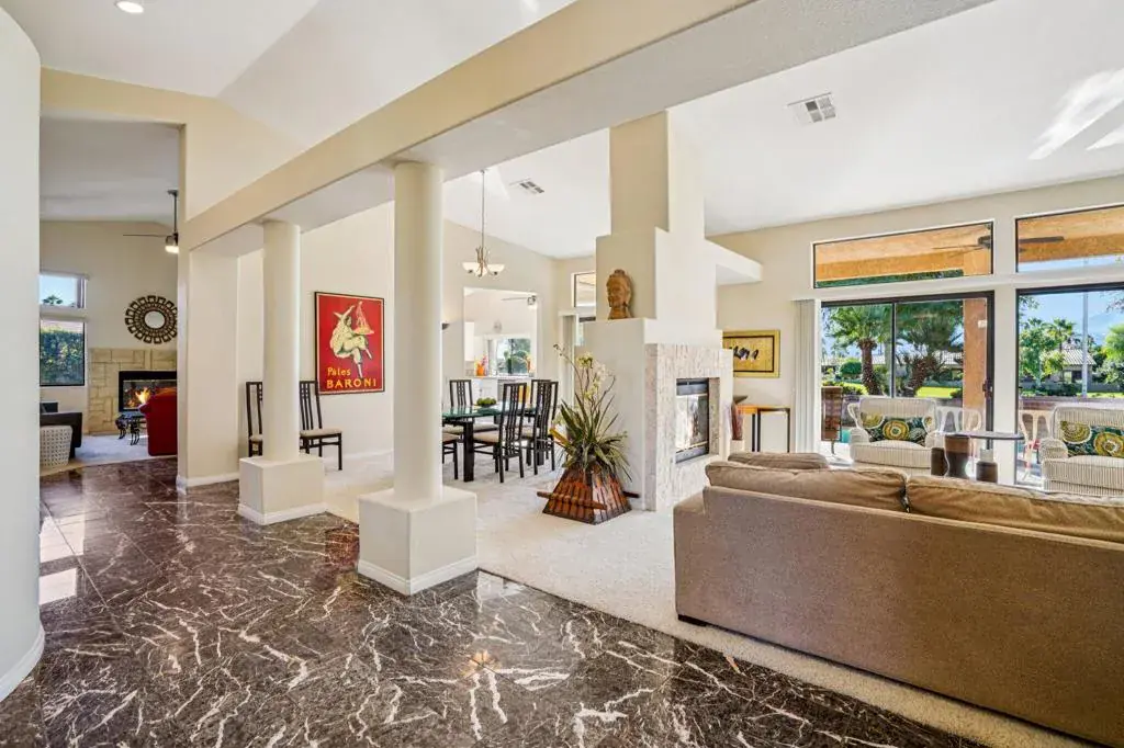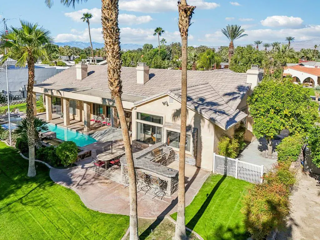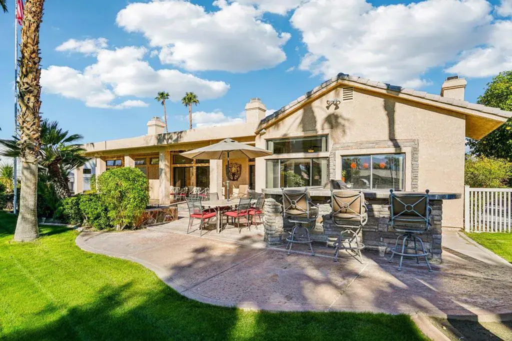 Experience exceptional fairway living in the historic Bermuda Dunes Country Club. This single-level turnkey furnished home sits on a beautifully landscaped lot with sweeping golf-course and mountain views, offering both privacy and a strong connection to the outdoors.The open floor plan is bright and spacious, featuring a double-sided fireplace anchoring the great room, with additional fireplaces in the den and the primary suite. The primary suite occupies its own private wing and includes a comfortable den with fireplace, while two guest bedrooms on the opposite side each offer ensuite baths.The backyard is designed for easy indoor-outdoor living, complete with a pool, spa, calming water features, and a well-appointed outdoor kitchen–ideal for everyday relaxation or entertaining.Additional highlights include a three-car garage for two large cars and one for a small car or golf cart, and excellent closet and storage space throughout.Located in a prime central area, the home is minutes from El Paseo, the Coachella Valley Fairgrounds, Acrisure Arena, the Indian Wells Tennis Garden, Old Town La Quinta, Downtown Indio, and more. Low HOA of $220/month includes cable and internet.