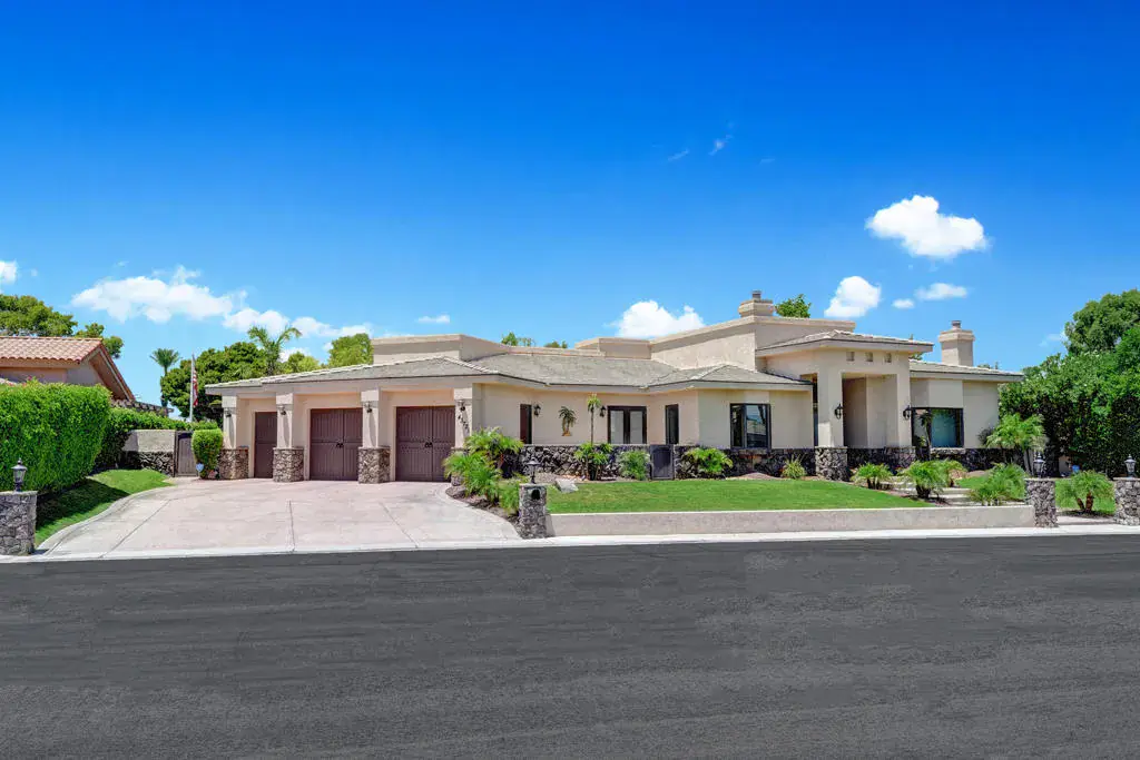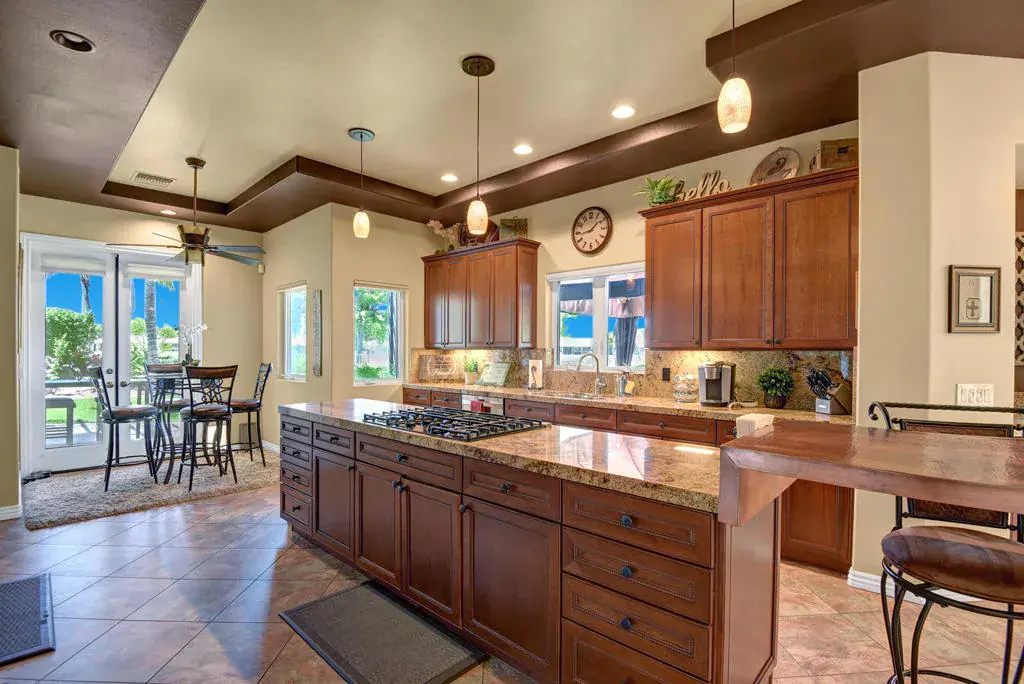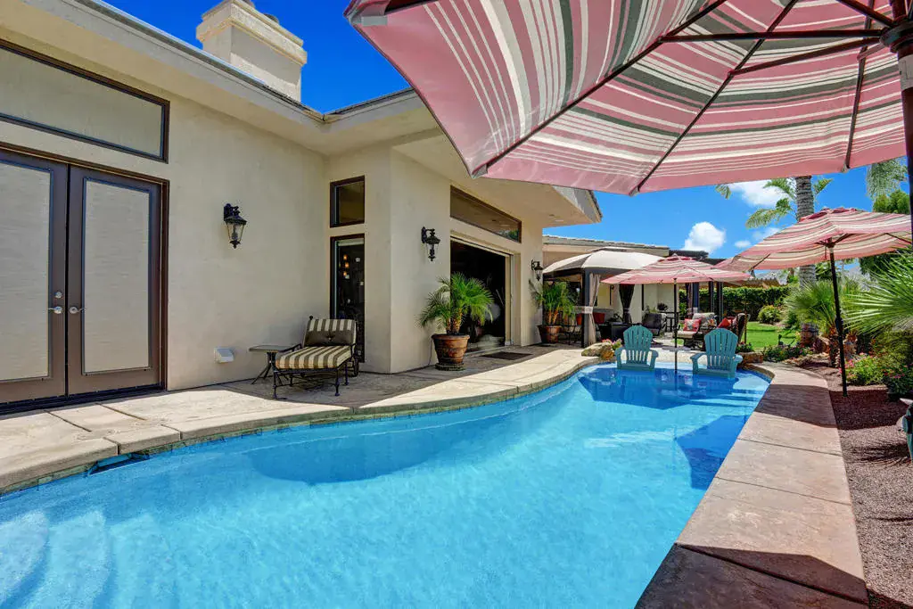 Come enjoy this custom built home located in Bermuda Dunes Country Club, offering over 4,000 sq. ft. of living space with 4 bedrooms, 4.5 bathrooms, and a view that can’t be beat! Upon entering you are greeted by a beautiful water feature and a family room fit for family lounging or entertaining on any scale. The living room hosts large glass pocket doors that can be folded back to create a gorgeous indoor/outdoor area. Perfect for conversation and a cocktail with friends and family while you enjoy a sunset view of the pool and golf course. If you prefer the outdoors, this home offers stylish and comfortable garden furniture with a fire-table for those chilly nights. There is a private pool and spa with a tanning shelf for your enjoyment, and a BBQ for outdoor cooking and dining. Back in the home there is a large flat screen television in the family room with a beautiful stacked stone fireplace and easy access to the fully stocked kitchen. The kitchen is nicely upgraded with granite counter tops, stainless steel appliances, and a long counter perfect for any chef who needs prep space. The master bedroom features a king bed with a large luxurious bathroom and walk in closet. The second and third bedrooms each offer king beds and their own private bathrooms. The fourth suite offers a queen bed with private bathroom. Book now for a spectacular home in a community nationally recognized for its rich history and star studded guest list.