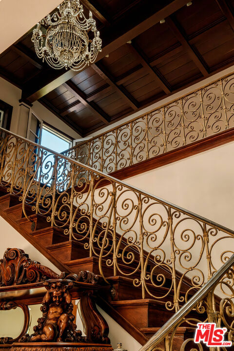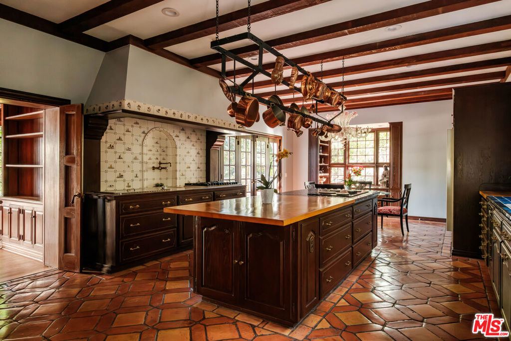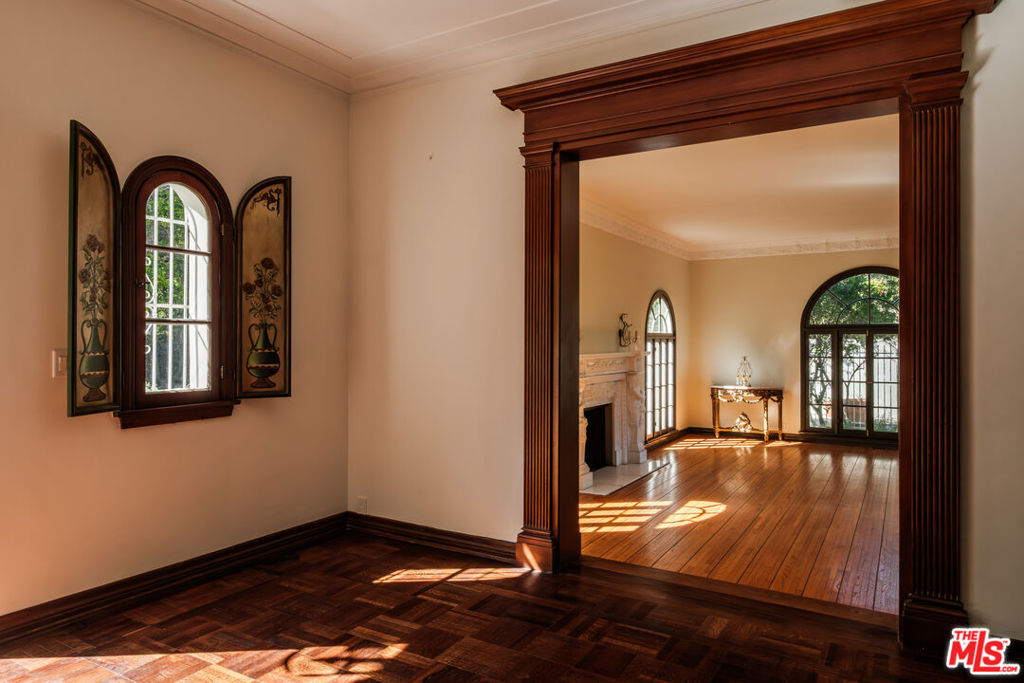 Designed by renowned architect Paul Williams, this stately Spanish Colonial Revival residence reflects the timeless elegance of Beverly Hills’ golden architectural era. The 4-bedroom, 3.5-bath main home spans approximately 4,171 square feet on a sprawling 19,107-square-foot lot, offering exceptional scale, privacy, and classic character in a prestigious North of Sunset location, moments from the Beverly Hills Hotel. A symmetrical fade, smooth stucco exterior, and clay tile roof introduce interiors defined by grand proportions and beautifully preserved period details. A formal foyer with parquet flooring opens to gracious living and entertaining spaces highlighted by soaring ceilings, crown moldings, arched windows, and French doors that fill the home with natural light. The formal living room features an ornate carved marble decorative fireplace, while a richly paneled library with built-in shelving and French doors offers a refined retreat. Architectural details throughout include rich hardwood floors, elegant millwork, crystal chandeliers, and decorative wall sconces. The kitchen blends warmth and character with wood-beamed ceilings, custom cabinetry, terracotta-style tile flooring, decorative tile-work, and a generous center island. The beautifully updated primary bath features marble finishes, a freestanding soaking tub, and glass-enclosed shower, thoughtfully blending modern comfort with the home’s historic character. French doors open to patios, lawn, and lush gardens surrounding a large pool and spa, creating a backyard setting reminiscent of Tuscany. The grounds are enhanced by numerous citrus trees, mature landscaping, and a wonderful sense of privacy. A pool house with 3/4 bath offers added flexibility, while abundant on-site parking provides rare convenience for residents and guests. A distinctive lease opportunity offering architectural pedigree, timeless craftsmanship, and classic Beverly Hills living.