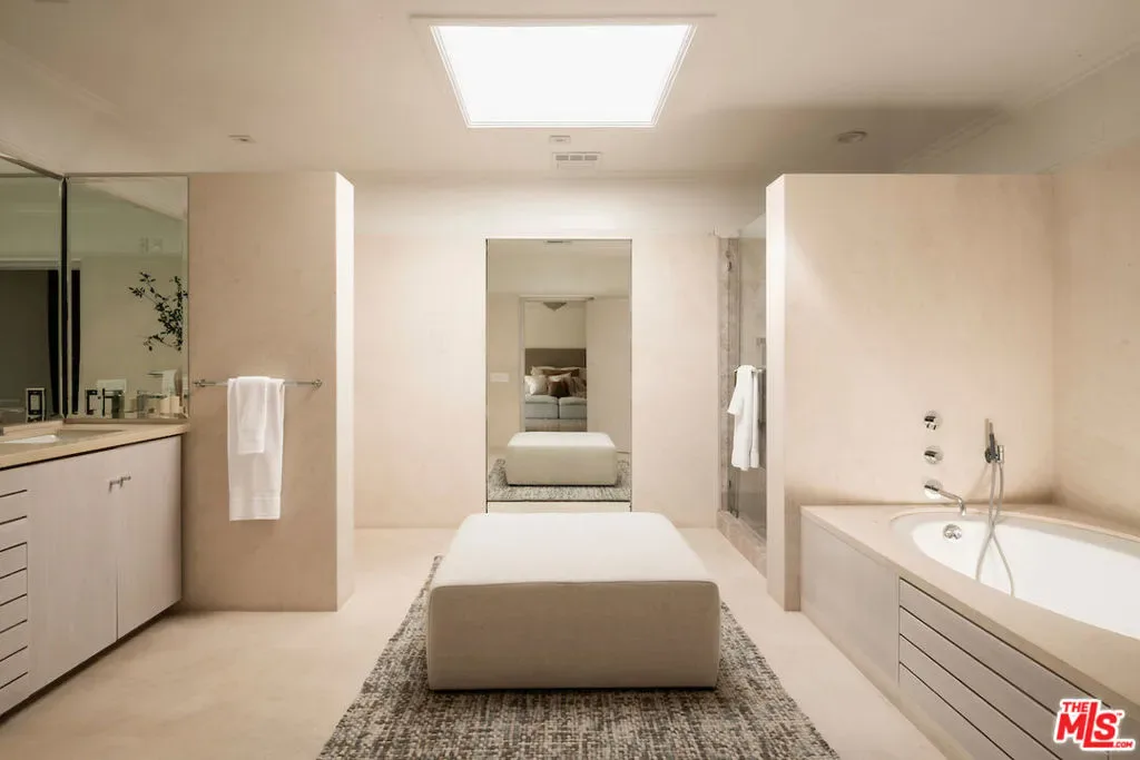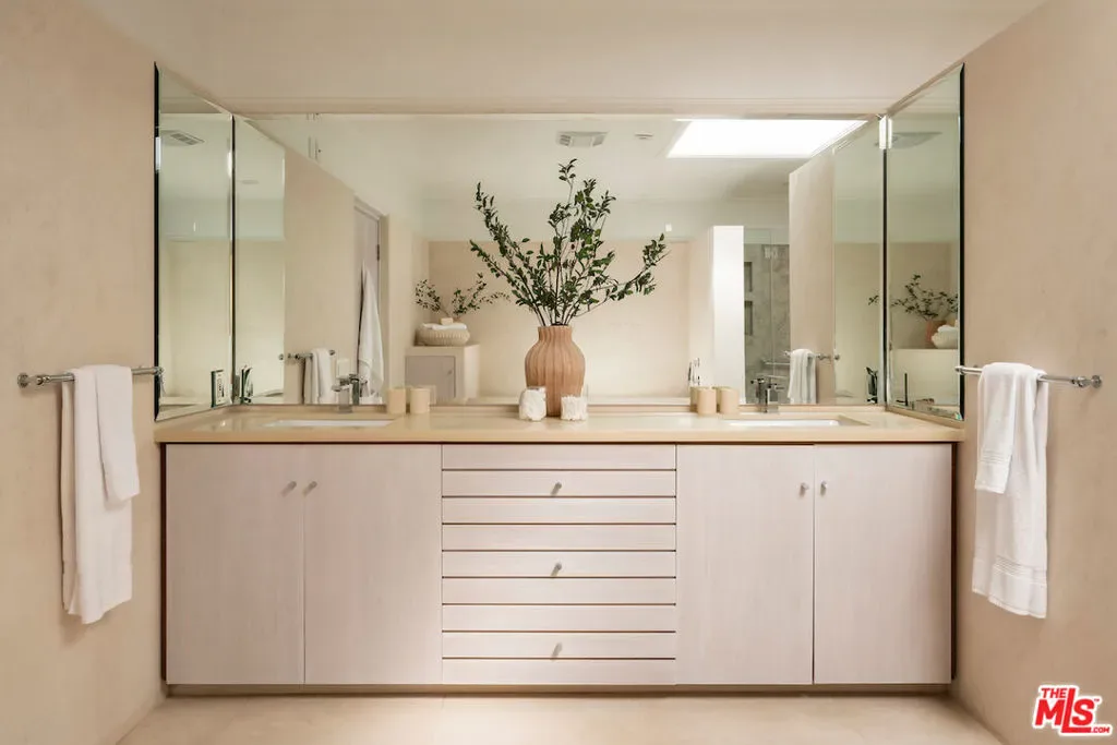 Situated in the coveted lower Trousdale Estates of Beverly Hills, this gated Mid-Century residence offers single-level living on a sprawling 21,600-square-foot lot. Clean architectural lines and a refined, open layout define the interiors, offering a seamless blend of classic design and modern livability. A formal entry unfolds into a refined composition of living spaces, including a formal living room with fireplace, an intimate den with a second fireplace, and a formal dining room, each framed by walls of floor-to-ceiling glass and sliding doors that bathe the interiors in natural light while seamlessly dissolving the boundary between indoors and out. The newly updated kitchen is both functional and striking, featuring dual islands, top-tier appliances, and a substantial walk-in pantry. A private office is thoughtfully integrated into the layout. The main residence comprises four bedrooms, anchored by an expansive primary suite offering dual walk-in closets and a spa-caliber en-suite bath appointed with a soaking tub, separate shower, and a generously scaled vanity. A detached approximately 950-square-foot guest house with one bedroom and one bathroom provides a private and well-appointed retreat for guests. The grounds evoke a tranquil, resort-like setting, enveloped by mature landscaping and dotted with abundant citrus trees that enhance both privacy and ambiance. A large pool with a diving board serves as the focal point of the outdoor experience, complemented by a covered patio with fireplace and a fully equipped outdoor kitchen designed for effortless al fresco living and entertaining. Subtle peek-a-boo city views complete the offering. A rare opportunity to own a timeless Mid-Century residence in one of Beverly Hills’ most prestigious enclaves, moments from the city’s finest dining, shopping, and entertainment.