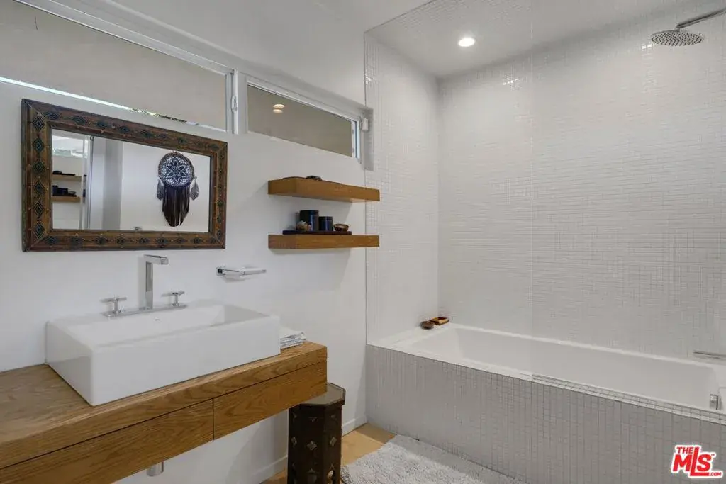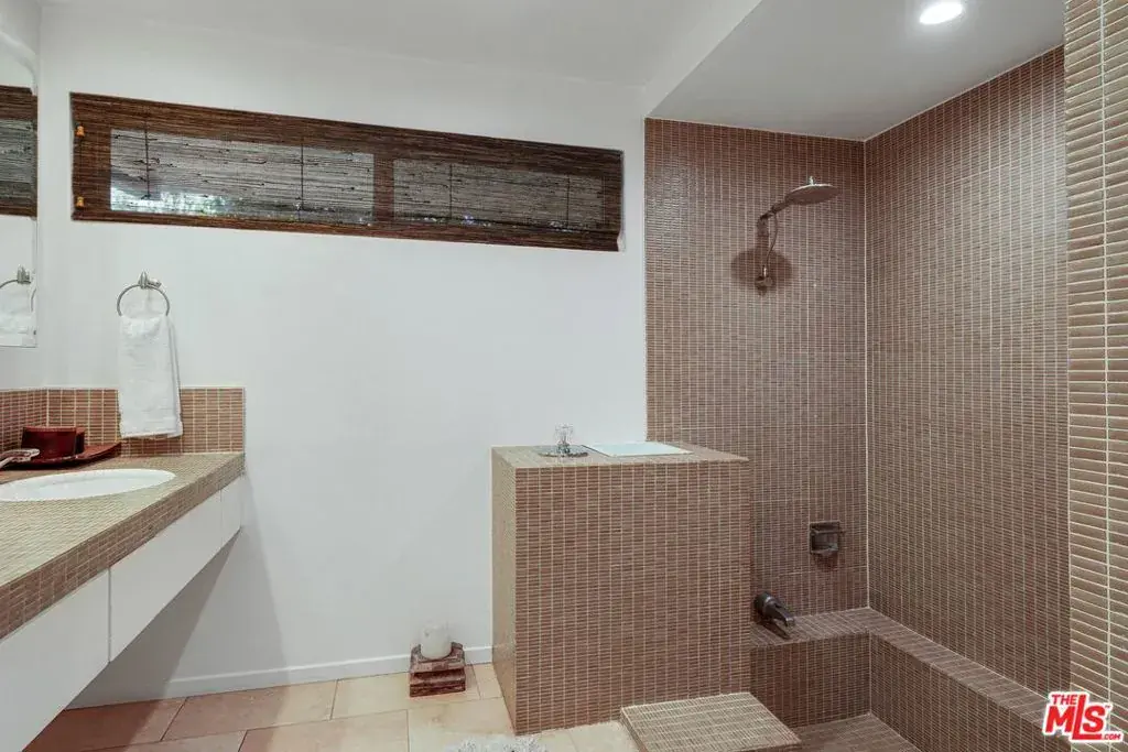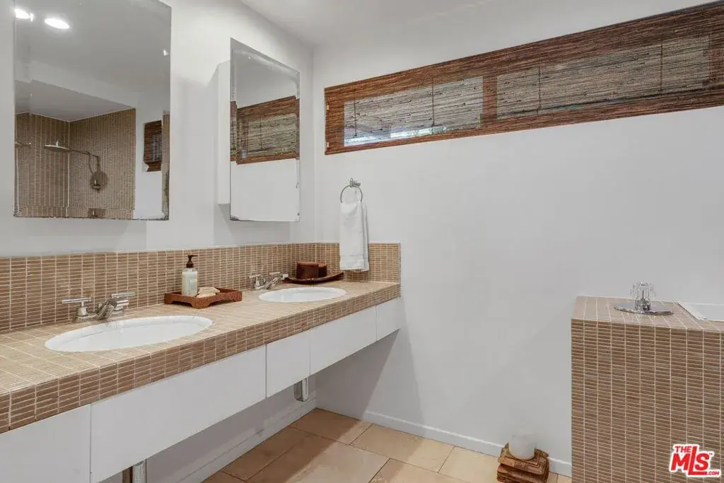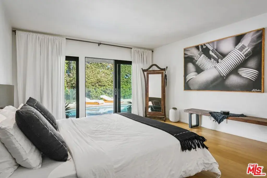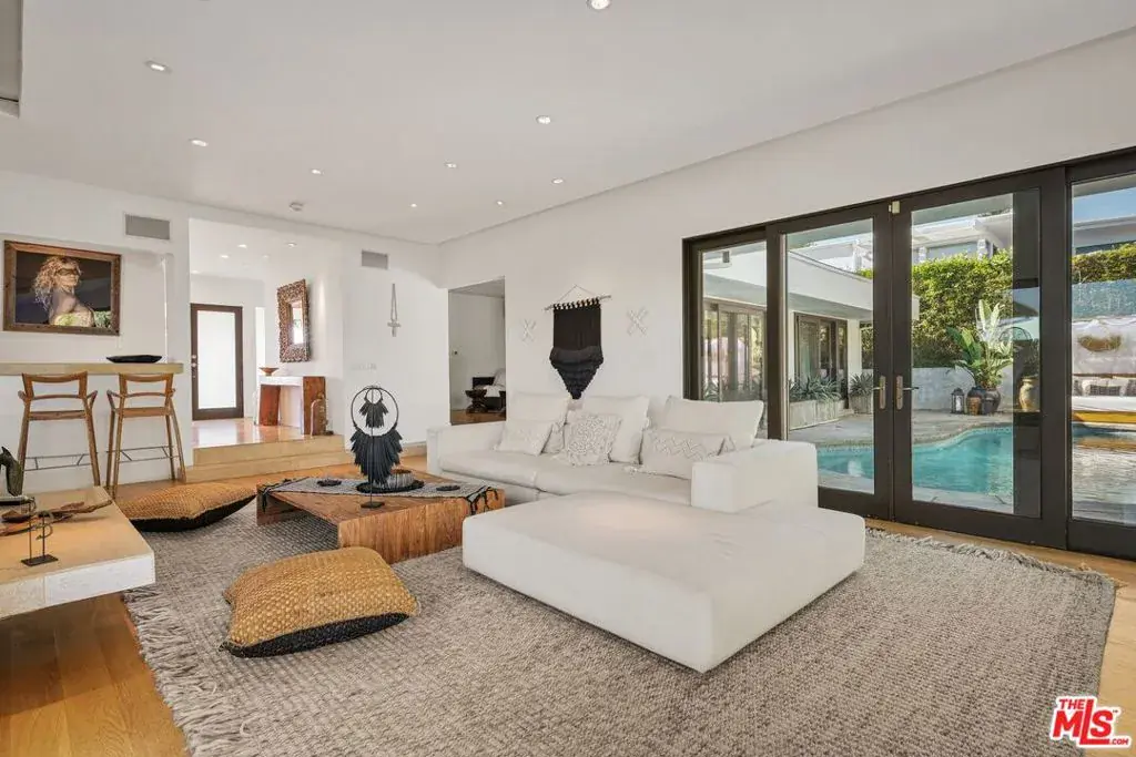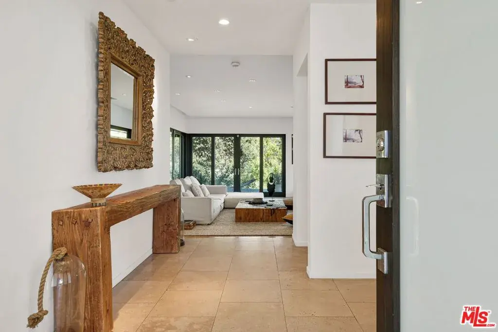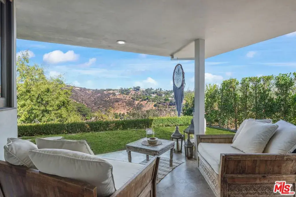 Atop a cul-de-sac street in Beverly Hills Post Oce, this single-level fully furnished and spacious Zen-like contemporary is private abode. Numerouspublic figures have quietly lived here. Interior design elements include furniture and art from Bali, Thailand and South Africa. The layout presents a 2-bed, 3-bath retreat with seamless indoor to outdoor flow and open concept living arrangements. Organic finishes and sliding doors lead you outside to an entertaining haven with Pool and dreamy Cabana. In the kitchen, Viking appliances and wood countertops provide an easy cooking convenience for the pro or novice chef. The primary bedroom features a large walk-in closet and beautifully tiled dual sink bath with a step-down shower. Being surrounded by lush greenery creates a serene enclave while the endless canyon and city views remind you of the close proximity and access to one of the world’s greatest cities. Photos may not reflect current artwork and furnishing.