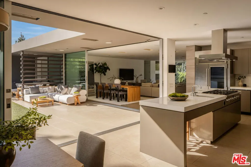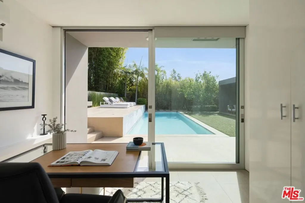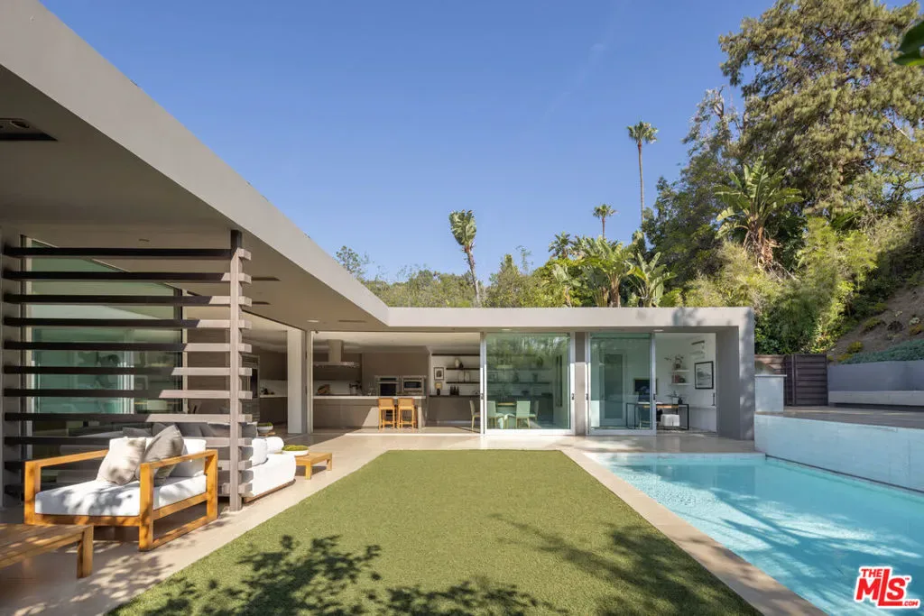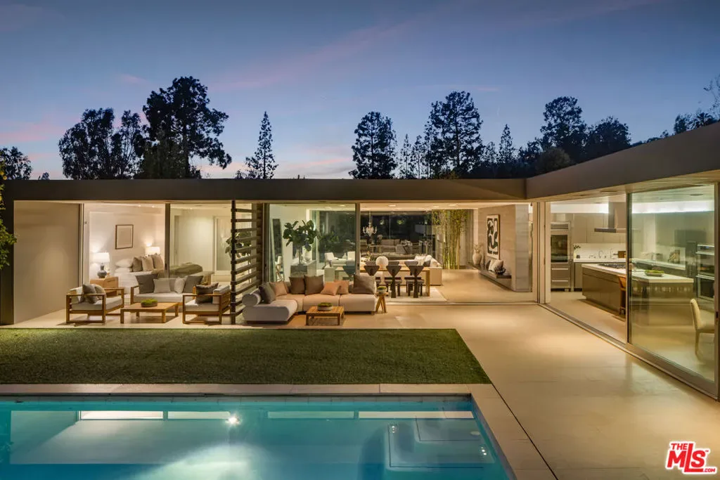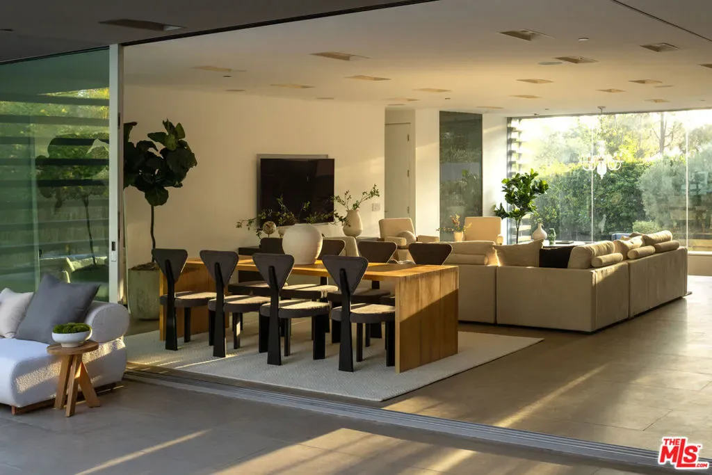 Beyond private gates and an extended motor court, this contemporary architectural by renowned architect Shubin & Donaldson, offers privacy, scale, and seamless indoor-outdoor living just moments from the best of Beverly Hills and Century City. Clean lines, rich wood detailing, and warm interiors are framed by walls of glass that draw natural light deep into the home. The open floorplan is both expansive and intentional, allowing each space to transition naturally into the next. A generously scaled formal living room is anchored by a sunken sitting lounge, while the adjacent dining room flows effortlessly into the kitchen and opens to the outdoors for easy entertaining. The chef-caliber kitchen is centered around an eat-in island and appointed with streamlined cabinetry, professional-grade appliances, and a breakfast nook overlooking the grounds. Just beyond, an office with a full bath offers flexibility as a private studio, guest retreat, or executive workspace. The primary suite opens to a private outdoor lounge deck and features a large walk-in closet with extensive built-ins, along with a marble-clad ensuite bath complete with a dual-sink vanity, soaking tub, and separate shower. Additional guest suites are well-proportioned and thoughtfully positioned for comfort.The backyard is designed for year-round enjoyment, featuring a flat grassy lawn bordered by mature landscaping, multiple lounge areas positioned for sun and shade, a fire pit for evening gatherings, and a dedicated barbecue area. An elevated sundeck overlooks the pool, creating a layered outdoor setting suited for both entertaining and quiet retreat. Combining architectural clarity with a highly functional layout, this residence offers comfort and convenience in one of the city’s most desirable neighborhoods, moments from the premier dining, shopping, and cultural destinations of Beverly Hills and Century City.
