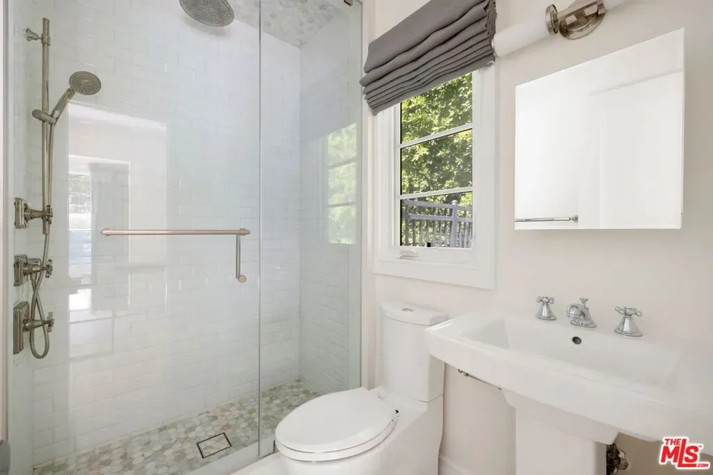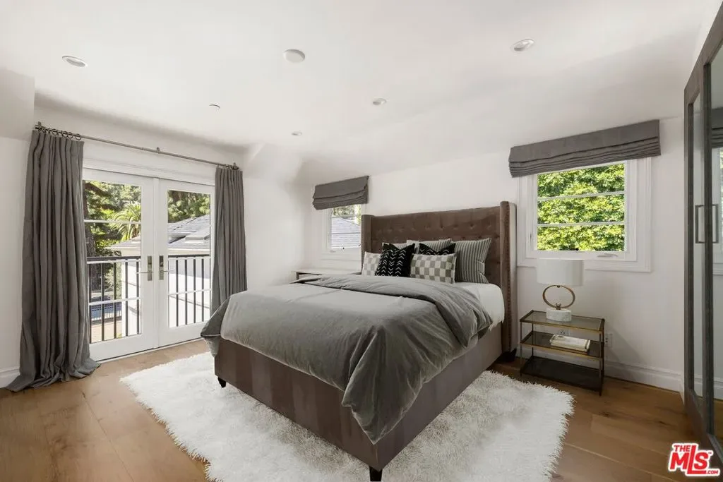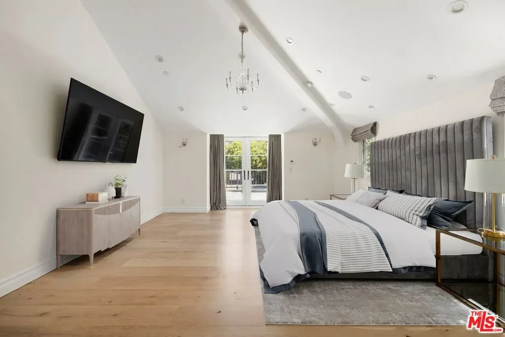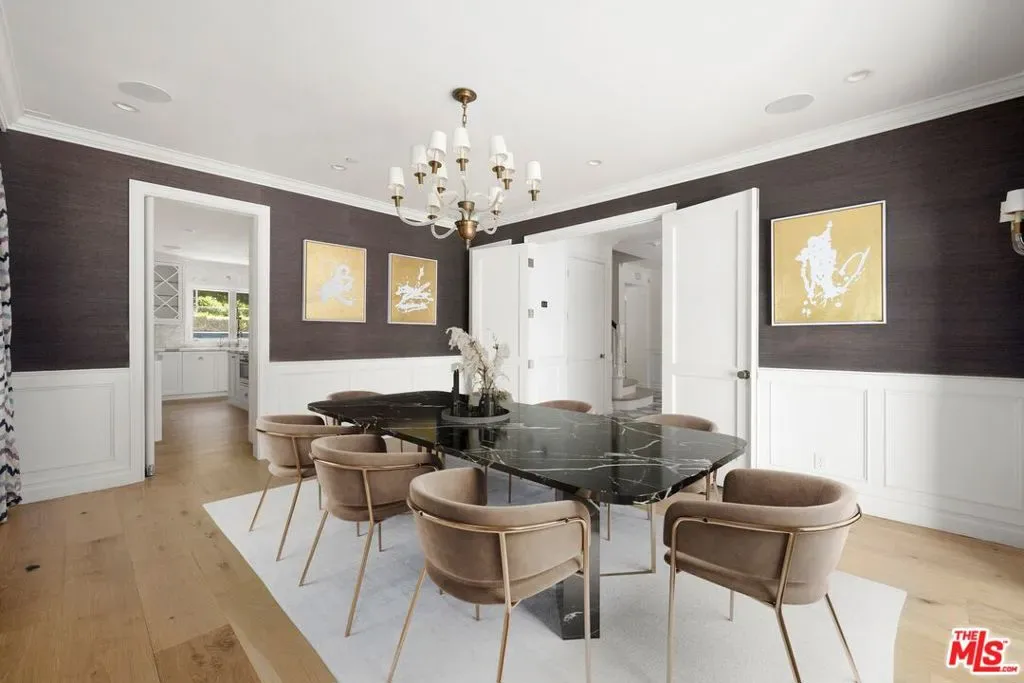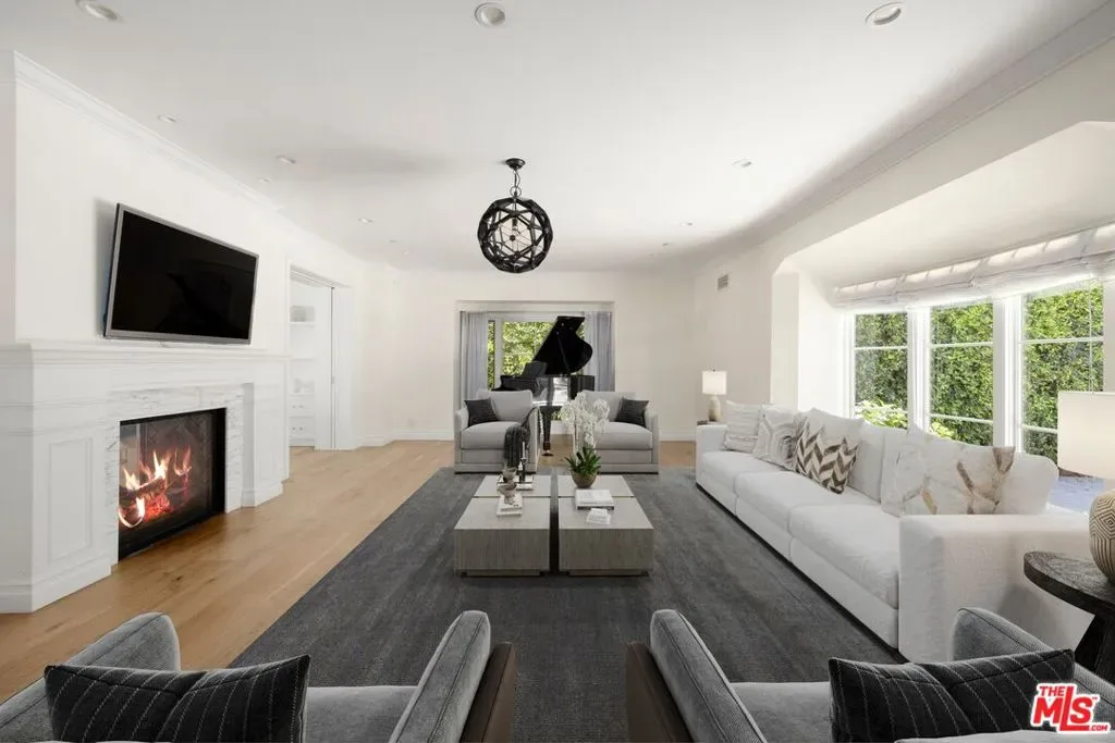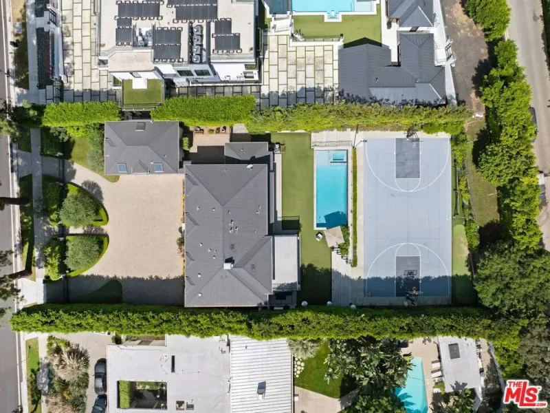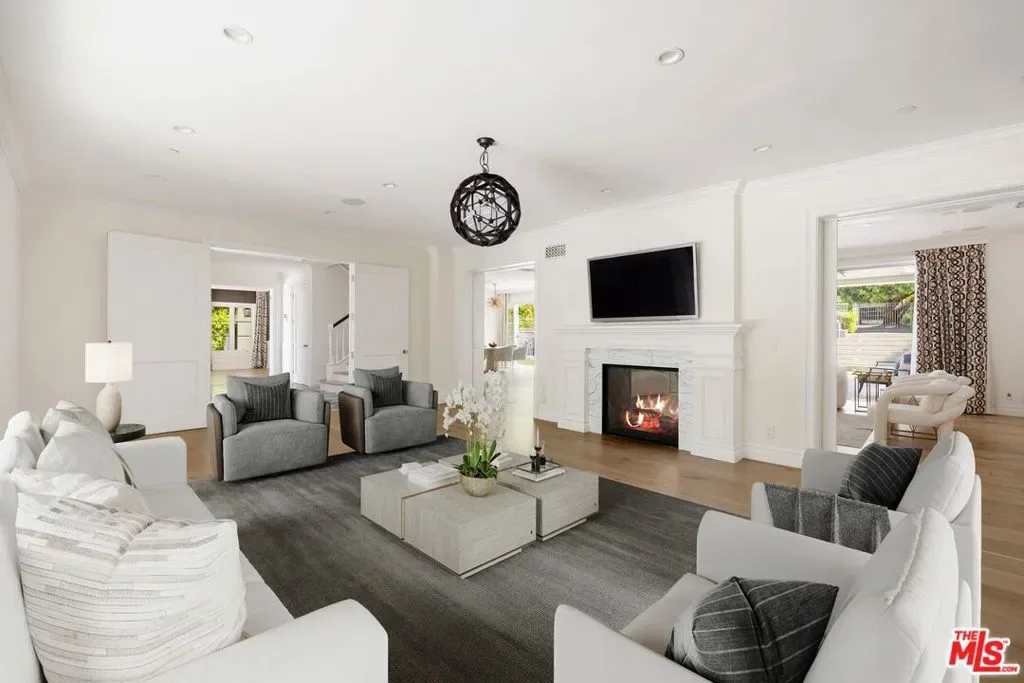 Set behind a large motor court on an expansive private lot, this fully furnished Paul Williams-style residence is a rare Beverly Hills retreat designed for effortless entertaining. The gracious main level unfolds through a formal living room with a fireplace and light-filled bay window, a formal dining room, and a secondary living room featuring a fireplace, custom built-ins, and disappearing glass doors that open directly to the outdoor living areas – creating a coveted indoor-outdoor flow. The marble-clad kitchen is outfitted with stainless steel appliances, including a Wolf range, and opens to a breakfast area, while a spiral staircase leads to the second level. Upstairs, the luxurious primary suite offers vaulted ceilings, a private balcony, and a spa-like en suite bath, complemented by well-appointed guest rooms throughout the home. Thoughtfully designer-decorated, the property includes five bedrooms and four-and-a-half baths, plus a fully detached one-bedroom guest house of approximately 700 square feet with its own kitchen. The resort-style grounds feature a full-size basketball court, pickleball court, pool, and direct private access to nearby hiking trails, all just moments from the best of Beverly Hills shopping, dining, and entertainment.