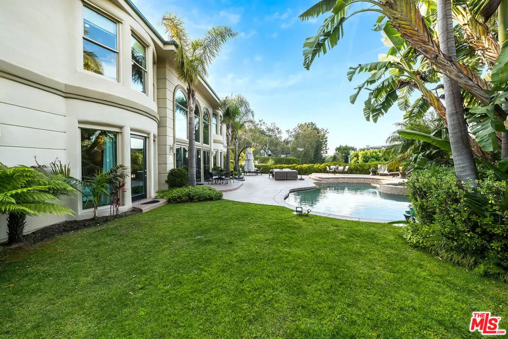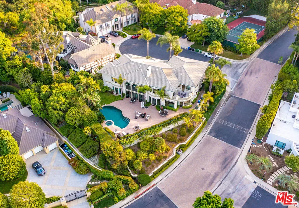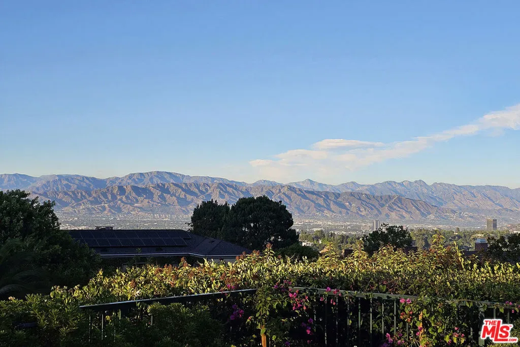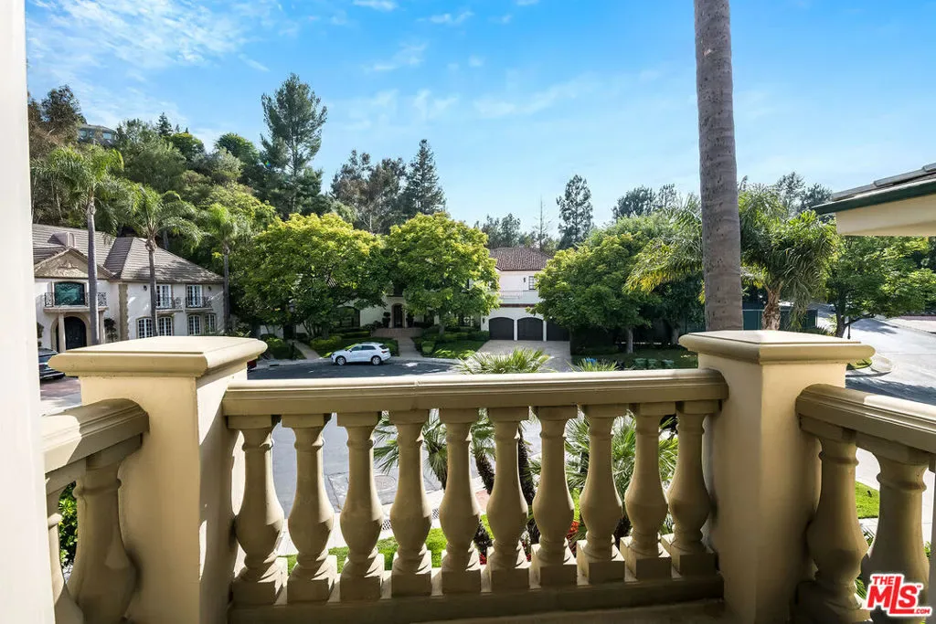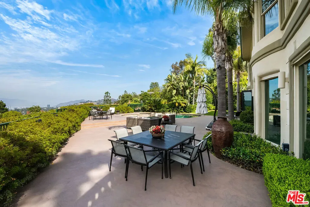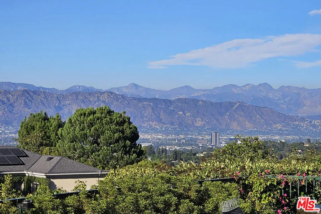 Nestled in the exclusive 24-hour guard-gated enclave of The Summit above Beverly Hills, the magnificent Contemporary Villa offers the ultimate in privacy, luxury, and serenity, all just minutes from the vibrant heart of Beverly Hills and Studio City. Situated atop a small knoll at the end of a peaceful cul-de-sac on a premier corner lot, the graceful estate features spectacular city, canyon, and mountain views, providing a sense of tranquility, charm, comfort, and privacy in one of Los Angeles’ most exclusive enclaves. This timeless estate spans just under 7,000 sq.ft. on an approx. 16,216 sq.ft. lot, perfectly blending modern luxury with classic architectural detail. A grand arched entry with intricate textured glass and palm frond sculpted iron double front doors open to a formal foyer with travertine floors and a sweeping curved staircase, setting the tone for the sophistication found throughout. The formal living room impresses with soaring two-story ceilings, a stately fireplace, built-in granite bar, and walls of arched windows and glass doors that flood the space with natural light and open to the backyard oasis. Every ceiling is sculptural. Heated floors in both the living room and gourmet kitchen add comfort and refinement. Art lovers will appreciate the abundant wall space and thoughtful niches throughout the home, perfect for displaying a curated collection. The large formal dining room features a long built-in buffet with cabinetry, and matching arched ceiling, ideal for elegant entertaining. The chef’s kitchen featuring two clear-span curved glass windows is equipped with professional-grade appliances, a large granite center island, and an adjoining breakfast room that seamlessly flows into the inviting family room. A powder room, guest bedroom and bathroom, media/screening room, and laundry room complete the lower level. Upstairs, two spacious guest or family bedrooms each offer ensuite baths, while the expansive primary suite is a true sanctuary, complete with private balconies overlooking breathtaking vistas, massive dual custom walk-in closets, and a marble-clad bath featuring dual vanities and commodes, a soaking tub, separate steam shower, and an adjoining gym. The resort-like backyard is an entertainer’s dream, with generous patio space surrounding the pool and spa, tropical-inspired landscaping, and grass area, all set against the dramatic backdrop of panoramic views. A three-car attached garage provides ample space for vehicles and storage. Offering an exceptional lifestyle in a secure, sought-after community, this remarkable estate embodies peaceful, private living with effortless access to all the best of Beverly Hills and beyond.