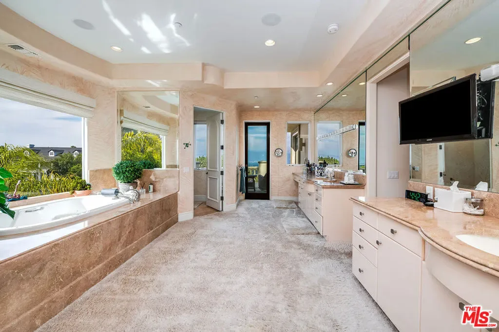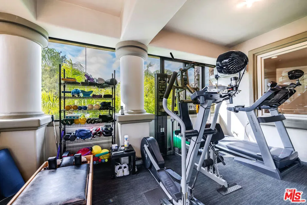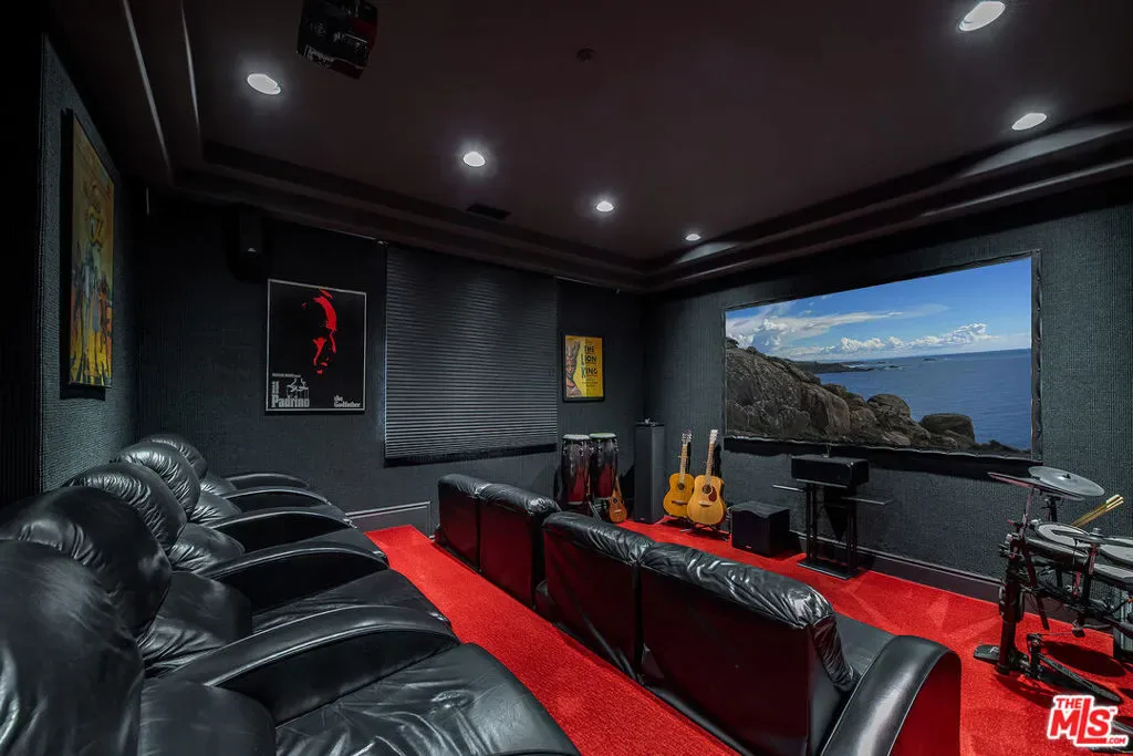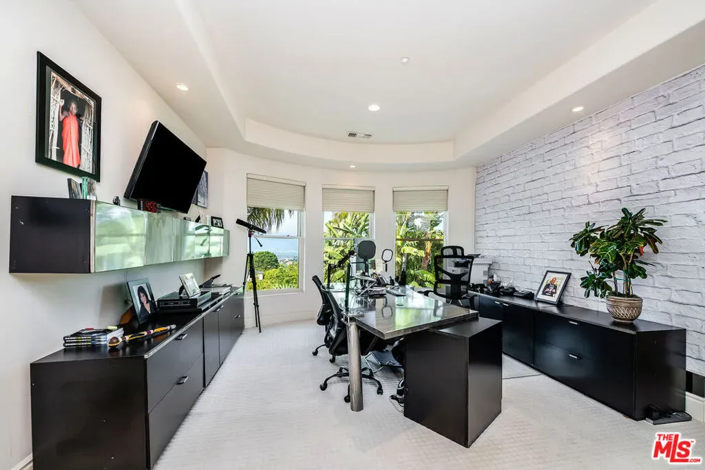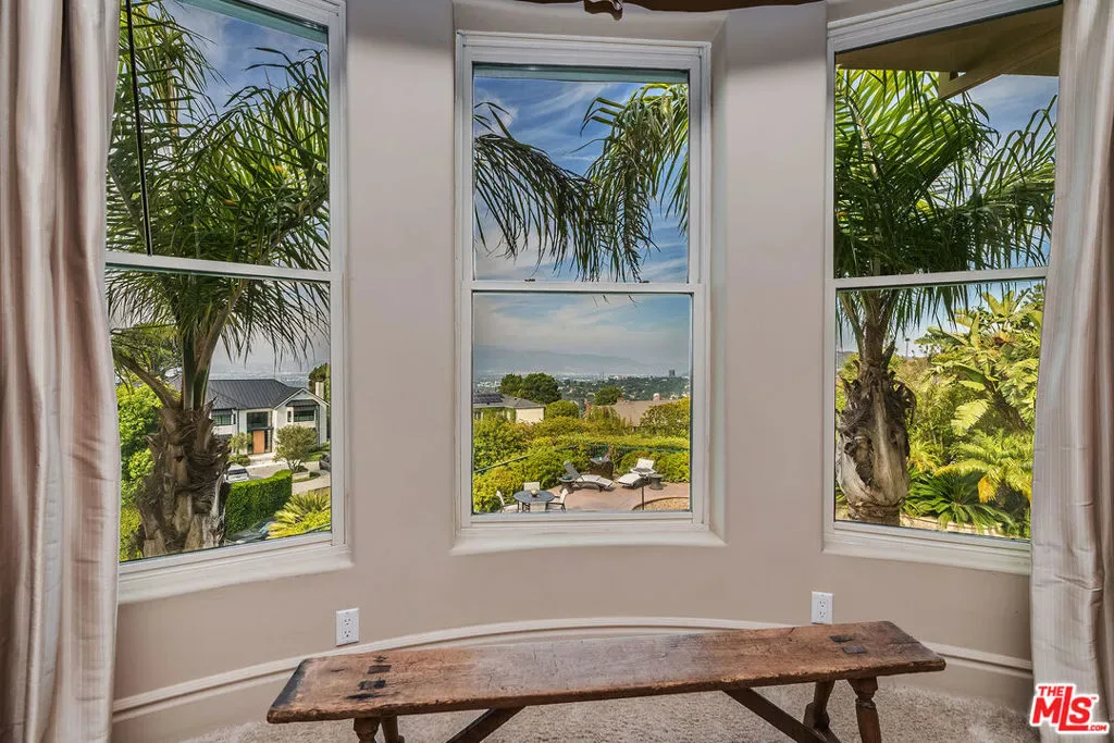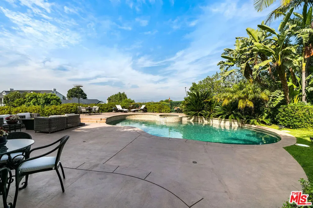Nestled in the exclusive 24-hour guard-gated enclave of The Summit above Beverly Hills, the magnificent Contemporary Villa offers the ultimate in privacy, luxury, and serenity, all just minutes from the vibrant heart of Beverly Hills and Studio City. Situated atop a small knoll at the end of a peaceful cul-de-sac on a premier corner lot, the graceful estate features spectacular city, canyon, and mountain views, providing a sense of tranquility, charm, comfort, and privacy in one of Los Angeles’ most exclusive enclaves. This timeless estate spans just under 7,000 sq.ft. on an approx. 16,216 sq.ft. lot, perfectly blending modern luxury with classic architectural detail. A grand arched entry with intricate textured glass and palm frond sculpted iron double front doors open to a formal foyer with travertine floors and a sweeping curved staircase, setting the tone for the sophistication found throughout. The formal living room impresses with soaring two-story ceilings, a stately fireplace, built-in granite bar, and walls of arched windows and glass doors that flood the space with natural light and open to the backyard oasis. Every ceiling is sculptural. Heated floors in both the living room and gourmet kitchen add comfort and refinement. Art lovers will appreciate the abundant wall space and thoughtful niches throughout the home, perfect for displaying a curated collection. The large formal dining room features a long built-in buffet with cabinetry, and matching arched ceiling, ideal for elegant entertaining. The chef’s kitchen featuring two clear-span curved glass windows is equipped with professional-grade appliances, a large granite center island, and an adjoining breakfast room that seamlessly flows into the inviting family room. A powder room, guest bedroom and bathroom, media/screening room, and laundry room complete the lower level. Upstairs, two spacious guest or family bedrooms each offer ensuite baths, while the expansive primary suite is a true sanctuary, complete with private balconies overlooking breathtaking vistas, massive dual custom walk-in closets, and a marble-clad bath featuring dual vanities and commodes, a soaking tub, separate steam shower, and an adjoining gym. The resort-like backyard is an entertainer’s dream, with generous patio space surrounding the pool and spa, tropical-inspired landscaping, and grass area, all set against the dramatic backdrop of panoramic views. A three-car attached garage provides ample space for vehicles and storage. Offering an exceptional lifestyle in a secure, sought-after community, this remarkable estate embodies peaceful, private living with effortless access to all the best of Beverly Hills and beyond.