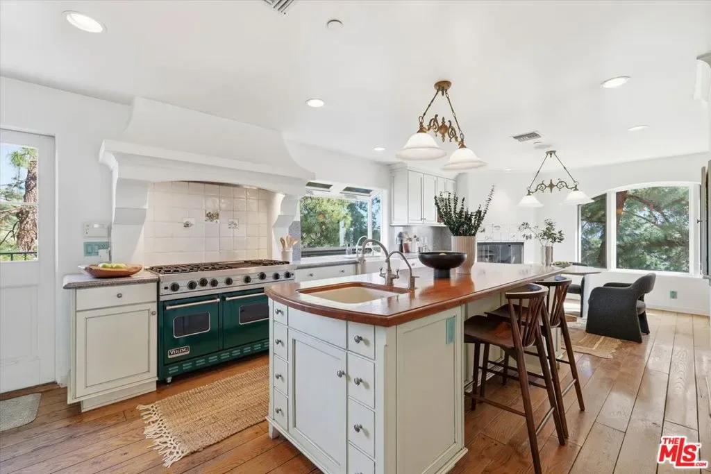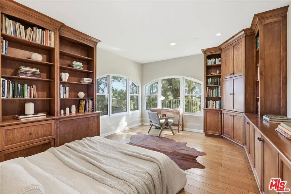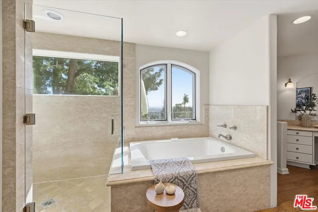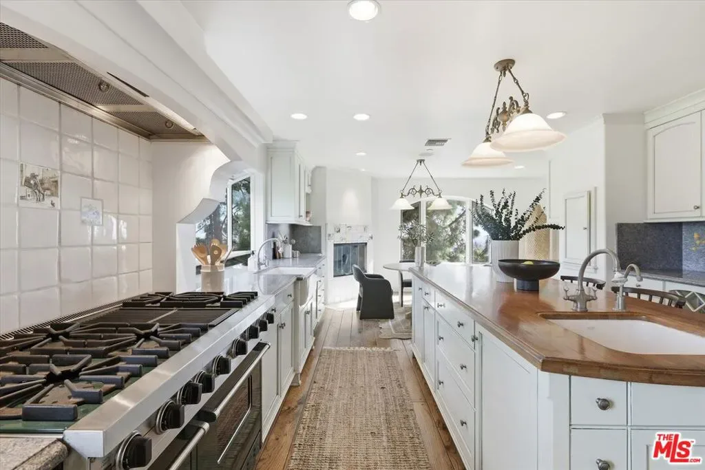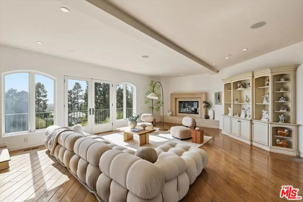 A true sanctuary of elegance and privacy, this extraordinary estate sits atop a ridge in exclusive Beverly Hills on nearly 34,000 sq. ft. of prime land, offering commanding, unobstructed views of the city below and beyond to Santa Monica and across the bay to Palos Verdes. A gated entrance and private driveway lead you to a spacious motor court and a three-car garage, setting the tone for the exclusivity within. Step inside, where timeless charm meets modern sophistication. The foyer welcomes you into an open living space bathed in natural light, with French doors framing the dazzling cityscape beyond. The living room, adorned with a fireplace, seamlessly connects to a gracious dining area, perfect for hosting unforgettable evenings. The chef’s kitchen is a masterpiece of design and functionality, boasting a center island, top-of-the-line professional appliances, and a cozy breakfast nook with its own fireplace. Every culinary moment here is elevated by the serene ambiance. Descend to the lower level, where luxury knows no bounds. An inviting bedroom suite plus an additional room with custom built-ins provide both comfort and utility, but the true highlight is the magnificent primary suite. This retreat features a fireplace, dual spa-like baths, a walk-in closet, and French doors that open to the sparkling lap pool and spa; your private oasis. The top floor is an entertainer’s dream, offering a relaxing family room with a fireplace, a grand built-in bar, and a deck that showcases breathtaking, glittering views of the evening’s city lights. Whether hosting soires or enjoying quiet moments, this space is simply unparalleled. As if that weren’t enough, a detached, nearly 500sf guest house perched above the garage provides ultimate flexibility and privacy. Complete with a private entrance, kitchenette, and bathroom, it’s a perfect haven for guests or staff. Nestled above the hustle and bustle of the globally renowned city of Beverly Hills and enveloped in tranquility, this estate offers the best of both worlds: serene living and the vibrant allure of city life below. This is more than a home, it’s a lifestyle of distinction.