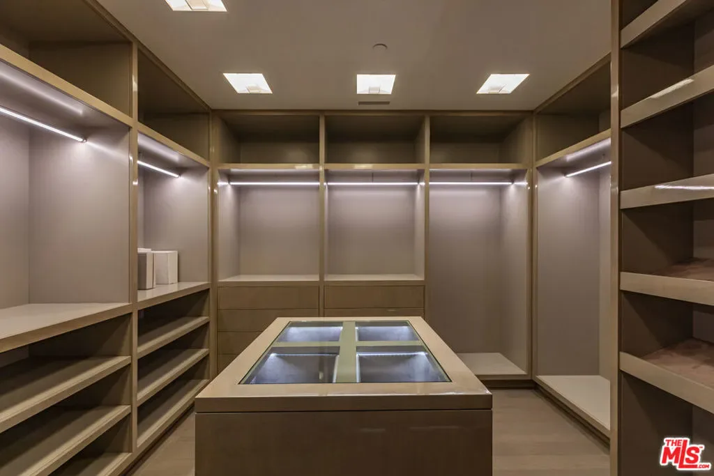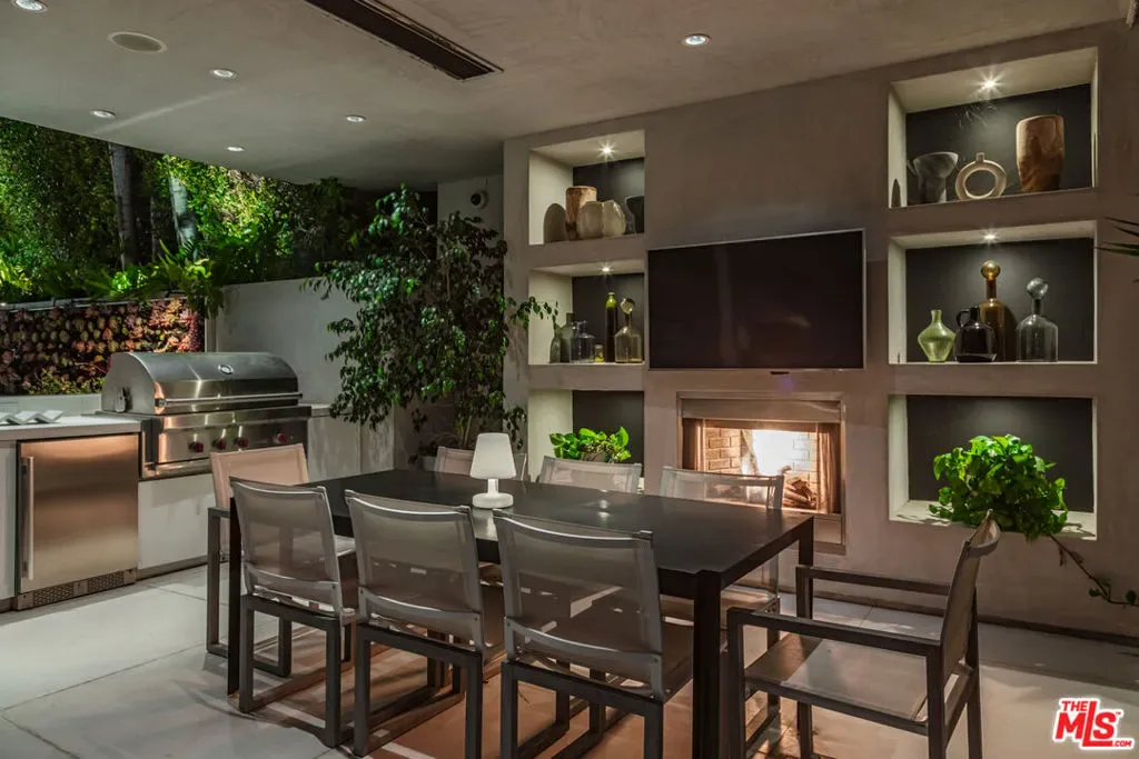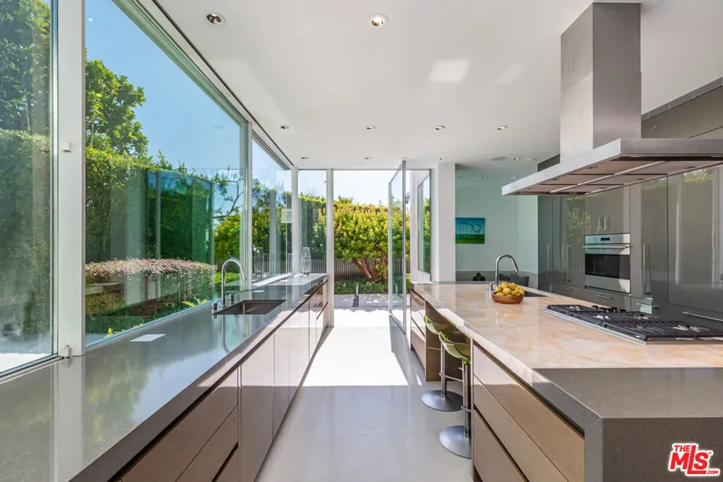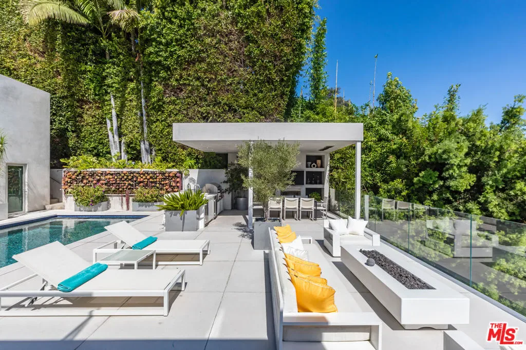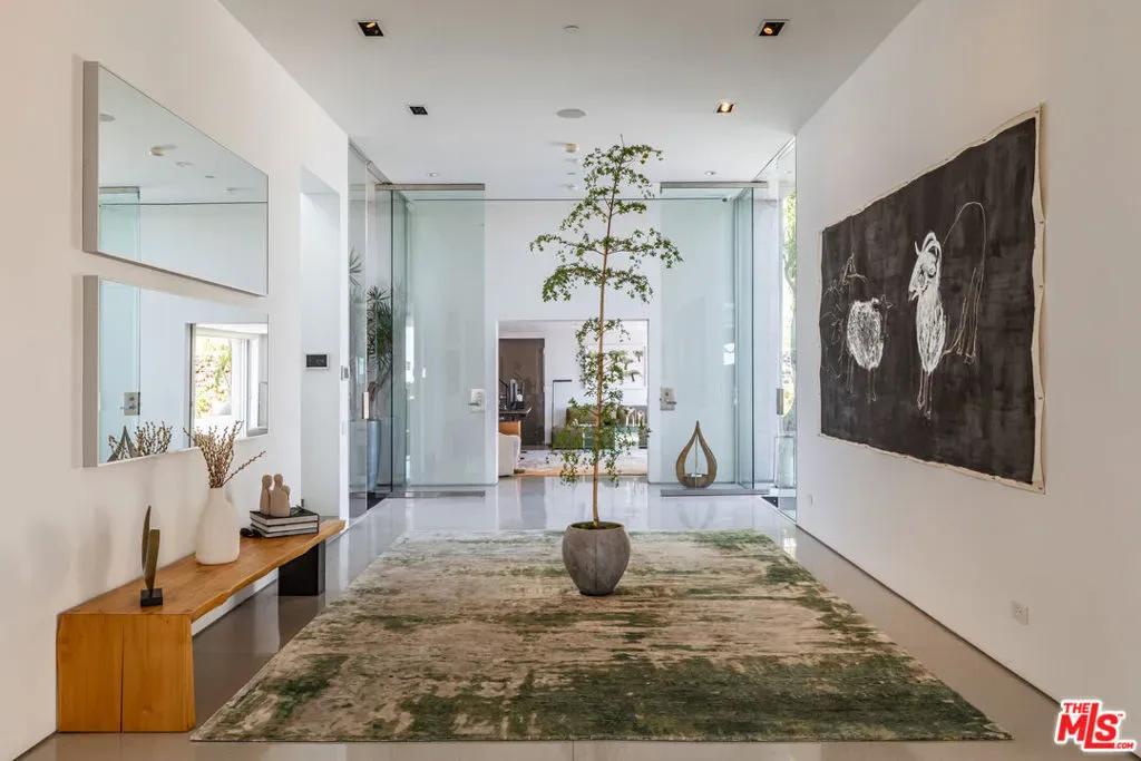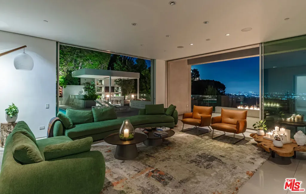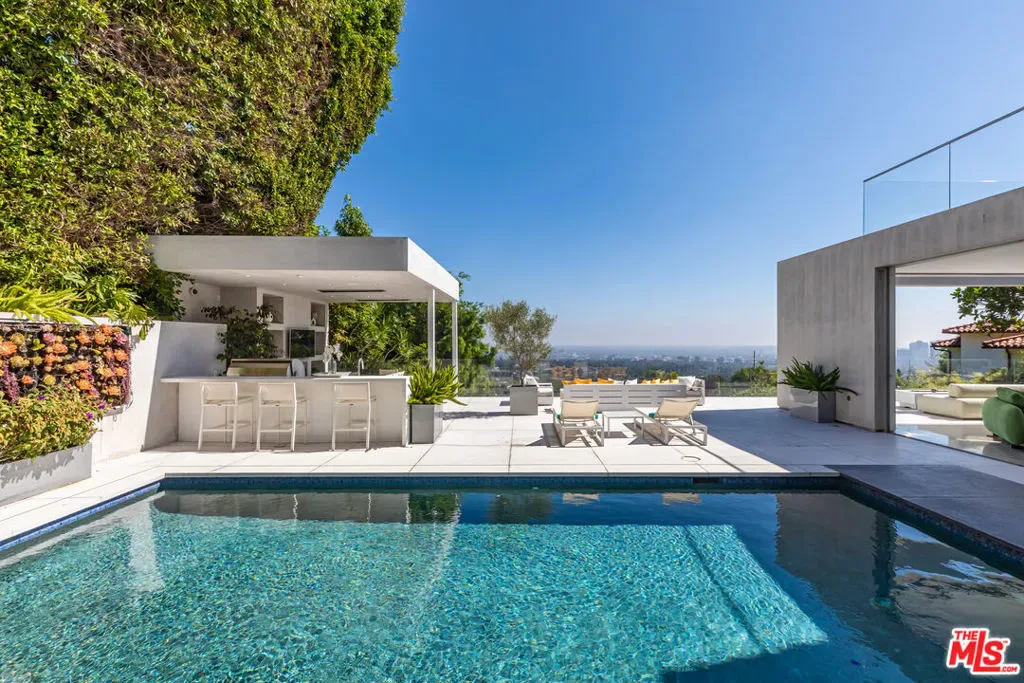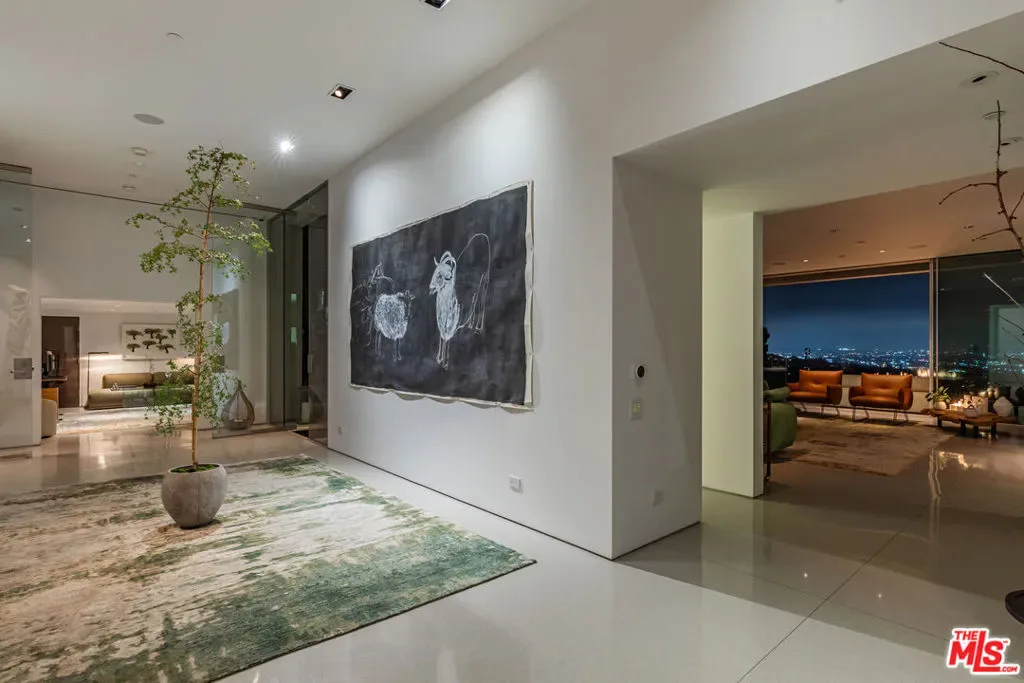 Perched to capture sweeping city lights and sunset ocean views, the Full Moon House is a masterclass in refined modern luxury and bespoke international craftsmanship. With interiors thoughtfully curated by Max Amirsole, featuring artful pieces from Italy, France, and beyond, the home exudes inviting warmth and worldly elegance. His design seamlessly complements James Magni’s architectural vision, where bold lines and open-concept spaces meet light, texture, and panoramic city-to-ocean views. Floor-to-ceiling glass walls connect seamless indoor-outdoor spaces, leading to expansive terraces and newly landscaped grounds featuring a stone water feature and a sculpture installation. The main level features a dramatic living area with disappearing glass walls, a sleek chef’s kitchen centered around a backlit onyx island, and a formal dining space ideal for entertaining. Designer bedrooms include imported pieces from Spain and Italy, Toto toilets, and flexible use options such as a pre-wired theater suite. The primary suite spans the entire upper level with motorized shades, lime-washed walls, dual spa baths, a soaking tub set on stone, two walk-in closets, and a private outdoor gym terrace. Additional features include terrazzo flooring throughout, Control4 smart home automation, Lutron lighting, solar panels, and a redesigned cabana with smooth stucco and custom shelving. This residence offers an unparalleled blend of modern sophistication, curated design, and indoor-outdoor serenity in the hills above Los Angeles. Furnishings thoughtfully curated from Cantoni, Poliform, BoConcept, and bespoke designer pieces.