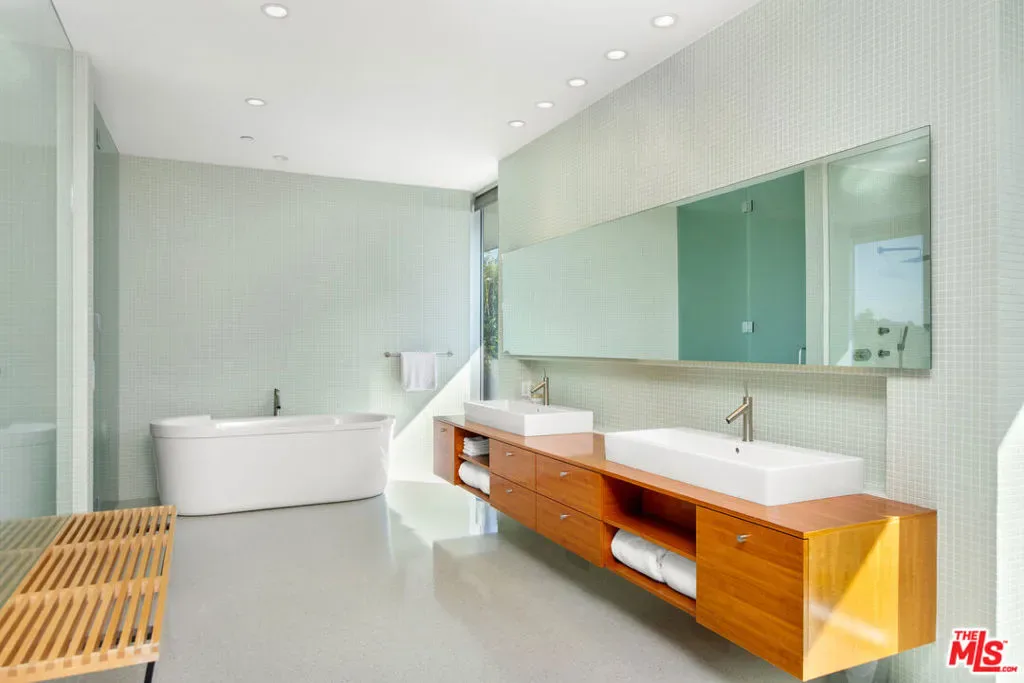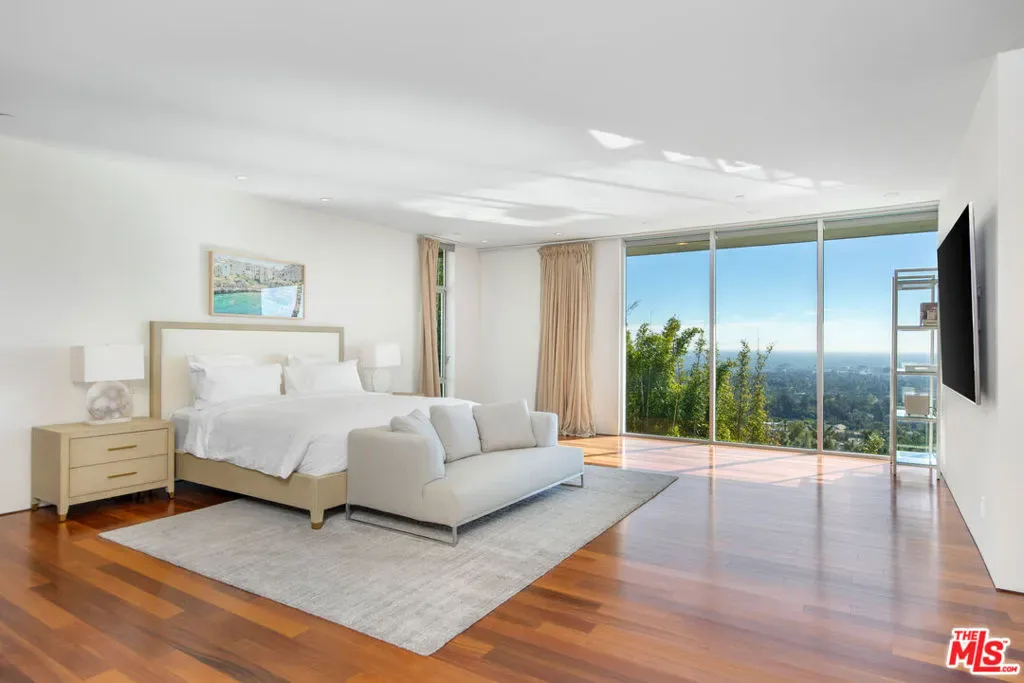 Set behind gates with exceptional privacy and sweeping, unobstructed views stretching from Downtown Los Angeles to the Pacific Ocean, this striking contemporary residence, lush with mid-century influence, is designed for effortless luxury and indoor-outdoor living. A sun-drenched foyer lined with floor-to-ceiling glass creates an immediate sense of arrival, opening seamlessly into an expansive open-concept living and dining space, framed by iconic city-to-ocean vistas. The living room, dining area, and kitchen feature oversized sliding glass doors, extending the experience outdoors and amplifying the home’s dramatic setting. At the heart of the home, the Arclinea gourmet kitchen is both refined and functional, featuring CaesarStone countertops and top-of-the-line appliances, while terrazzo flooring adds warmth and cohesion throughout the main level. Just beyond the kitchen, private guest quarters offer an en-suite bath, elevator access, and direct entry to the garage. On the opposite wing of the first floor, a second guest bedroom with en-suite bath is paired with a den, creating a perfect balance of comfort and entertainment. Designed to embrace California living, the main level opens directly to the backyard through the kitchen, living room, and guest bath, revealing an infinity pool, fire pit, and built-in barbecue area – an ideal setting for both entertaining and tranquil moments of seclusion in the sun. Upstairs, a welcoming game room anchors the landing, with an additional guest suite tucked just beyond. A wide, light-filled hallway lined with striking geometric clerestory windows creates a gallery-like passage, ideal for showcasing art, while flooding the space with natural light. Three additional bedrooms are positioned along this corridor, including a serene primary suite complete with a generous walk-in closet and spa-like bathroom featuring a soaking tub. A versatile bonus space offers flexibility as an additional family room, gym, or creative retreat. Perfectly situated moments from world-class shopping, dining, nightlife, and top school districts in Beverly Hills and the Westside, this private hillside retreat offers refined architecture, breathtaking views, and an exceptional lifestyle in one of Los Angeles’ most coveted locations.