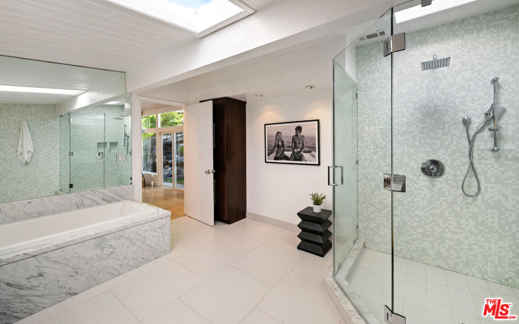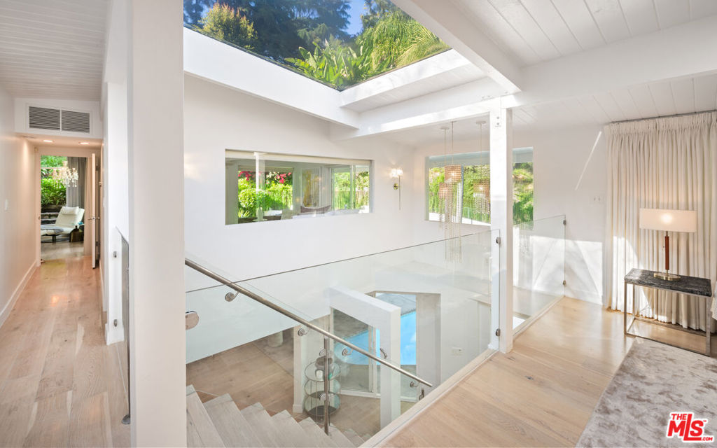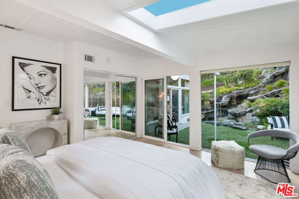 Perfectly positioned on a quiet cul-de-sac just moments behind the iconic Beverly Hills Hotel and minutes from Sunset Boulevard, this exceptional contemporary oasis offers the ultimate blend of privacy, prestige, and lifestyle. This former residence of several A-list celebrities features a bright open floor plan, seamless indoor-outdoor flow, and walls of glass that frame impressive surroundings. 9 skylights and 3 oversized fireplaces flood the home with natural light and create a vibrant, uplifting ambiance throughout. The sumptuous primary suite with spa-like bath, along with the 2nd bedroom, feature dramatic walls of glass opening to a breathtaking 50-foot waterfall, pond, lush yard, fire pit, and hilltop yoga area with hammock.Downstairs features a private 3rd bedroom with separate gated entrance and garden, perfect for guests, a teenager, office, or live-in. A media den with bar features a striking sunken “conversation pit” around a fireplace, ideal for movie nights or entertaining, opens to a spacious living area that steps right into the private heated pool which glows beautifully from nearly every room at night, creating a magical evening ambiance. Updated kitchen showcases porcelain counters, custom cabinetry, and top-of-the-line Miele appliances, while the spacious living and dining area are set gracefully among the treetops. Exceptionally private and tranquil, with only two homes on the street and ample parking rarely found in the hills, the property is also high-walled and gated for added security.