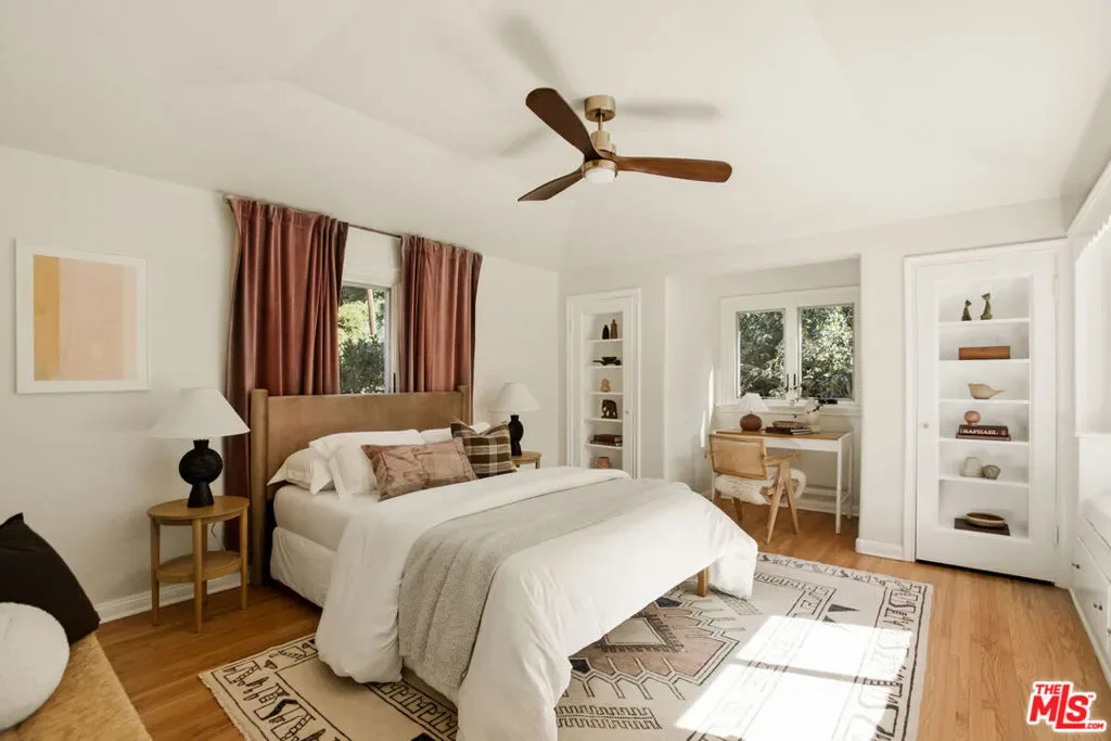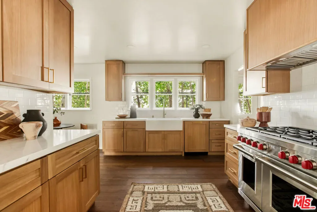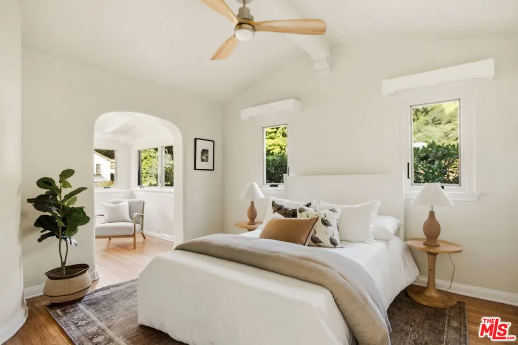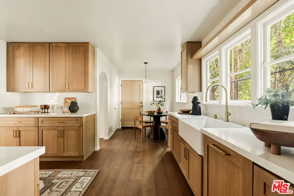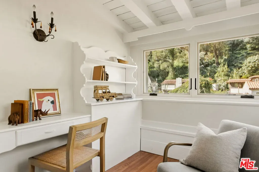 Located in the serene Beverly Crest enclave of Beverly Hills Post Office, this 1928 Spanish residence originally designed and built as the personal home of architect James Conway seamlessly blends timeless character with modern livability. Featuring four bedrooms and three newly remodeled bathrooms, the home offers expansive living spaces that honor its architectural heritage while catering to today’s lifestyle. The dramatic step-down living room showcases vaulted king post truss ceilings, rich original details, and a striking arched, tile-accented fireplace. The newly updated chef’s kitchen includes an 8-burner Wolf range, a double-door Sub-Zero refrigerator, ample storage, an eat-in dining area, and convenient access to both a side entrance and the attached two-car garage with laundry. Upstairs, three spacious bedrooms offer privacy and abundant natural light. The primary suite is a true retreat, featuring a private balcony, separate living and dressing areas, and a spa-inspired bath with dual vanities and a walk-in shower all thoughtfully designed to capture light from both the front and rear of the home. Just minutes from Coldwater Canyon Park and Franklin Canyon Park, and located within a highly regarded school district, this rare lease offering presents an exceptional opportunity to experience iconic Los Angeles architecture with comfort, privacy, and proximity to nature.