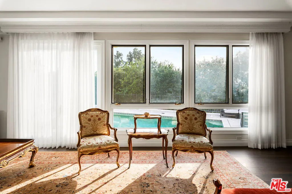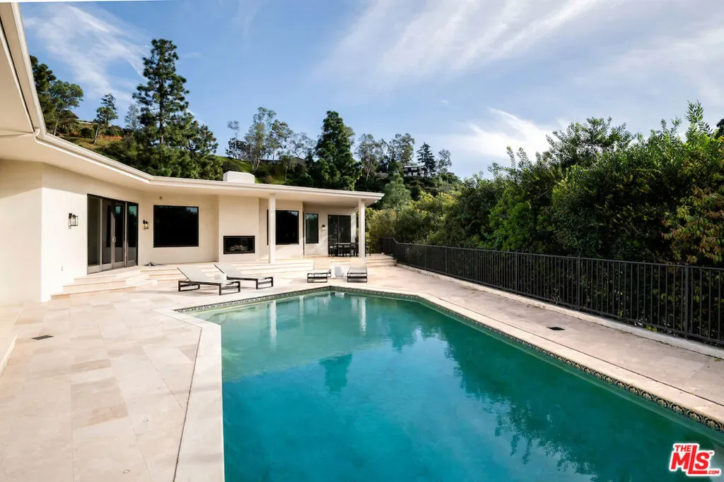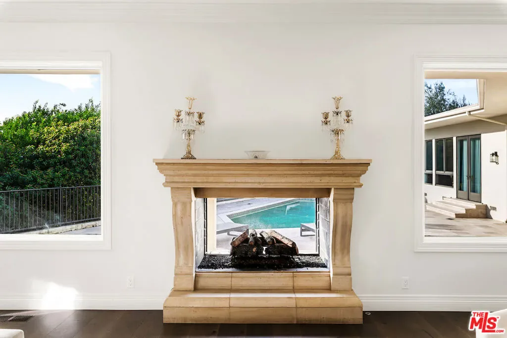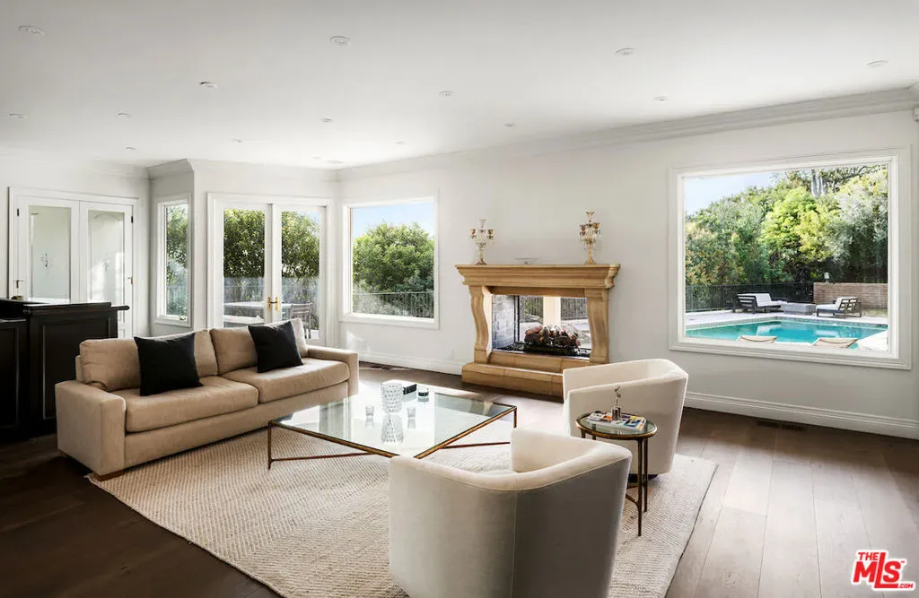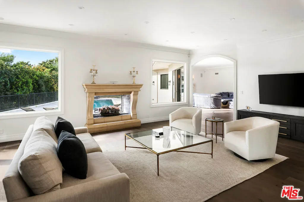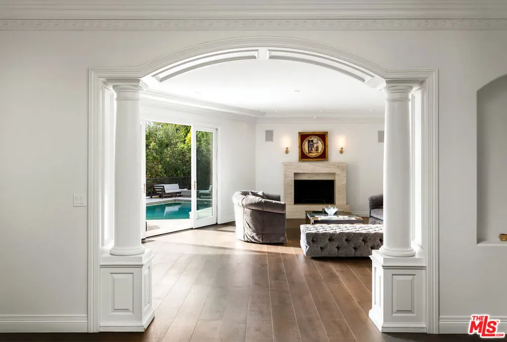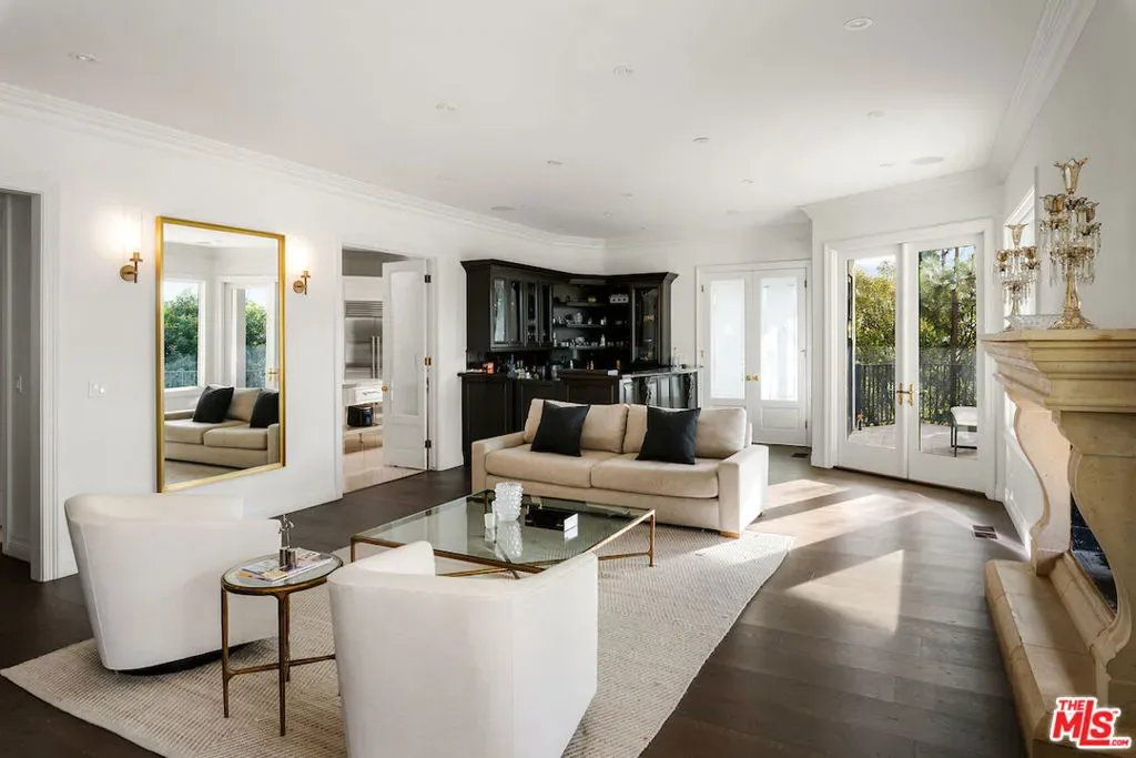 Situated in the prestigious Trousdale Estates of Beverly Hills, this meticulously renovated five-bedroom, six-bathroom residence is intentionally set back from the road and privately nestled behind lush landscaping. Ornate double doors welcome guests into the formal entry, showcasing intricate crown moldings, arched doorways, and a skylight that fills the home with natural light. The carefully curated layout is a true entertainer’s dream, featuring two spacious living roomsone with an impressive sunken bar and see-through fireplace, and the other seamlessly integrating indoor-outdoor living through expansive glass sliding doors. The formal dining room is thoughtfully situated just off the chef’s kitchen, which is fully equipped with state-of-the-art appliances and a charming breakfast nook. The primary retreat boasts a generous walk-in closet and a luxurious en-suite bath complete with a soaking tub. Three additional bedrooms, all well-proportioned, plus a substantial bonus room provide flexibility for a gym, media room, office, or playroom.An expansive pool serves as the focal point of the outdoor oasis. Enjoy sunny afternoons lounging poolside and dine al fresco beside the outdoor fireplace. An ultra-wide driveway ensures ample parking. The property may be offered furnished for an additional amount.