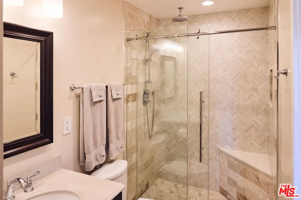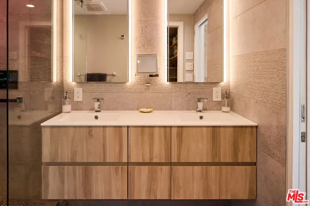 Experience a masterclass in modern luxury at 221 S Gale Dr #403. This meticulously reimagined penthouse underwent a complete down-to-the-studs renovation completed in 2024, creating the only legitimate 3-bedroom, 3-bathroom floor plan in the building. Every detail has been thoughtfully upgraded, from the all-new electrical and plumbing systems to the high-efficiency 3.5-ton HVAC with Nest control. The architectural centerpiece is a dramatic living room featuring 18-foot ceilings and a floor-to-ceiling porcelain feature wall with an integrated electric fireplace and a 65-inch TV cutout. The space is complemented by a porcelain wet bar with a wine and beverage fridge, ideal for sophisticated entertaining. The designer kitchen represents the pinnacle of culinary technology, headlined by a state-of-the-art Invisacook invisible induction cooktop set beneath seamless porcelain countertops and custom Porcelanosa cabinetry. Professional-grade features include a premium appliance suite by Signature, American Standard, and Miele, as well as Brizo touch-control fixtures, a dedicated pot filler, and an instant-hot water system with integrated filtration.The primary suite serves as a true sanctuary, boasting dual walk-in closets and a spa-like bath with a steam shower featuring touch-panel controls, integrated music, and mood lighting. High-end finishes continue throughout with Porcelanosa luxury flooring, Lutron app-controlled lighting, and motorized blackout shades. Indoor-outdoor living is seamless with new sliding glass doors leading to a first-floor patio and a private second-floor rooftop deck. Upstairs, a rare 6′ x 9′ storage room provides exceptional utility. Both first-floor bathrooms include Toto bidets with heated seats. Situated in a secure building offering a heated pool, spa, and tandem parking for two vehicles, this home is moments away from the Beverly Hills tennis courts and La Cienega Park. Experience exceptional style and value just steps from world-class shopping and dining in the heart of Beverly Hills.