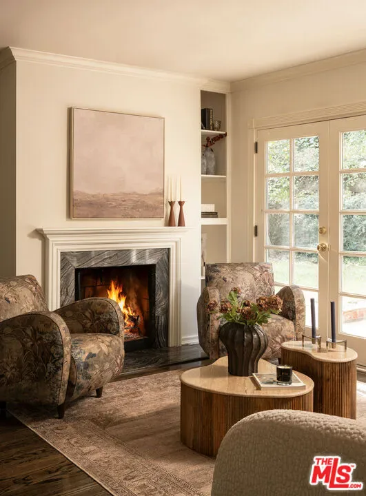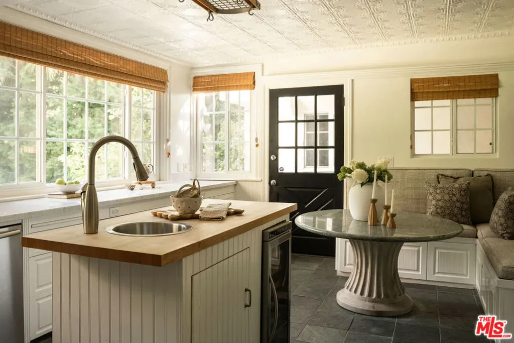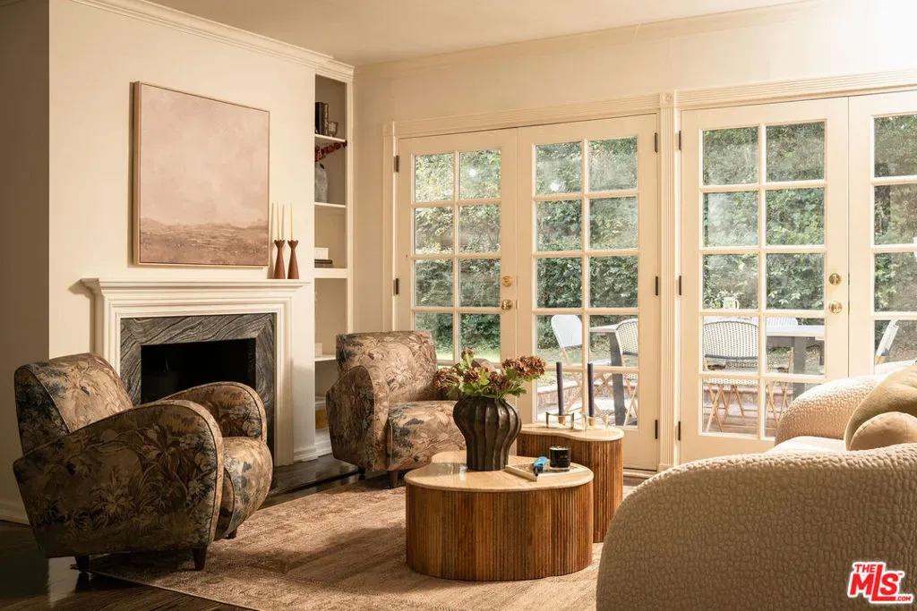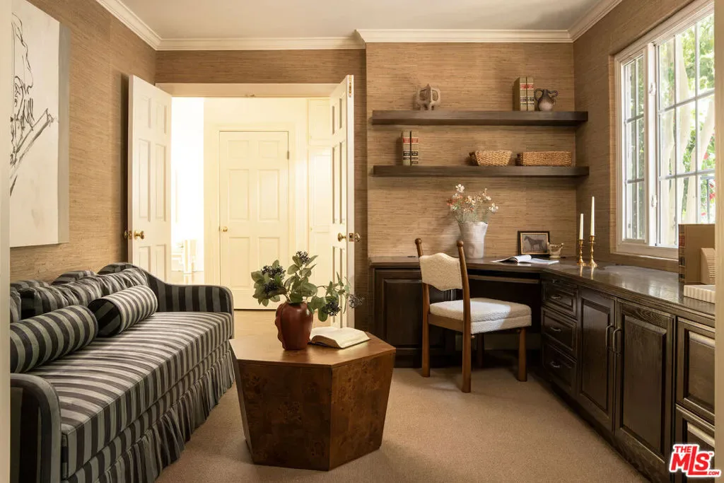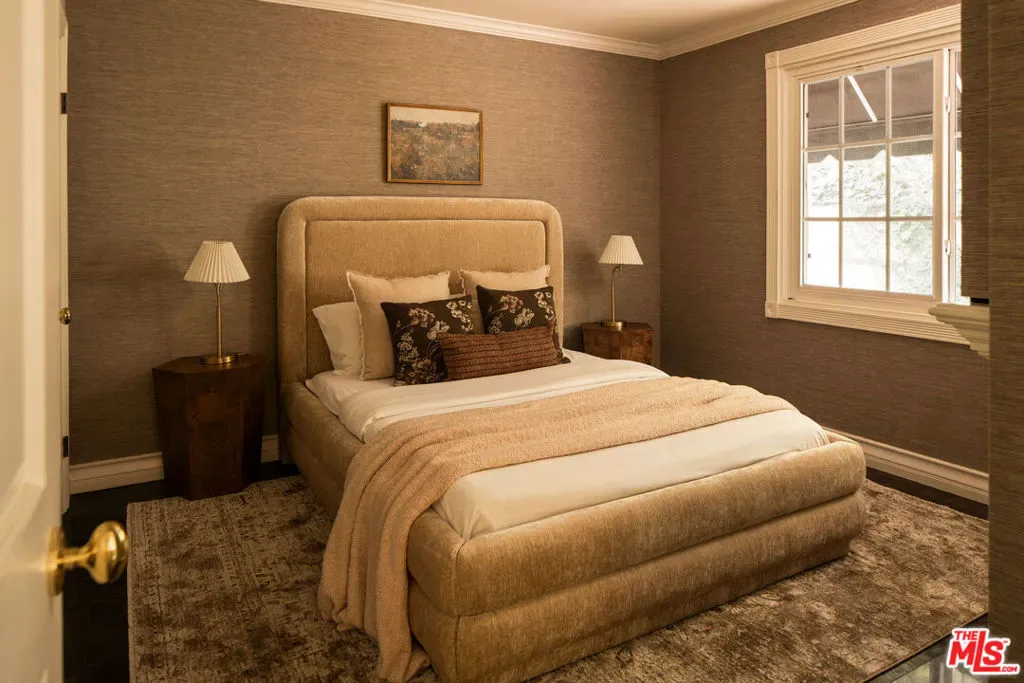 Hidden from the street behind gates and towering 50-foot privacy hedges, this pristinely updated storybook traditional haven promises a charm-filled lifestyle amidst peace and serenity, with three bedrooms + den. A vast circular motor court wraps around the grassy front lawn and leads to the home’s exposed-brick entry, its reddish hue complemented by the freshly painted creamy white facade. Inside, fantastic newly refinished dark hardwood floors impressively shine, reflecting natural sunlight welcomed by large picture windows. A bank of French doors lines the formal living room, with its elegant fireplace and dry bar/tasting area. The country kitchen includes a butcher-block island with wine refrigeration, comfy breakfast nook, open shelving, copious cabinetry, farm sink, period tin ceiling, and state-of-the-art stainless-steel appliances. Restored original wainscoting in the adjacent formal dining room adds classic prestige to intimate dinner parties. The primary wing, a true prize of the home, is equipped with a double-door entry, French doors to the backyard, fireplace, built-ins, and a versatile antechamber with a built-in desk, perfect as a television room, office, lounge, nursery, and more. The en-suite spa-inspired bath is complete with radiant floor heating, a glass-enclosed shower and separate oversized tub, subway tile wraparound, and massive department-store-like changing wardrobe with custom organizers, dresser island, makeup desk, and a safe for securing valuables. The guest bedroom is also warm and inviting and features a third fireplace and bath with shower. Outside, dine al-fresco and converse with friends and family surrounded by lush plant life. Or, retreat past terraced rose gardens for calm reflection from a trellis-covered patio, perched above the quaint grounds with delightful views of various treetops and natural ridge line. A detached guest house includes a wet bar, side-by-side laundry, doggy door, and three-quarter bath. In addition to the abundance of storage and deep closets found throughout the home, there is also a bonus storage shed. Parking is for eight to ten vehicles plus a two-car garage. Lovingly updated with modern finishes and gorgeous garden views from every room, this beautiful hidden jewel is move-in-ready and awaits its next chapter. Discover why this ideal location is dubbed Celebrity Row, cherished and private yet just moments to Rodeo Drive and the Westside. Welcome home!