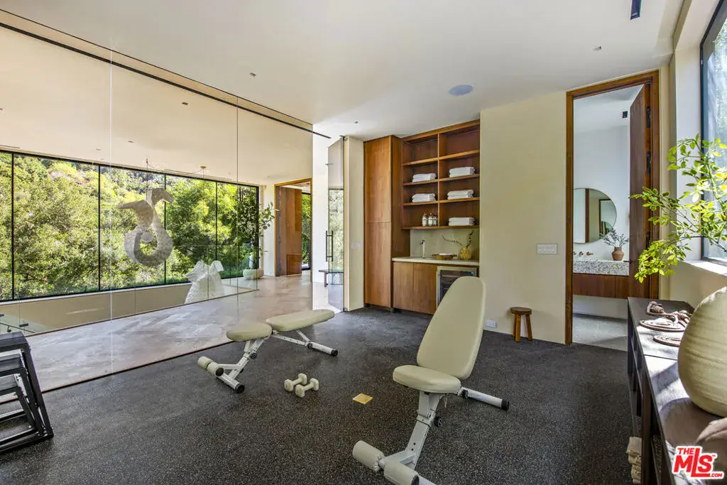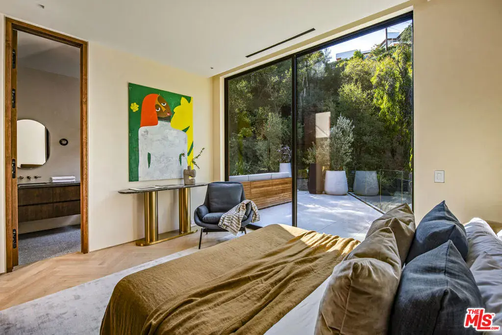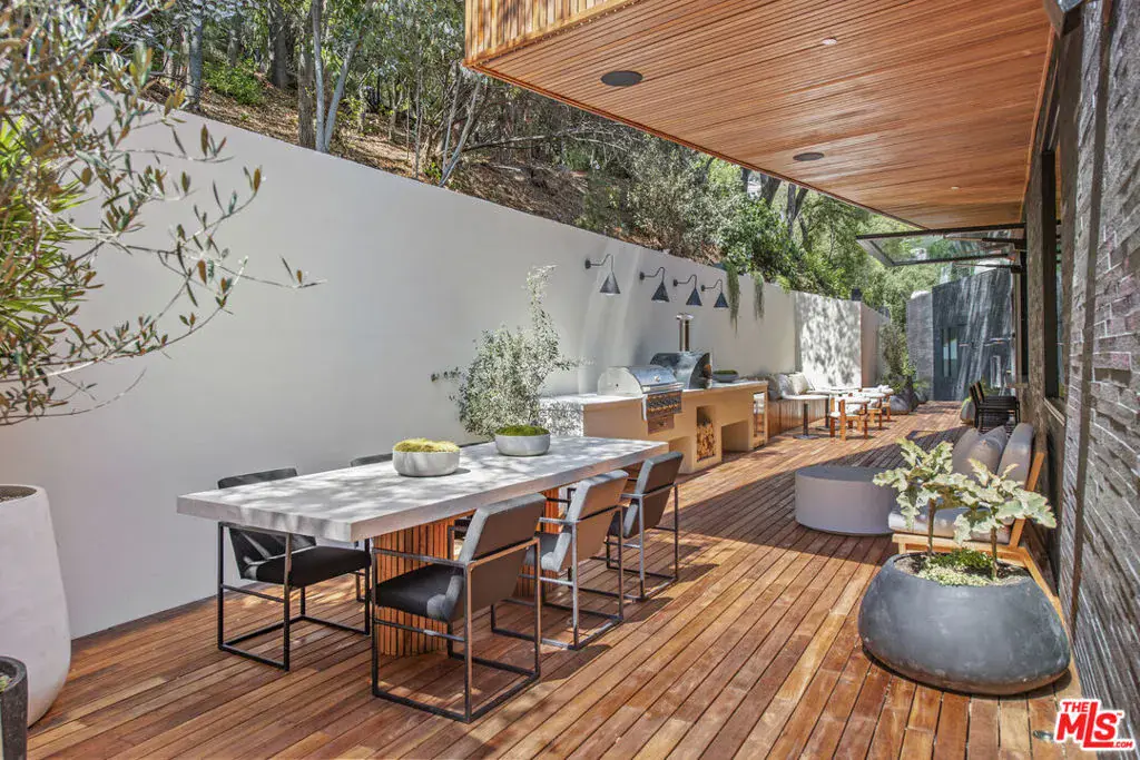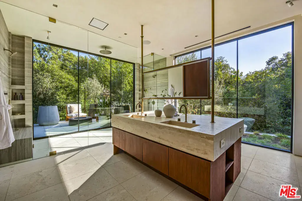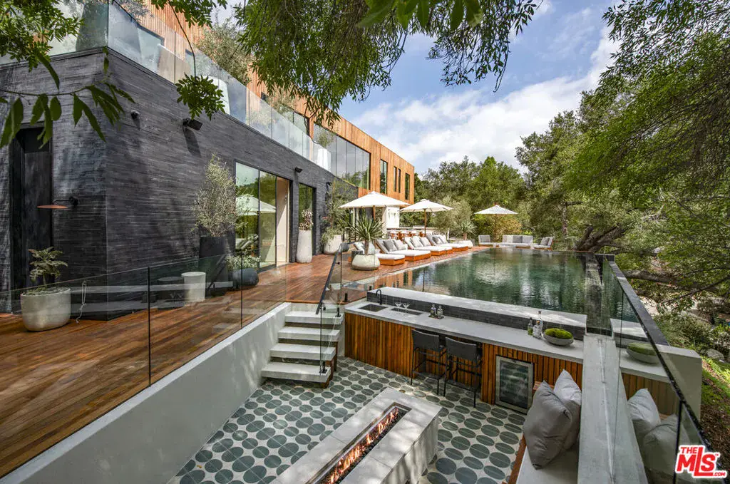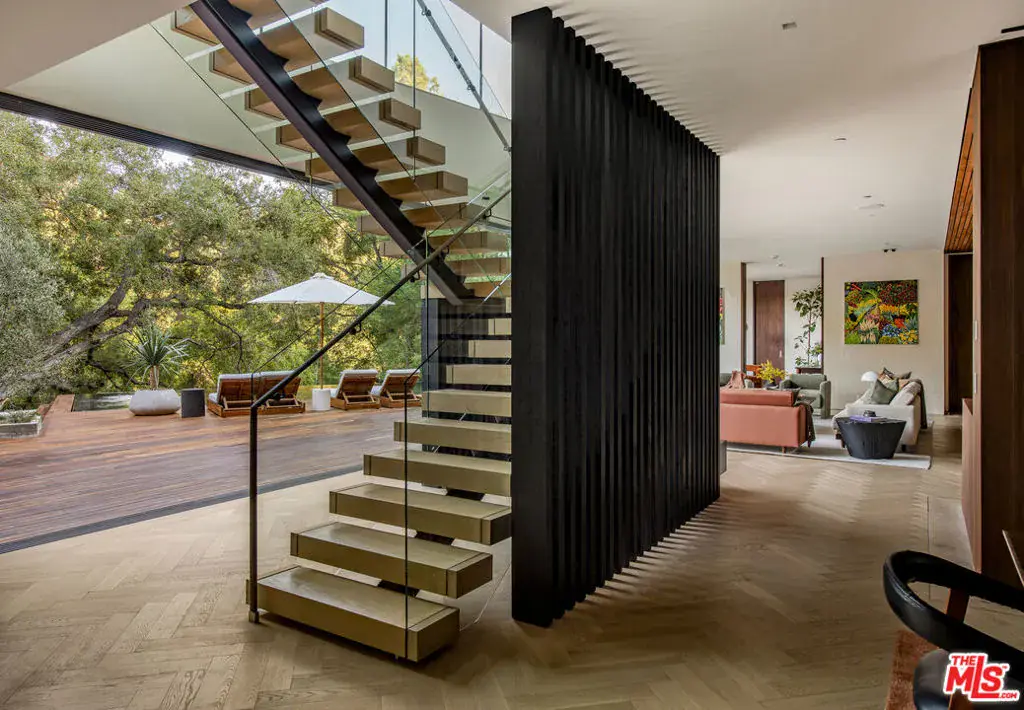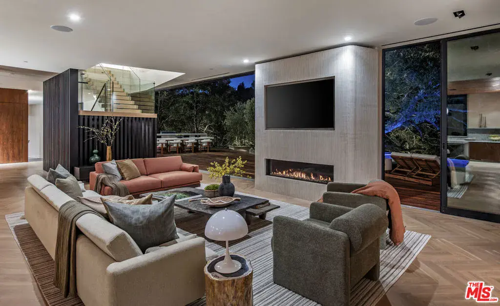 The Hutton House is a rare architectural sanctuary, where transitional Scandinavian modern design meets privacy, nature, and understated luxury in one of Beverly Hills’ most coveted settings.Set behind gates on nearly an acre and enveloped by mature oak trees with tranquil canyon views, this newly constructed six-bedroom, nine-and-a-half-bath estate, interior designed by Abramson Architects, offers a level of serenity and seclusion that is increasingly difficult to find. The exterior blends warm teak wood siding with sculptural black basalt stone, softened by mature hedging that creates a true sense of arrival.Inside, soaring ceilings and expansive Fleetwood pocket doors dissolve the boundary between indoors and out, filling the main living spaces with natural light and an effortless sense of flow. Organic, bespoke finishes and carefully curated materials lend the home a calm, resort-like ambiancerefined, warm, and timeless.The heart of the home is a chef’s kitchen designed for both daily living and entertaining, anchored by a striking 15-foot custom stone island, top-tier Miele appliances, an intimate breakfast nook, and an automated pop-up window that opens seamlessly to outdoor dining and lounge areas.Upstairs, the primary suite is a private retreat overlooking the canyon, featuring dual custom closets, a sculptural plaster floating fireplace, a secluded deck, and a spa-inspired bath with steam rain shower and custom birchwood sauna. A state-of-the-art gym is also located on this level, allowing for wellness and relaxation within the home’s most private wing. An expansive 50+ foot skylight floods the upper level with natural light, while four additional bedroom suites extend to private outdoor decks, reinforcing the home’s connection to its natural surroundings.A floating staircase highlighted by a one-of-a-kind chandelier art installation acts as both a functional element and sculptural centerpiece. Below, the lower interior level is dedicated to entertainment and leisure, featuring a tiered private theatre, temperature-controlled wine storage, and thoughtfully designed gathering spaces ideal for evenings in or hosting intimate events.Outdoors, the estate unfolds in layered fashion. The upper grounds are anchored by a zero-edge infinity pool and spa with swim-up bar, multiple fire pit lounges, and fully equipped outdoor kitchensdesigned for both large-scale entertaining and quiet moments of retreat. Below, a private outdoor lower level reveals a full pickleball court with stadium-style seating, set into lush landscaping, a grassy knoll, and handcrafted water features, creating a resort-style experience rarely found in a private residence.Additional amenities include a secondary chef’s kitchen, private office with custom cabinetry, Savant-powered smart home technology, two well-appointed laundry rooms, a showcase three-car garage, and additional parking for up to ten vehicles. The residence is also offered with custom-designed indoor and outdoor furnishings created specifically to complement the home’s Scandinavian aesthetic.The Hutton House is not simply a home, it is a composed and intentional environment where architecture, nature, and privacy coexist in perfect balance. A truly rare offering just minutes from the heart of Beverly Hills, designed for those who value quiet luxury, thoughtful design, and a life well lived.