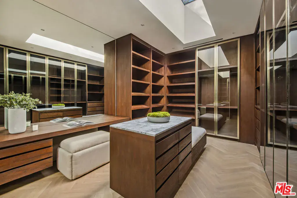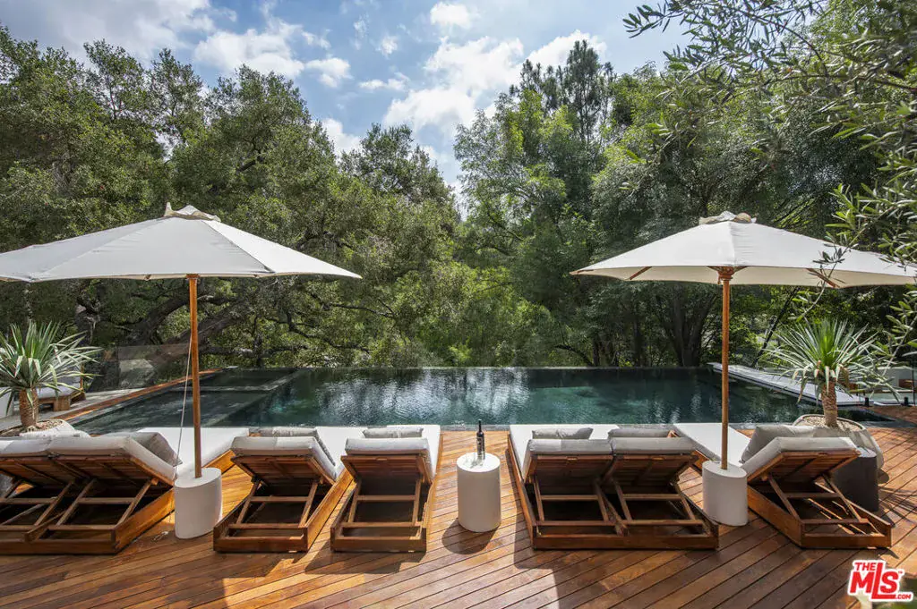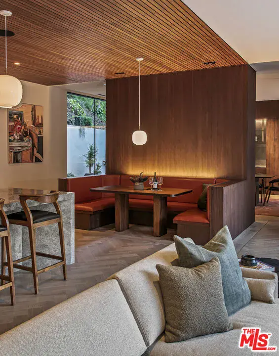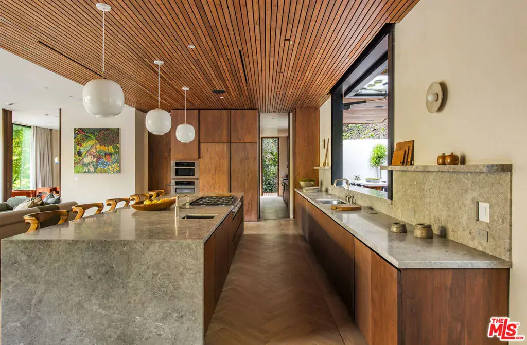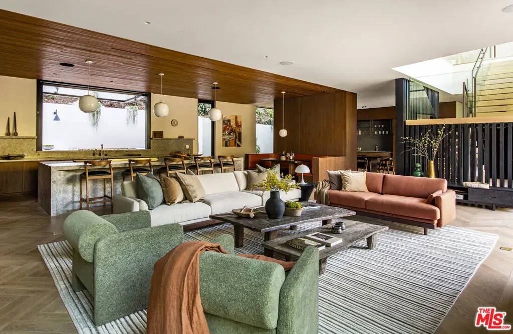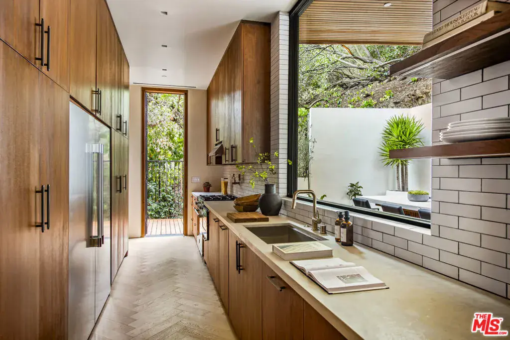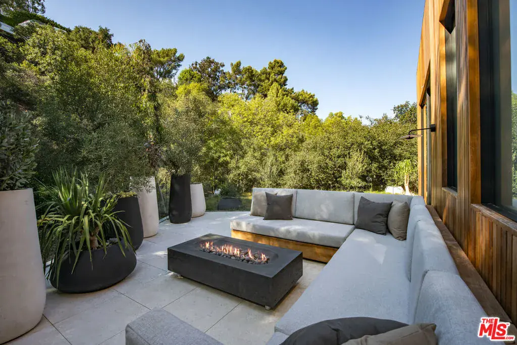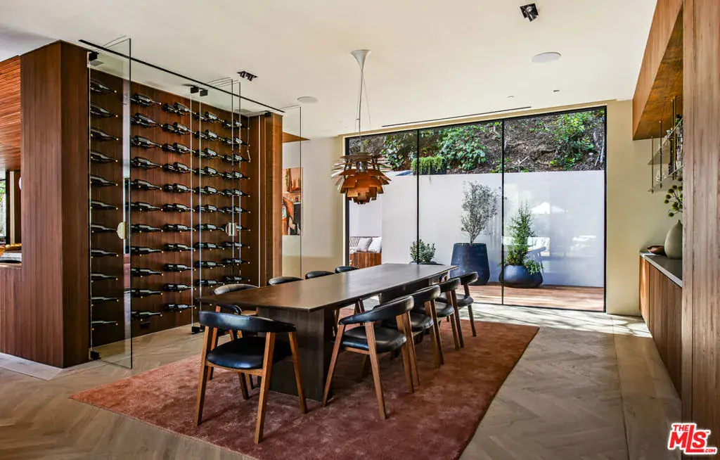 The Hutton House is a rare architectural sanctuary, where transitional Scandinavian modern design meets privacy, nature, and understated luxury in one of Beverly Hills’ most coveted settings.Set behind gates on nearly an acre and enveloped by mature oak trees with tranquil canyon views, this newly constructed six-bedroom, nine-and-a-half-bath estate, interior designed by Abramson Architects, offers a level of serenity and seclusion that is increasingly difficult to find. The exterior blends warm teak wood siding with sculptural black basalt stone, softened by mature hedging that creates a true sense of arrival.Inside, soaring ceilings and expansive Fleetwood pocket doors dissolve the boundary between indoors and out, filling the main living spaces with natural light and an effortless sense of flow. Organic, bespoke finishes and carefully curated materials lend the home a calm, resort-like ambiancerefined, warm, and timeless.The heart of the home is a chef’s kitchen designed for both daily living and entertaining, anchored by a striking 15-foot custom stone island, top-tier Miele appliances, an intimate breakfast nook, and an automated pop-up window that opens seamlessly to outdoor dining and lounge areas.Upstairs, the primary suite is a private retreat overlooking the canyon, featuring dual custom closets, a sculptural plaster floating fireplace, a secluded deck, and a spa-inspired bath with steam rain shower and custom birchwood sauna. A state-of-the-art gym is also located on this level, allowing for wellness and relaxation within the home’s most private wing. An expansive 50+ foot skylight floods the upper level with natural light, while four additional bedroom suites extend to private outdoor decks, reinforcing the home’s connection to its natural surroundings.A floating staircase highlighted by a one-of-a-kind chandelier art installation acts as both a functional element and sculptural centerpiece. Below, the lower interior level is dedicated to entertainment and leisure, featuring a tiered private theatre, temperature-controlled wine storage, and thoughtfully designed gathering spaces ideal for evenings in or hosting intimate events.Outdoors, the estate unfolds in layered fashion. The upper grounds are anchored by a zero-edge infinity pool and spa with swim-up bar, multiple fire pit lounges, and fully equipped outdoor kitchensdesigned for both large-scale entertaining and quiet moments of retreat. Below, a private outdoor lower level reveals a full pickleball court with stadium-style seating, set into lush landscaping, a grassy knoll, and handcrafted water features, creating a resort-style experience rarely found in a private residence.Additional amenities include a secondary chef’s kitchen, private office with custom cabinetry, Savant-powered smart home technology, two well-appointed laundry rooms, a showcase three-car garage, and additional parking for up to ten vehicles. The residence is also offered with custom-designed indoor and outdoor furnishings created specifically to complement the home’s Scandinavian aesthetic.The Hutton House is not simply a home, it is a composed and intentional environment where architecture, nature, and privacy coexist in perfect balance. A truly rare offering just minutes from the heart of Beverly Hills, designed for those who value quiet luxury, thoughtful design, and a life well lived.