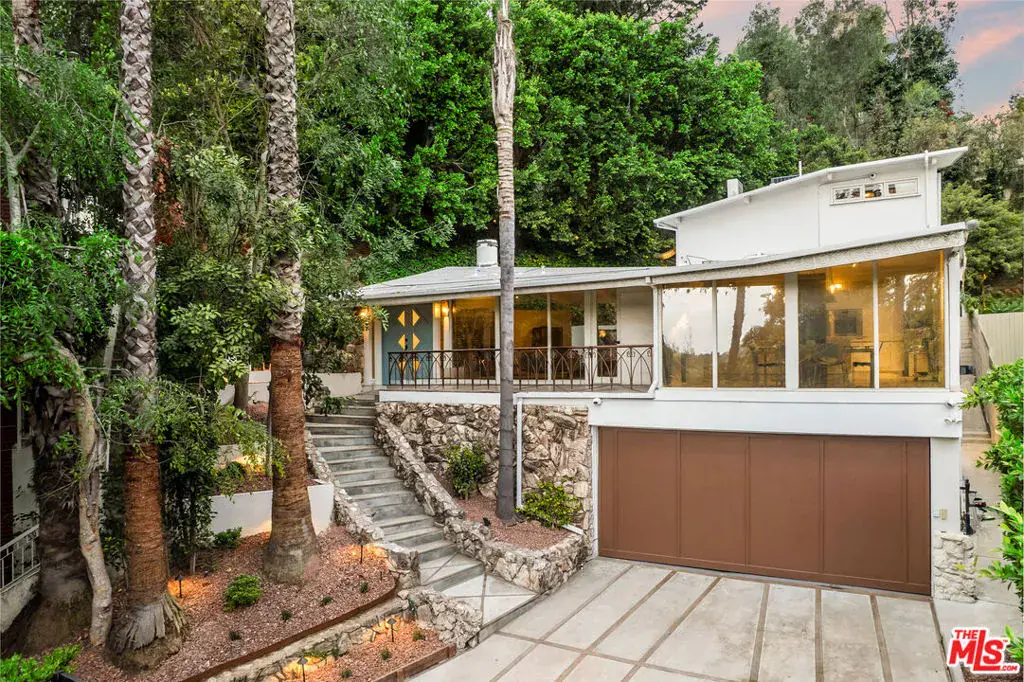 Nestled in the secluded hills of Franklin Canyon, this residence thoughtfully balances mid-century modern architecture with contemporary, material-driven updates. The original structure defined by open volumes, clerestory windows, and expansive walls of glass remains easy to read, while later remodels introduce a textured, organic sensibility that complements the modernist framework. Natural light permeates the open-plan living spaces, reflecting off steel-troweled cement walls and contrasting textures throughout the interiors. A consistent material palette, expressed through the textured fireplace surround, smooth hand-troweled kitchen finishes, and built-in planters, creates a tactile dialogue that bridges eras while preserving architectural clarity. A sculptural concrete and stone fireplace anchors the living room, emphasizing the connection between structure and material. The kitchen, featuring a custom curved island and bespoke cabinetry, serves as a central architectural element, reinforcing the home’s focus on flow and craftsmanship. The entire upper level is devoted to the luxurious primary suite, conceived as a serene retreat with a private balcony overlooking the lush, secluded backyard. The suite includes a spa-inspired bath with a cement soaking tub and separate shower, dual closets, and a private water closet with sink. Two guest bedrooms are located on the main level, while a versatile office or glam room on the lower level supports productivity, creativity, or quiet retreat, seamlessly blending function and design. Outdoors, lush palms and hedges ensure exceptional privacy. Built-in concrete benches, framed in the home’s original mid-century stone, establish continuity between the front facade and the backyard, while a water feature set within one of the recessed bays provides a serene focal point. Together with a saltwater pool, deck, fire bowl, and intimate lounge areas, these elements extend the modernist ethos seamlessly into the landscape. Situated between Franklin Canyon Park and TreePeople conservation lands, the property offers a rare balance of seclusion and proximity, embodying a home shaped by light, material, and nature.