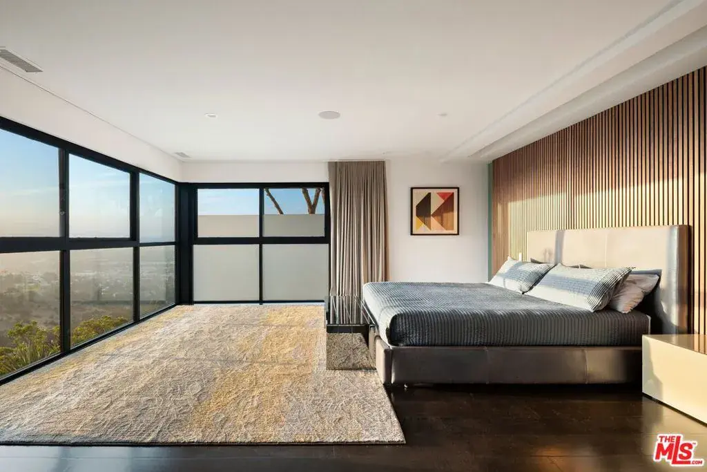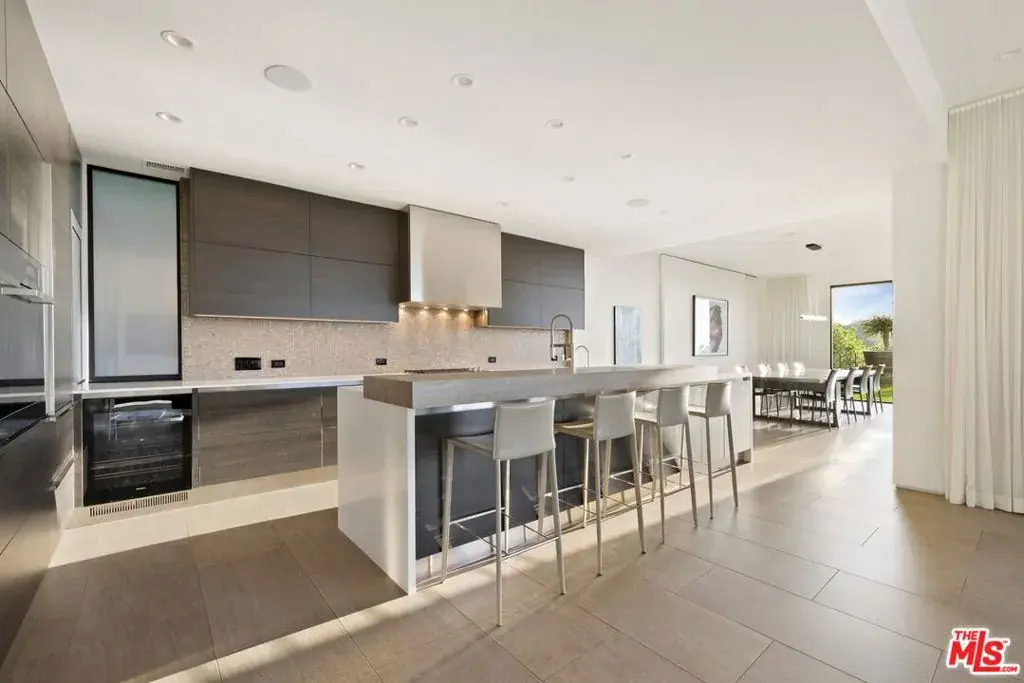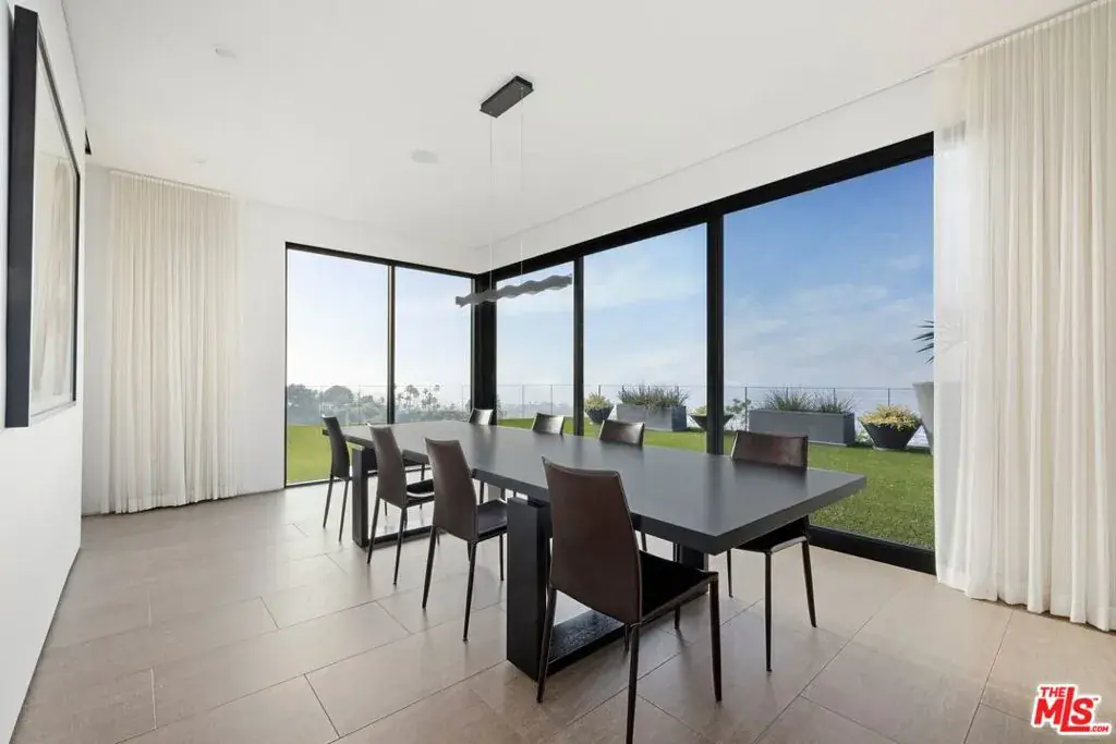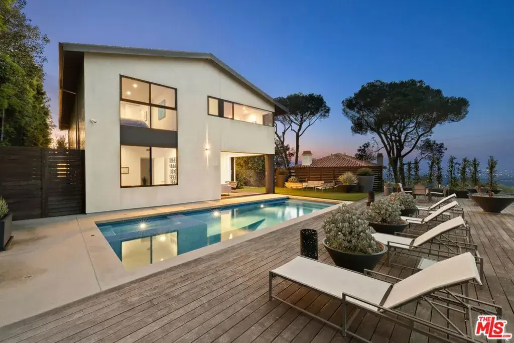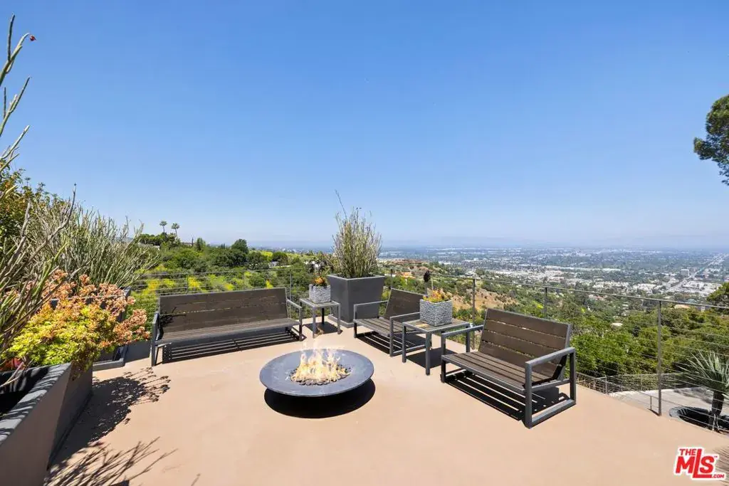 Tucked away on a beloved, private road where turnover is low and some residents own multiple homes, this fantastic refuge promises riveting panoramic views at every moment and peaceful comfort above it all. From sunrise to sunset and into calm California nights, unobstructed vistas inspire creative thought and invoke a passion for this rare way of life in harmony with its natural surround. Sited up a long private driveway with parking for numerous vehicles, the home is meticulously appointed with beautiful drought-tolerant landscaping including whimsical olive trees and carefully curated cacti. Guests arrive through a pivot door as floor-to-ceiling panes of glass welcome natural light into the double-height foyer. Entertain in style with a seamless indoor-outdoor vibe as pocket doors fully retract in the living room to provide a casual, elegant flow from east to west. A state-of-the-art Arclinea kitchen is equipped with Miele ovens and appliances as well as a Wolf cooktop, custom Sub-Zero refrigerator, and a generous waterfall island with breakfast bar ledge. The nearby formal dining room, also with retreating doors, is appointed with an impressive floating wall close-off to add intimacy to parties and guide the movement of attendees. Upstairs, the primary suite is magnificent, complete with a sumptuous bath with floating dual-sink vanity, separate shower, toilet room, and centerpiece soaking tub aside walls of sliding glass that open to reveal a private patio with fire pit. A large walk-in closet has custom built-ins to please any modern fashionista. Secondary bedrooms showcase striking mountain and valley views, and bathrooms are dressed in white Italian lacquer cabinets topped in soothing gray Silestone. Screen films in the media room with its plush double-pad cushy floor, or work and study in the roomy office with built-ins and picture window. Downstairs, discover a spacious guest quarters with private entrance and direct access to the home’s expansive driveway and motor court. Here, a variety of possibilities and configurations abound, from yoga, massage, and wellness to a potential recording studio or artist’s haven! Complete with en-suite bath, separate HVAC, and walk-in closet, this partitioned space can also be utilized for passive income. Outside, there are multiple lawns, a saltwater pool and spa, and a sprawling lounging deck from which the back of the Hollywood Sign’s H can be seen as well as the San Jacinto Mountains 100+ miles away! Enjoy close proximity to hiking trails including Dixie Canyon Park, centrally located just moments to the high fashion of Rodeo Drive or the boutique charm of Studio City. Welcome to a fresh, coveted lifestyle relished from this singular viewpoint in a world-famous locale just off of Mulholland Drive. Also available fully furnished, including most of the artwork (negotiable; inquire for details).