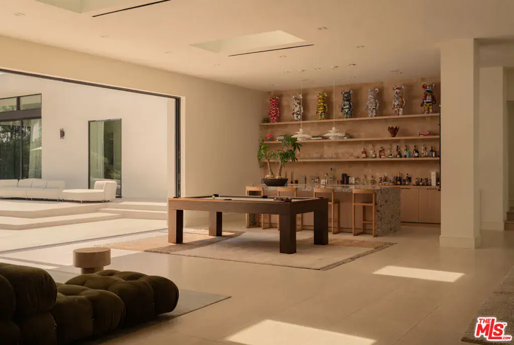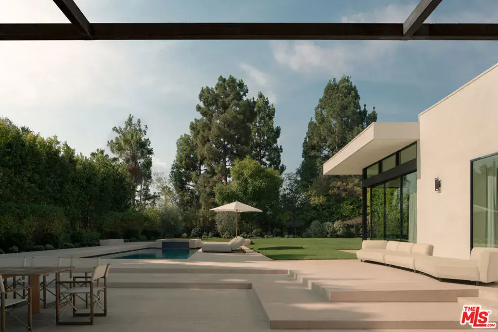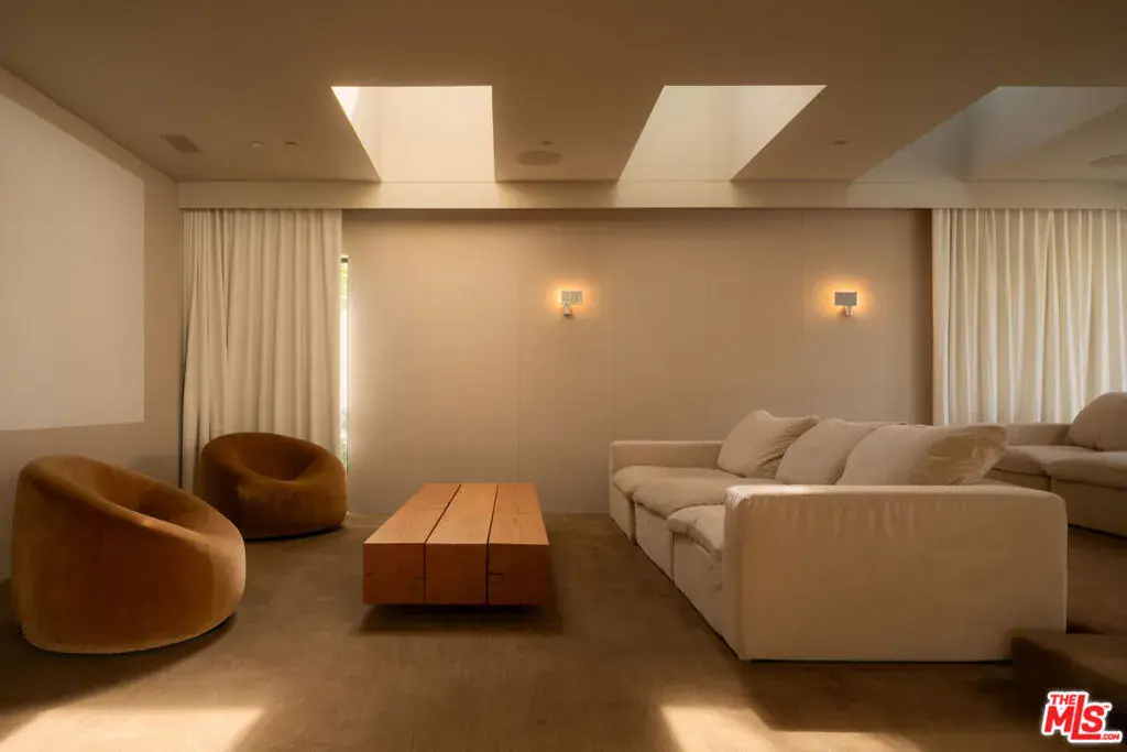 Located in the most prime section of Beverly Hills behind private gates on over half an acre of flat, fully usable land, this single-story contemporary residence blends architectural character with warm, livable design. Soaring 12-foot ceilings and skylights throughout create an open, sunlit flow from the kitchen to the family room, anchored by a wet bar and floor-to-ceiling pocket doors that open seamlessly to the grounds. The home’s four bedrooms include a dramatic primary suite with retractable glass walls overlooking the pool and lush landscaping cultivating an effortless indoor-outdoor connection that defines the California lifestyle. The pool and spa serve as the centerpiece of the outdoor living space, offering a tranquil backdrop for daytime lounging and evening gatherings. Designed for both everyday living and entertaining, the home features a professional movie theater with stadium seating, a custom bar, and multiple outdoor gathering areas framed by mature trees for total privacy. Additional highlights include a 3-car garage, ample guest parking, and an exterior carport for security. At twilight, the property glows with its modern lines and layered landscape lighting creating a resort-like ambiance in the heart of Beverly Hills.