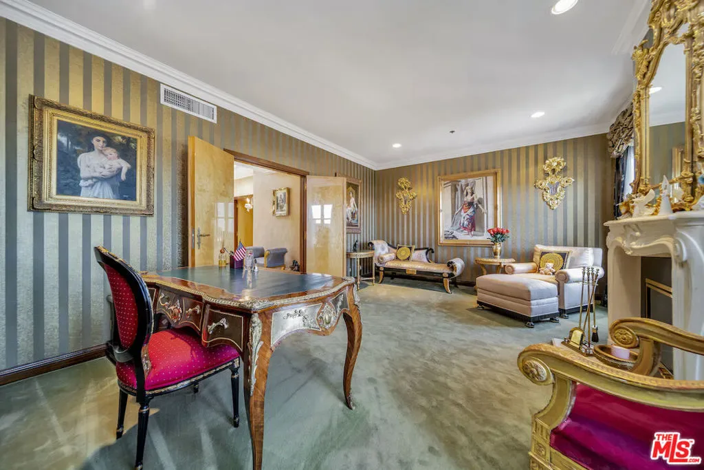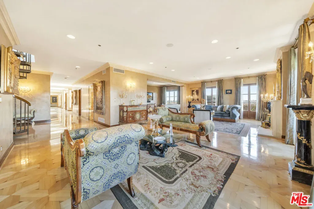 This regal penthouse in the iconic Le Faubourg building, which has been home to celebrities, offers over 5,300 sq ft of impressive unobstructed panoramic views from Beverly Hills to Downtown LA. This penthouse offers privacy and high security. 6 bedrooms, 7.5 baths, 4 fireplaces, a large chef’s kitchen, formal living room with wet bar, formal dining room, library, separate service entrance and 3 dramatic pyramid skylights, flood the penthouse with natural light. The oversized primary suite includes two fireplaces, a sitting area, large walk in cedar closets and an opulent marble bath. French doors lead to multiple balconies, while a spiral staircase leads to the private rooftop, spanning over 700 sq ft, overlooking Beverly Hills and beyond. Full-service luxury begins when you pull into the driveway and are greeted by an onsite valet. Additional amenities include a large private storage room, 24-hour doormen, concierge, security, pool/spa and gym. Moments from Rodeo Drive, Sunset Blvd, and everything Beverly Hills has to offer. A rare opportunity to own this landmark Beverly Hills Penthouse in the world- famous 90210.