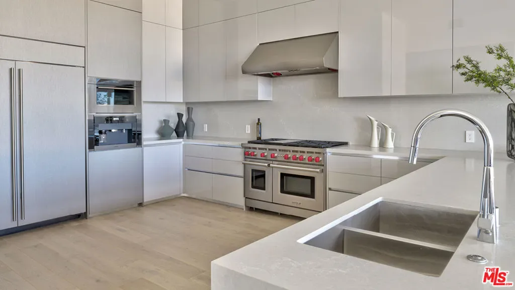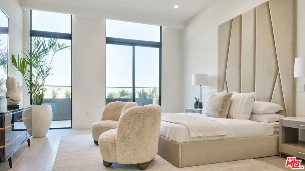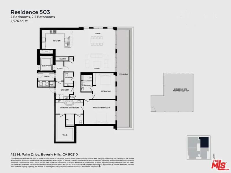 Discover Penthouse 503 at 425 Palm in Prime Beverly Hills. Crowning the building, this exceptional 2-bedroom, 2.5-bath residence spans 2,576 SF of interior living space plus a 579 SF private veranda and an expansive 603 SF fully customizable rooftop deck with unobstructed views of the Los Angeles skyline and the iconic Hollywood Hills. Semi-private elevator access opens directly into your private foyer, setting the tone for sophisticated, elevated living. The open-concept layout flows seamlessly from the gourmet kitchen to the dining and living areas, designed for both everyday living and effortless entertaining. Floor-to-ceiling windows flood the space with natural light. Impeccable interior finishes throughout include Wolf and Sub-Zero appliances, a Miele built-in coffee system, Caesarstone countertops in the kitchen and bathrooms, Italian Gessi fixtures, and custom imported Linea Quattro European cabinetry. Additional features include a dedicated laundry room and three side-by-side subterranean parking spaces. 425 Palm offers a boutique residential experience with an on-site fitness center featuring premium equipment, a rooftop terrace with an outdoor gourmet kitchen and sunken spa, dedicated lobby with 24-hour on-site attendants, and controlled access. Ideally located in the heart of Beverly Hills, moments from world-class dining, shopping, and entertainment.