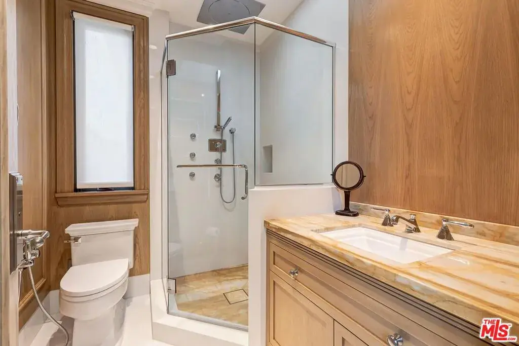This remarkably tasteful custom 2019-built 3-level Traditional on a world-renowned road is available for sale for the first time. Featuring super high ceilings, incredible materials, exquisite stone and herringbone wood floors, detailed mouldings, wainscoting, built-ins, and smart-home technology. Grand and gracious 2sty entry with inlaid marble floors, clerestory windows, and a sweeping staircase flows perfectly to the gallery hall, stunning library/living, dining, and family rooms. Beautiful elevator and secondary staircases to all floors. Phenomenal main and prep kitchens with top stainless appliances. Kitchen opens to major dining and family rooms which lead to a wide covered/heated patio and resort-style private grounds with patios, pool, spa, fountain, pergola, outdoor shower, and pool house (guest unit) with bath. 4 (or 5) bedroom suites upstairs displaying bathrooms as “works-of-art”. Substantial primary retreat with large office (possible 5th upstairs bedroom), 2 walk-ins, 2 luxe baths, fireplace, and an amazing nearly 60ft wide rear balcony with treetop views. Enormous secluded main floor bedroom suite could readily be a 2nd primary. Lower level features natural light, 2 big bedroom suites, a comfortable central entertaining space, wine cellar, and direct access to an enormous 5 car subterranean garage (nearly 1,300SF) and large storage room. Two separate laundry spaces (2nd floor and lower level) for convenience. Sited just moments from internationally acclaimed shopping, dining, hotels, medical services, and entertainment, the epitome of a luxurious lifestyle resides here. Shown only to highly pre-qualified buyers.