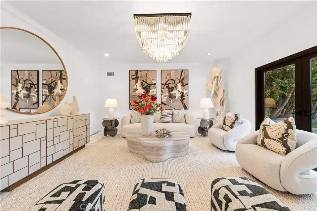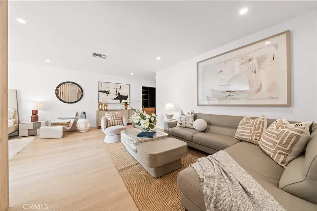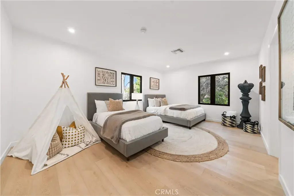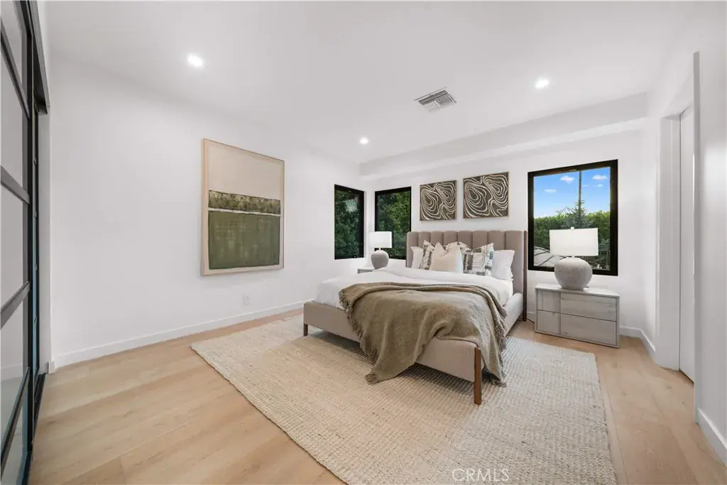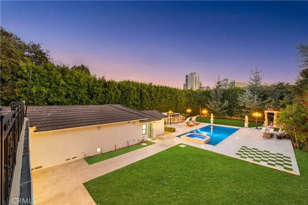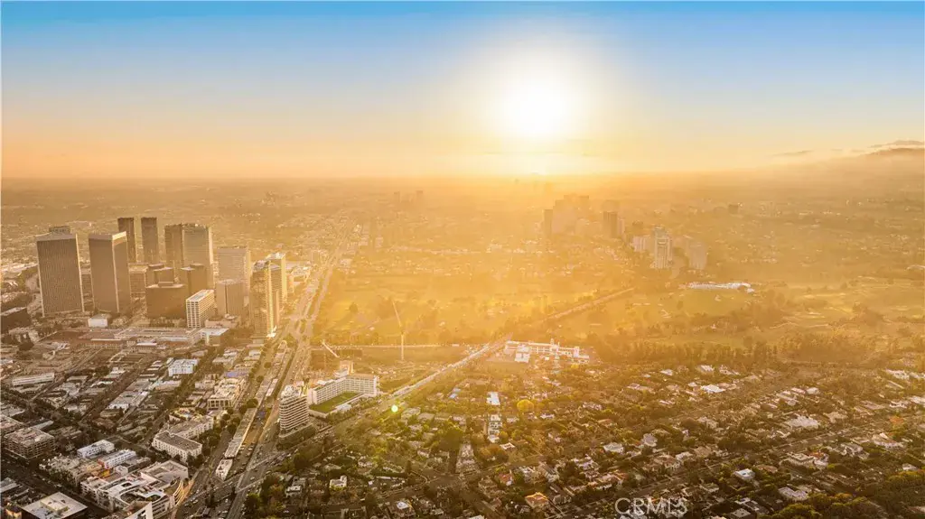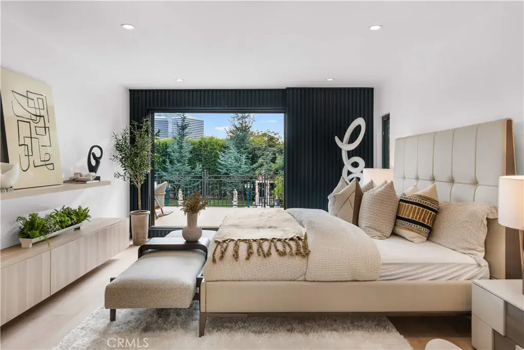 The residence includes five bedrooms, with four located upstairs. The primary suite offers a sitting area, walk-in closets, and an oversized terrace with sweeping views toward Century City. Additional bedrooms are generously sized.