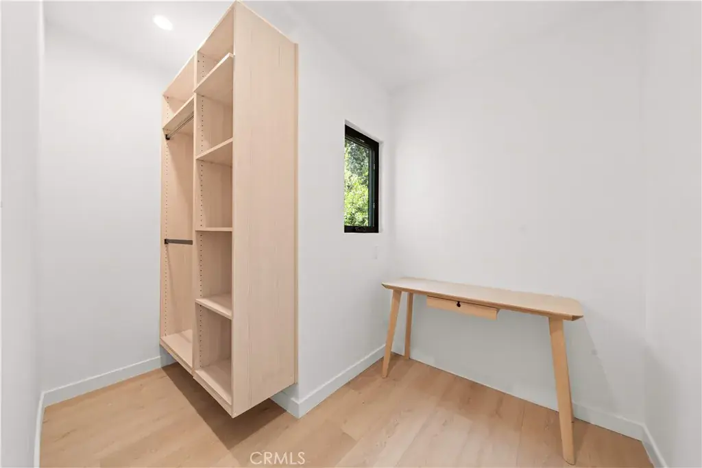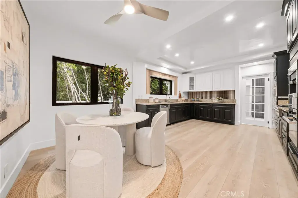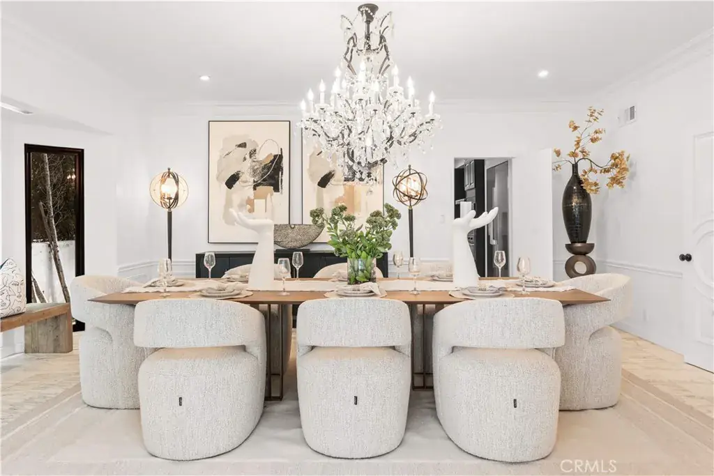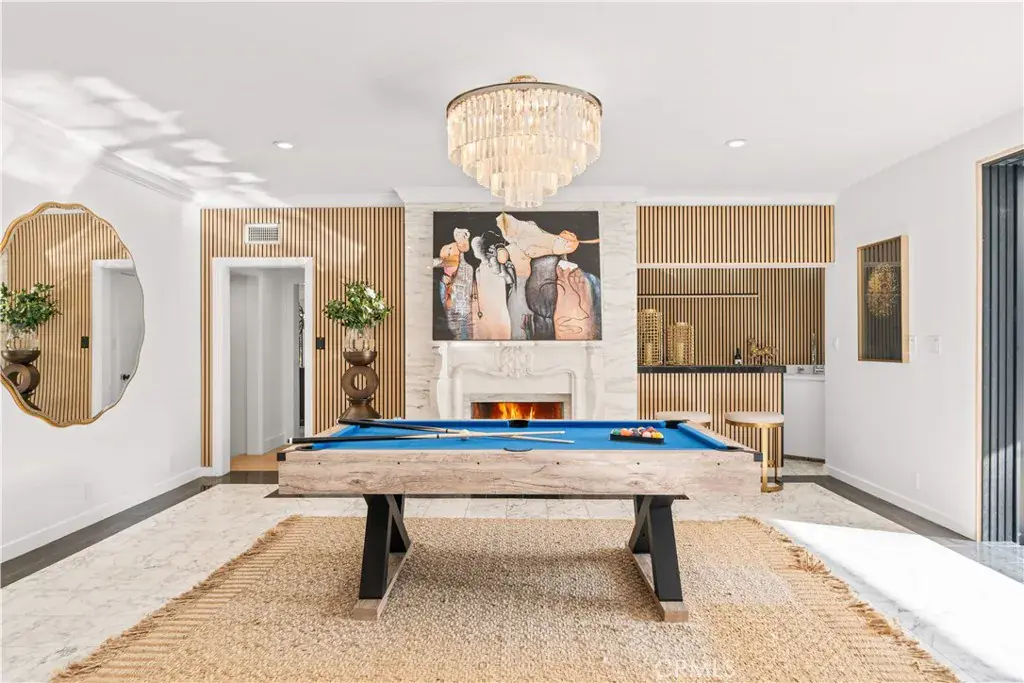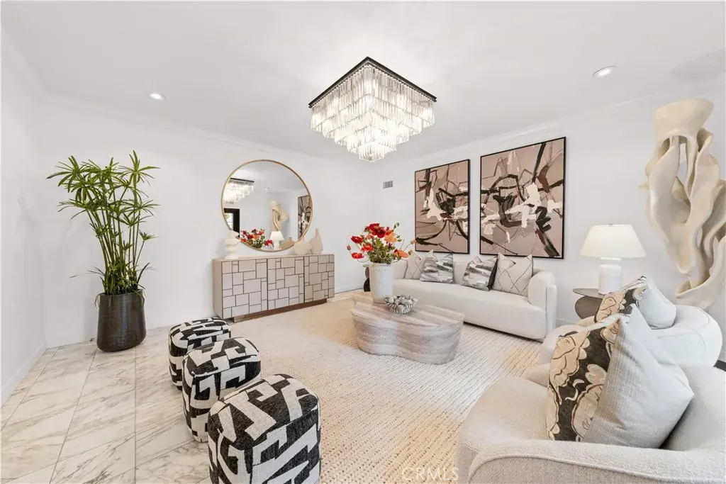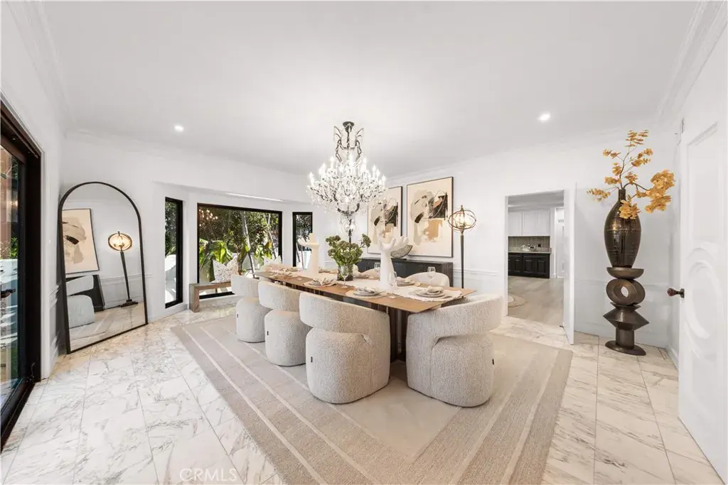 The residence includes five bedrooms, with four located upstairs. The primary suite offers a sitting area, walk-in closets, and an oversized terrace with sweeping views toward Century City. Additional bedrooms are generously sized.