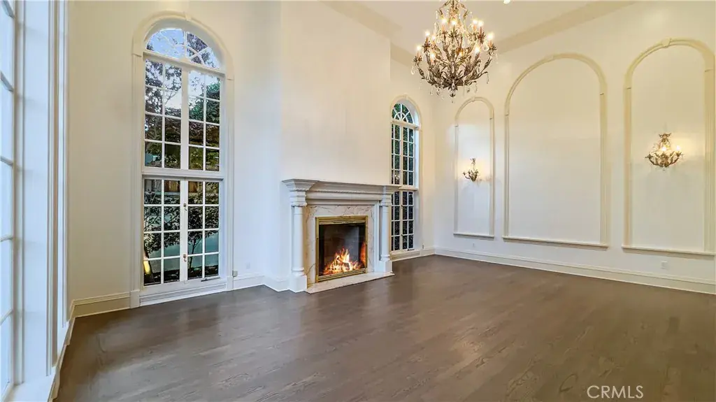 The grand two-story entry, featuring a sweeping staircase and skylight, sets the stage for elegance. The formal living room, with its stunning fireplace and Palladian windows, exudes sophistication, while the richly paneled oak library with walnut floors offers a cozy retreat. The inviting family room seamlessly opens to the pool area and beautifully landscaped gardens, perfect for indoor-outdoor living.