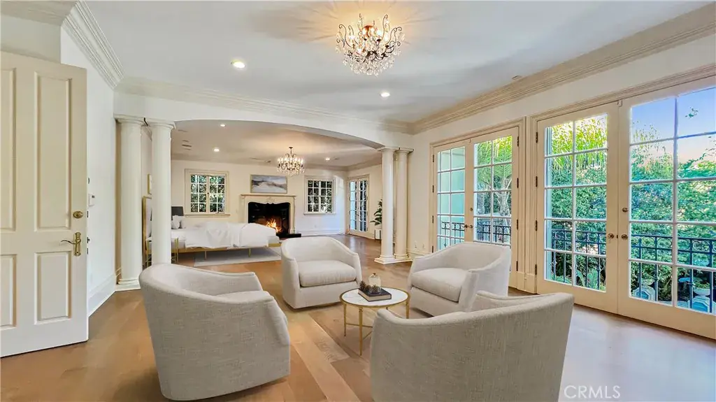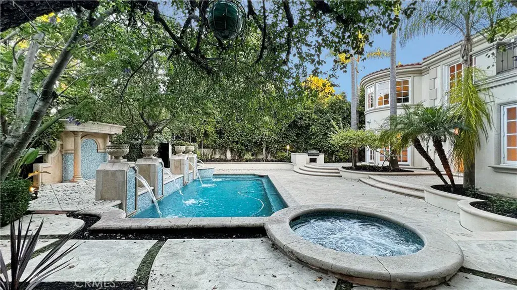Upstairs, the master suite is a serene sanctuary with a sitting room, cozy fireplace, and expansive master bath, plus three large bedroom suites, ensuring plenty of space for everyone. The outdoor oasis features a sparkling pool, multiple seating areas, and lush gardens — perfect for relaxing and entertaining.