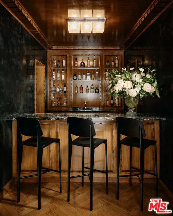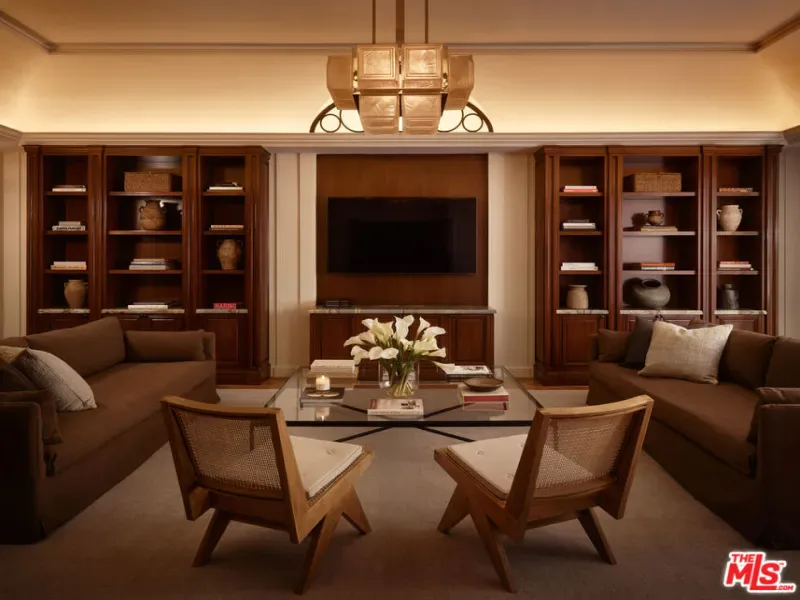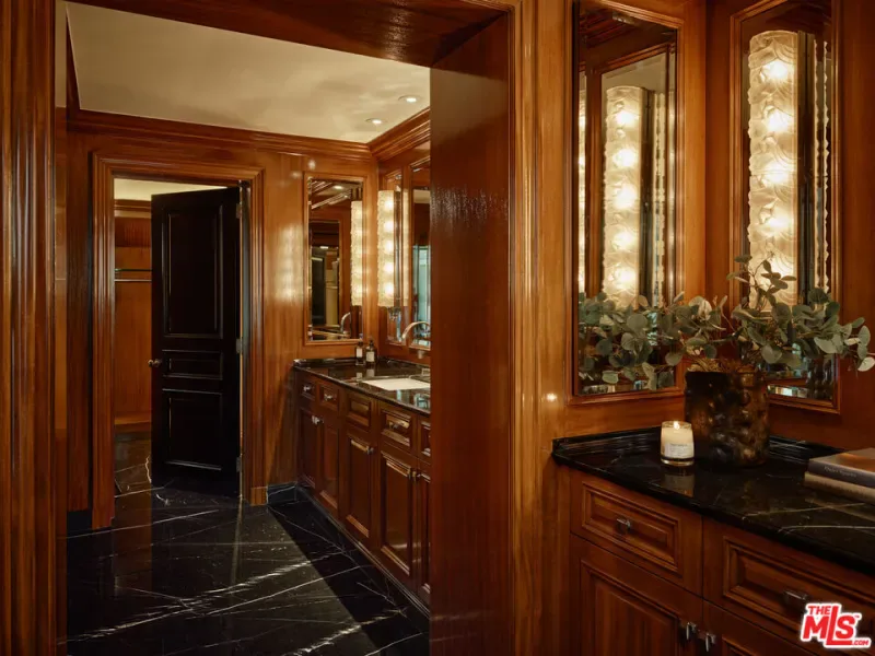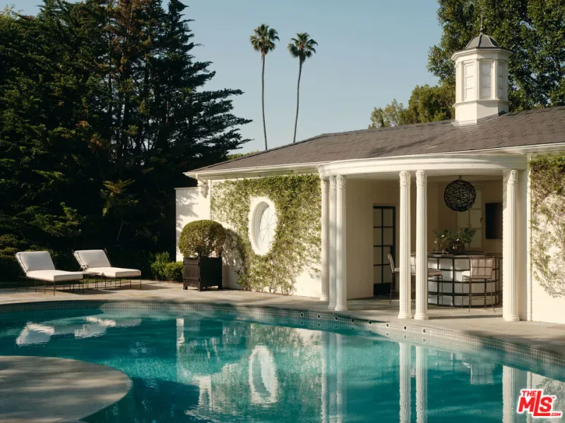 The Rutherford House is a masterpiece of architectural design, showcasing unparalleled quality and attention to detail. Located on the most desirable street in Beverly Hills, the one-of-a-kind residence blends old Hollywood with modern luxury. Upon entering the grand entrance, guests are greeted by a classic, winding staircase and a magnificent view that reveals the impressive back grounds. The main level features a formal living and dining room, Ruhlmann-inspired library and billiard room, bar, and grand morning room lined with 18th-century wallpaper and original fireplace. The kitchen is functional yet breathtaking with decadent marble, mosaic-tiled ceiling, and top-of-the-line appliances. A primary suite features marble bathrooms, oversized closets, and a separate lounge area that overlooks a manicured garden. Outside is a pavilion with an oval pool and pool house inspired by Paul Williams’ remarkable design. With many more features throughout, this iconic estate must be experienced to be believed. Step into timeless elegance and rich history with the Rutherford House.