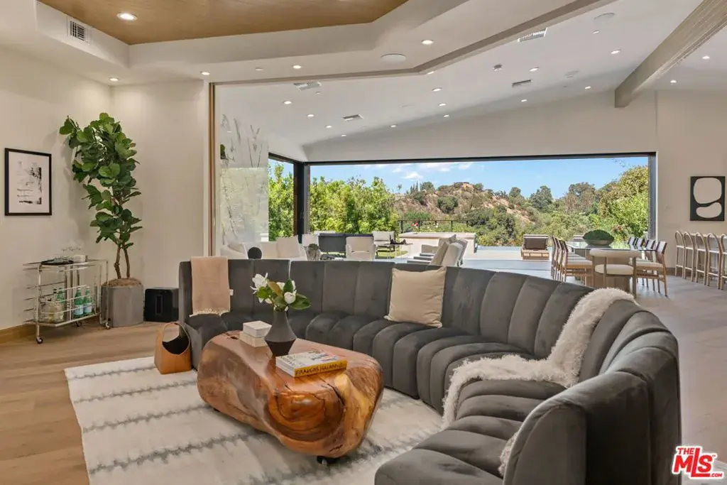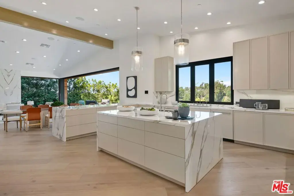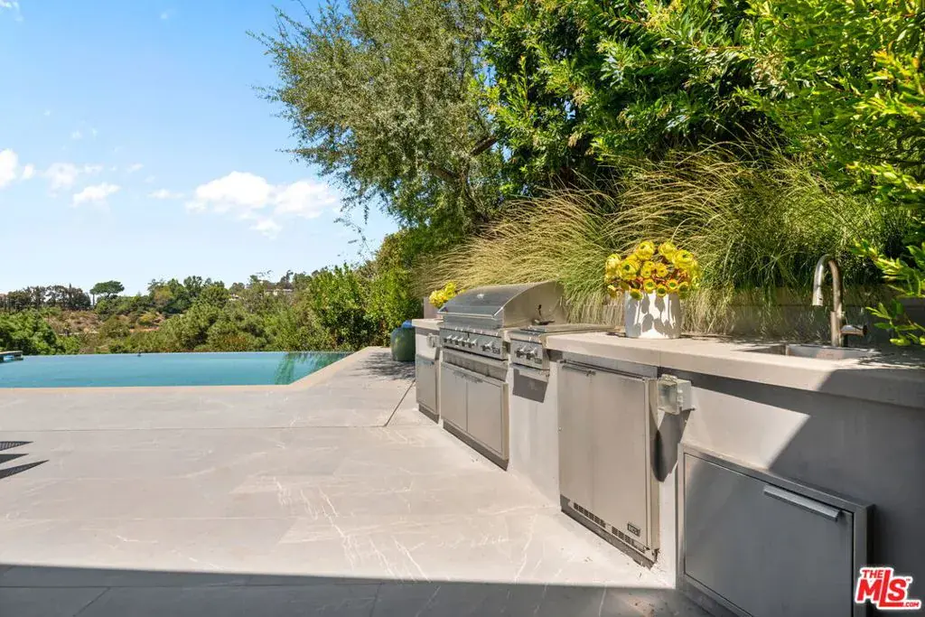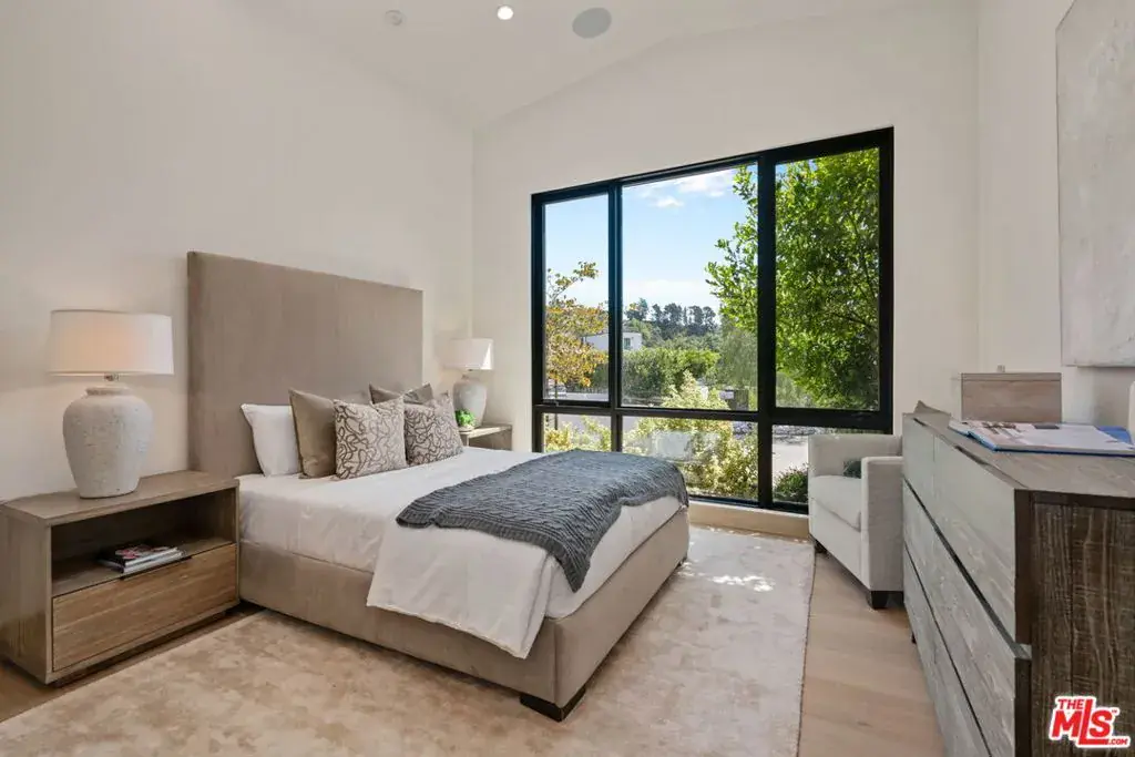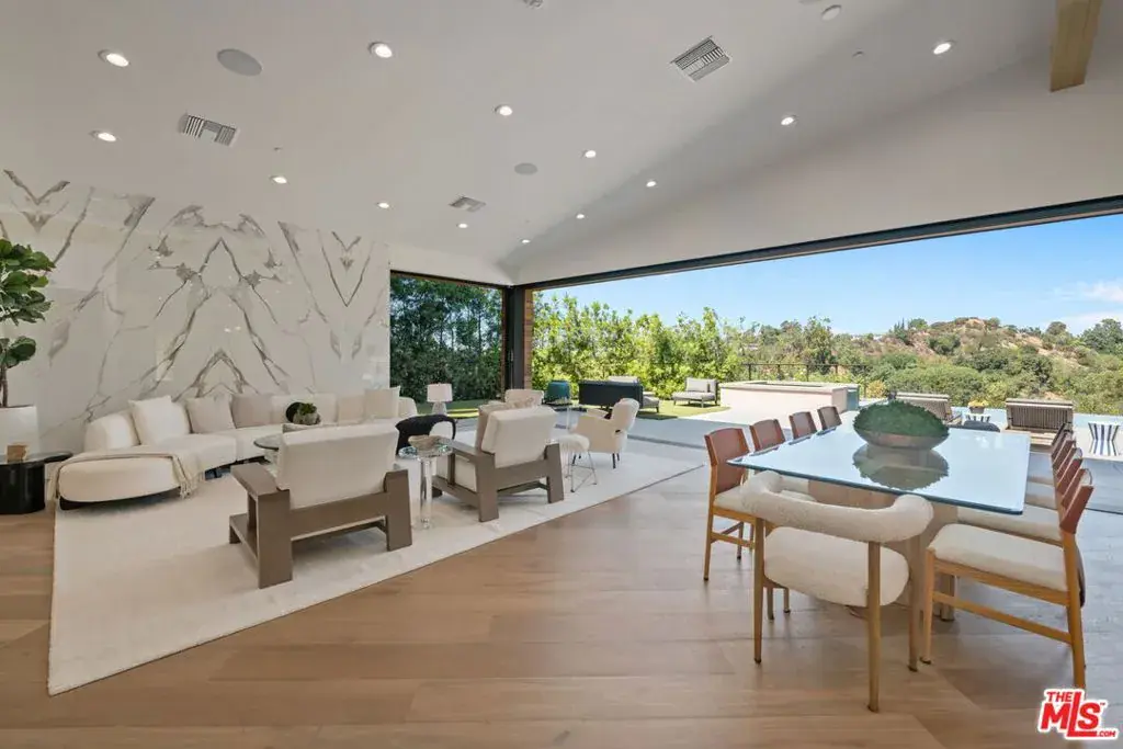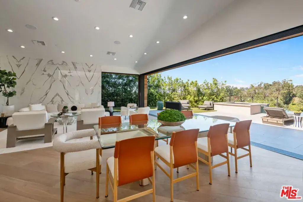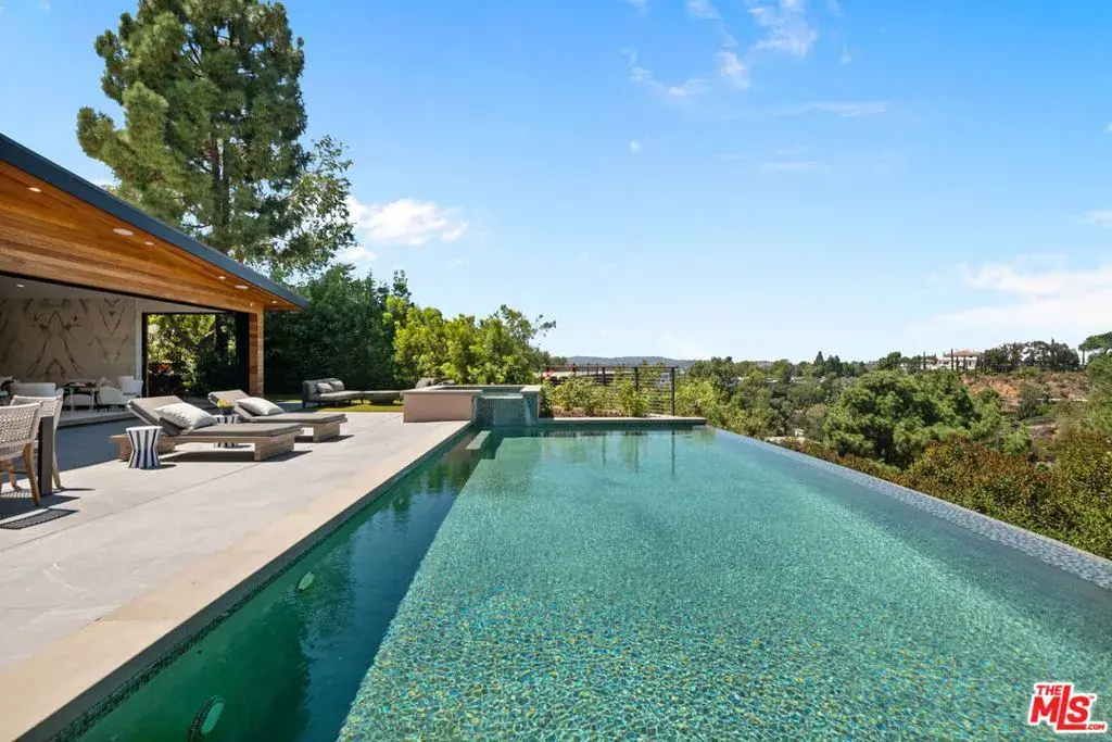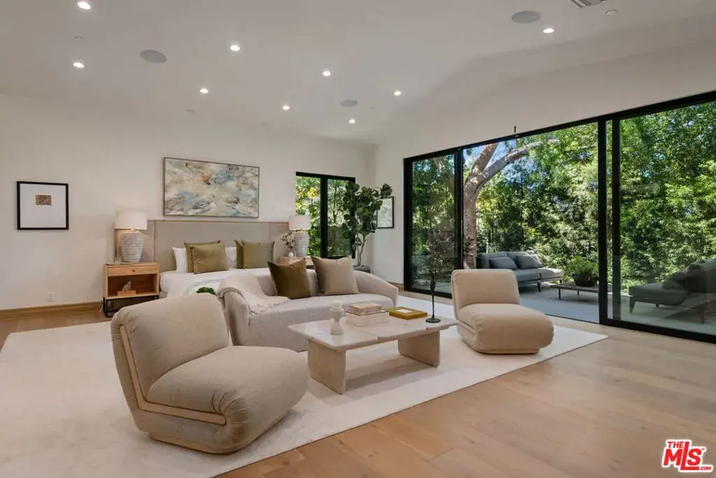 A brand-new single-story masterpiece, perfectly situated on a quiet cul-de-sac just north of the prestigious Trousdale Estates. Surrounded by beautiful trees and serene canyon views, this contemporary residence offers an exceptional blend of luxury, comfort, and sophistication. Designed with a seamless open floor plan and effortless indoor-outdoor flow, the living room boasts floor-to-ceiling automated sliding glass doors that open to a private backyard oasis with an infinity pool, spa, and waterfall. The expansive great room unites the living, dining, and chef’s kitchen, featuring Miele appliances, dual sinks and ovens, two dishwashers, built-in espresso/coffee maker, microwave, and a refrigerator and freezer. A generous island and elegant European wood floors enhance the home’s refined design. Offering 6 ensuite bedrooms and 9 bathrooms, the home provides unparalleled comfort for both family and guests. The media room, complete with a wide electric fireplace can be closed for privacy or opened to the main living area. The grand primary suite is a sanctuary, featuring a cozy seating area, private patio, and a stunning pearl onyx double-sided fireplace. It is complemented by two luxurious bathrooms with a soaking tub and steam shower complete this extraordinary retreat. Additional highlights include a temperature-controlled glass wine room, Sonos Arc sound system, and the finest finishes throughout. A true entertainer’s dream, this residence exemplifies modern luxury at its finest.