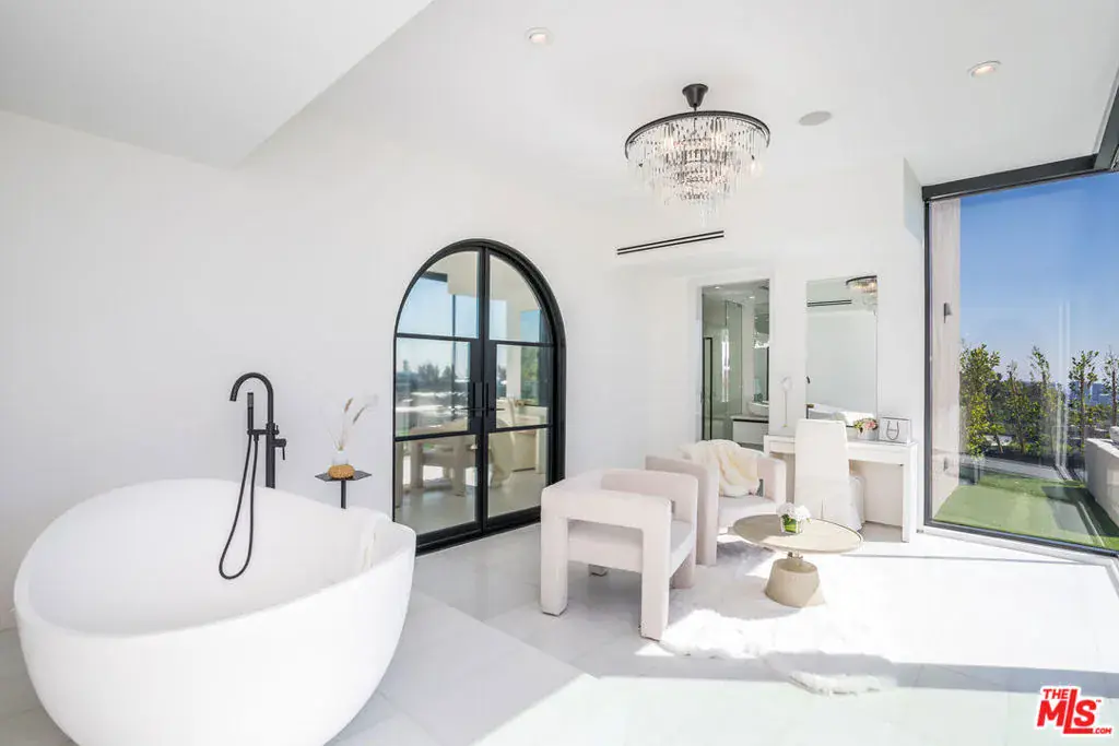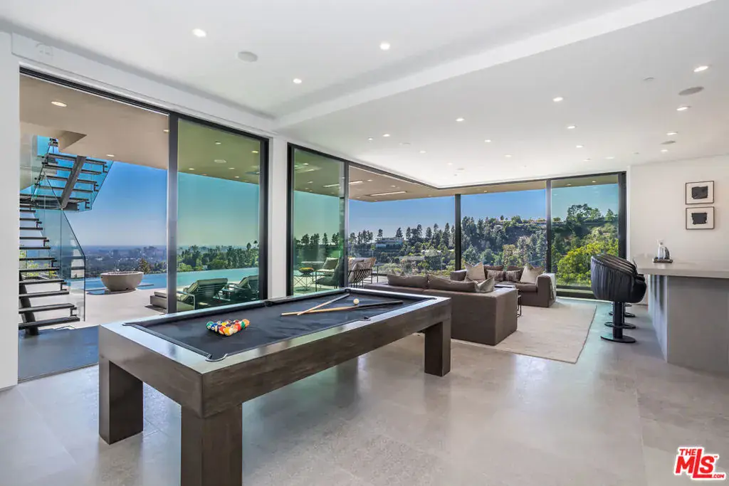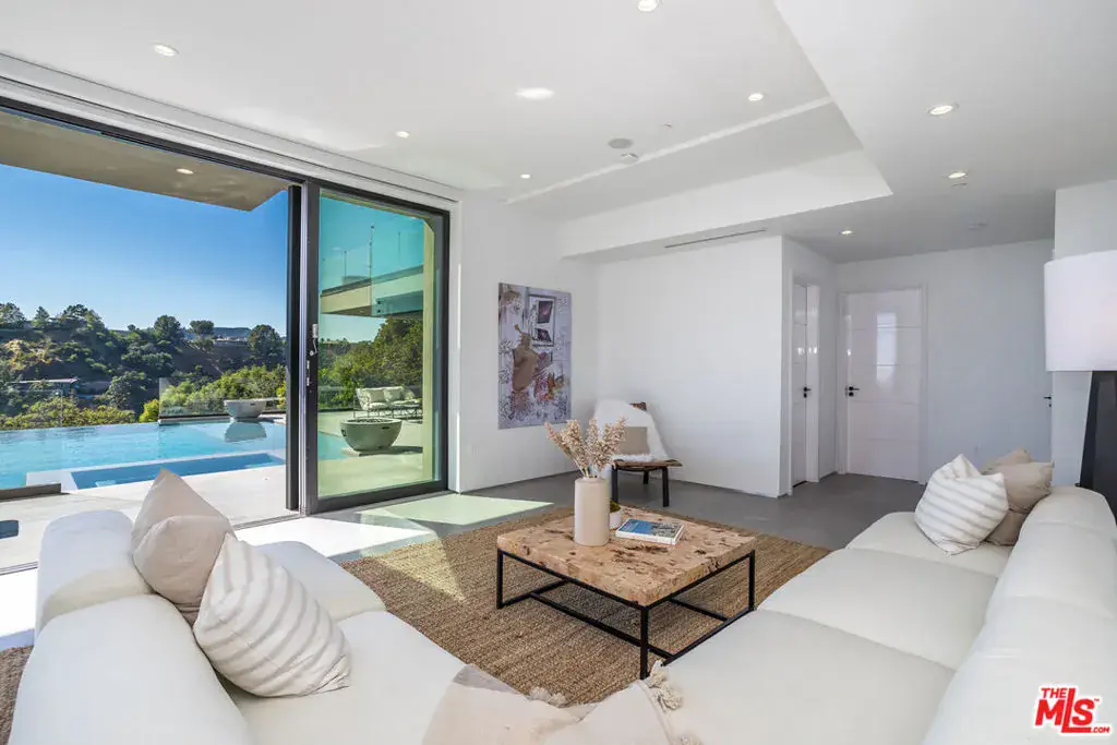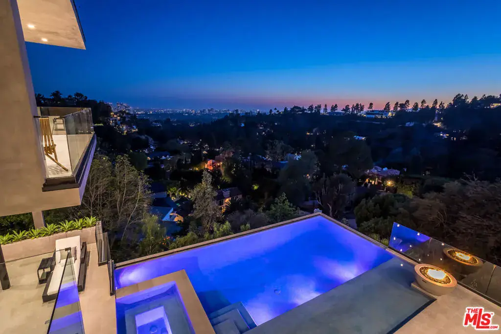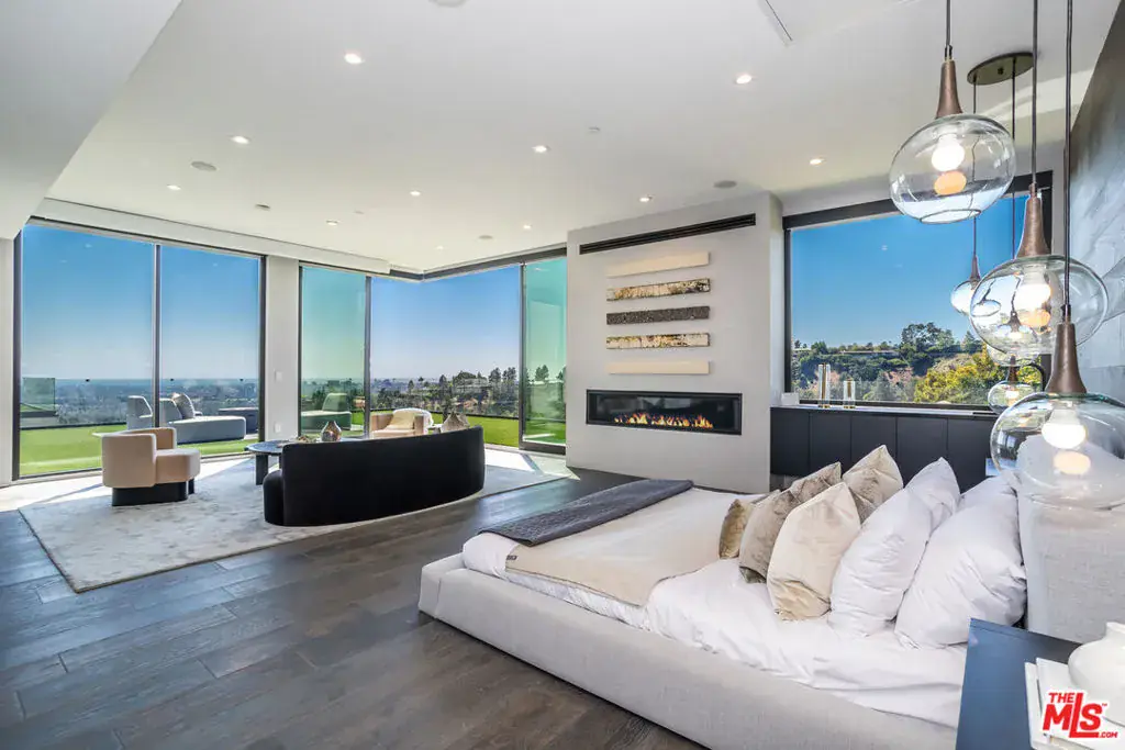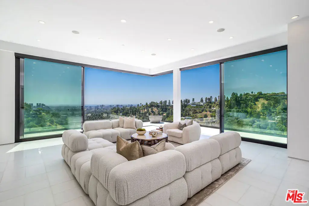 Available 6/1/26 – 9/30/26 furnished. Located in the prestigious Crest Streets in Beverly Hills, this architectural masterpiece offers unobstructed jetliner views from every room. The new construction smart house features Venetian wall finishes throughout, imported stonework, floor-to-ceiling walls and doors of glass, and over 3,400 sq. ft. of outdoor terraces, creating an unprecedented living experience. The 2,000 sq. ft. primary suite boasts a private glam room, hair salon, 2 garden lounge sitting areas, dual walk-in closets, wet bar, and glass shoe display room. The gourmet kitchen comes replete with a butler kitchen and pantry area. The sophisticated living and dining area is accentuated with a fingerprint-secured Mezcal/Wine tasting room. The lower entertainment level offers a luxurious bar, spa and theatre experience, including a zero-edge pool, Himalayan salt sauna, Japanese soaking tub, private yoga studio/gym, Tonal fitness system, wet steam room, poolside cabana room, and 20 person theater with bar. The private lower grassy yard is surrounded by lush landscaping and includes a large entertainment game space.